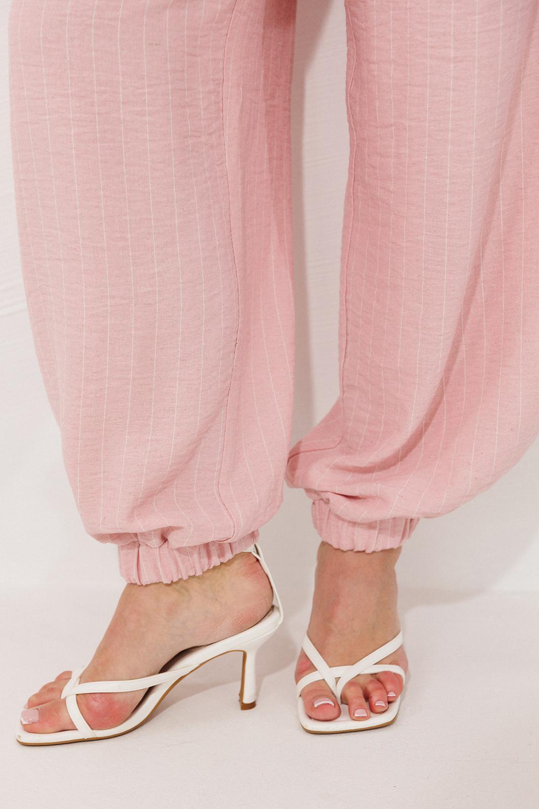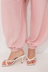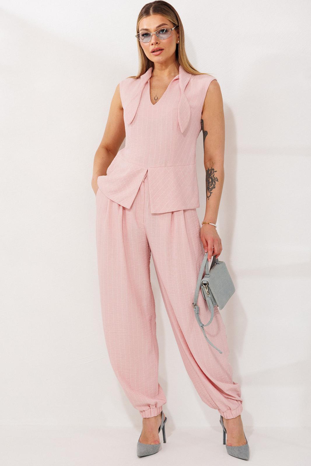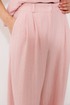 Брюки-алладины парят в воздухе. С высокой посадкой и мягкими складками от пояса по переду, они создают благородный напуск, словно шальвары. Пояс плотно сидит на талии благодаря притачному поясу со шлёвками и частичной резинке сзади — в движении брюки не сползают, но дышат вместе с вами. Спереди — объёмные карманы с отрезным бочком, куда так удобно спрятать руки или ракушку с пляжа. Главная деталь - низ, стянутый широкими манжетами с резинкой внутри; они собирают штанину в мягкое «облачко», открывая щиколотку, а вытачки на задних половинках изящно облегают фигуру, не добавляя лишнего объёма.