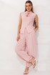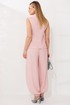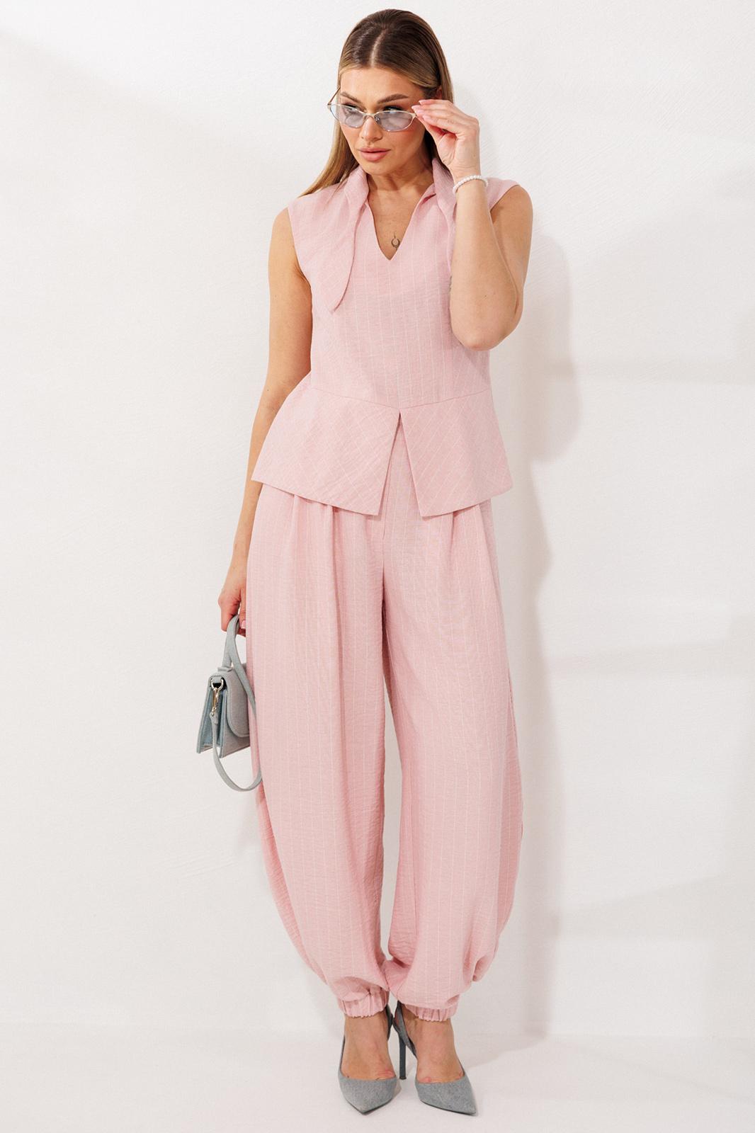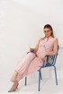 В этом костюме чувствуется дыхание жарких стран и лёгкость творческого беспорядка. Натуральная ткань под лён, мягкая и фактурная, в неброскую полоску словно выбелена солнцем, а силуэт балансирует между расслабленным востоком и утончённой женственностью.
