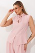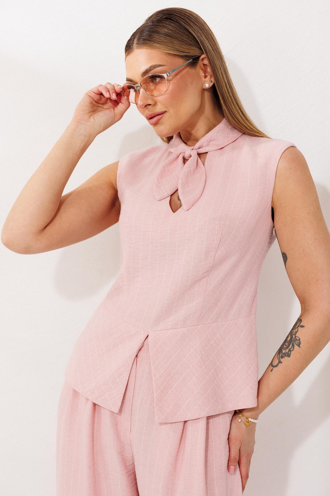 Блуза полуприлегающего кроя, с талёвыми вытачками, нежно обнимает фигуру, а слегка спущенное плечо и глубокий V-образный вырез дарят прохладу и открывают изящную линию шеи. По горловине струится стояче-отложной воротник, который, не замыкаясь, переходит в длинные фигурные завязки — их можно небрежно завязать бантом или остить свисающими, как шарф. Ниже талии блузу опоясывает двойная отрезная баска - она ложится мягкими волнами, скрывая линию соединения с юбкой или брюками, а разрез спереди добавляет интриги и свободы при движении. Молния аккуратно спрятана в левом боковом шве, а средний шов на спинке делает посадку безупречной.