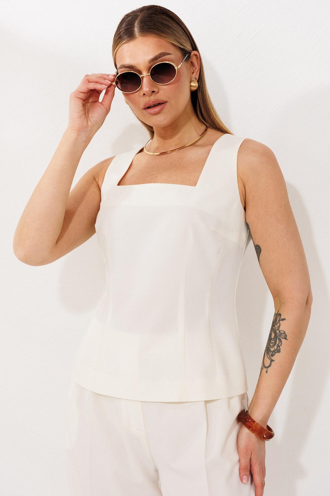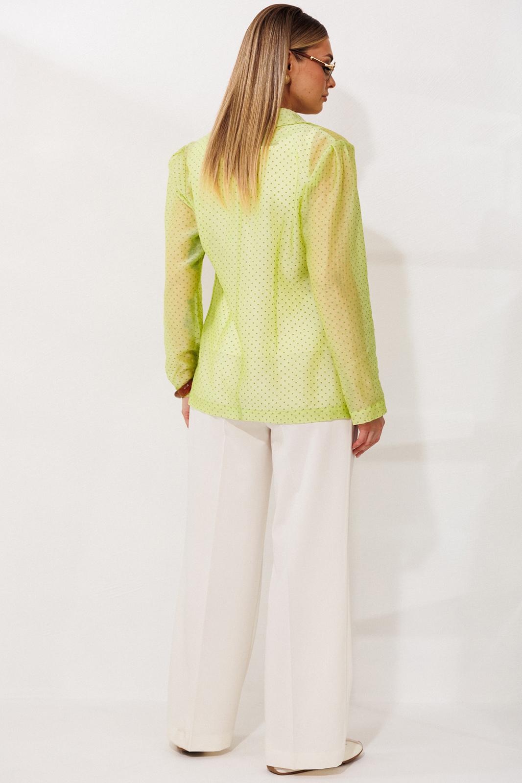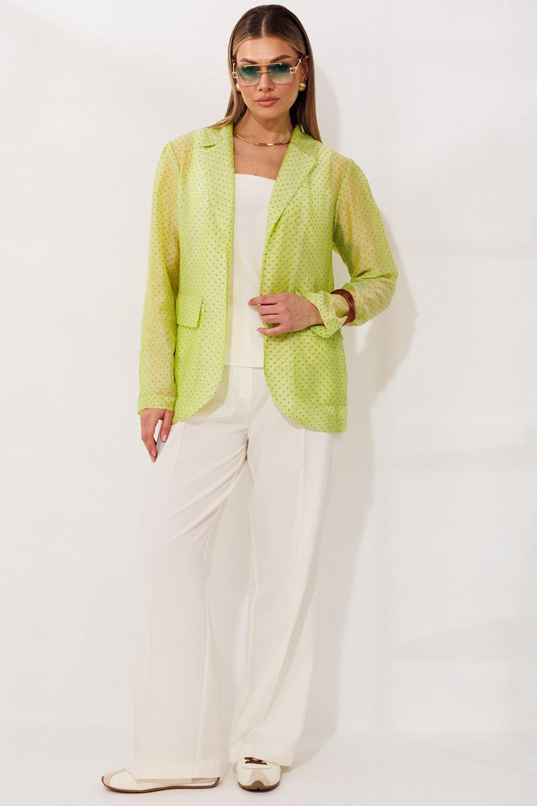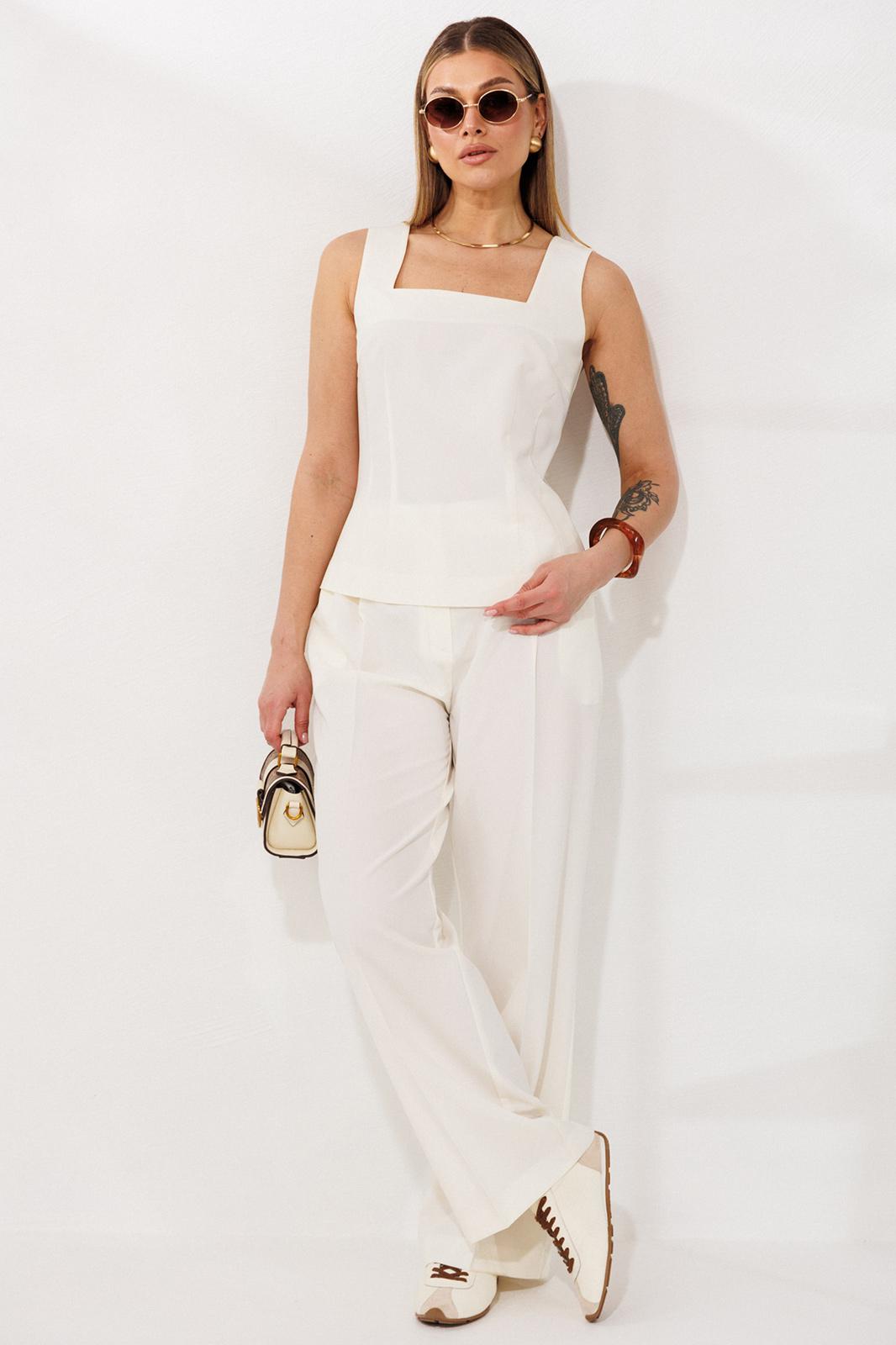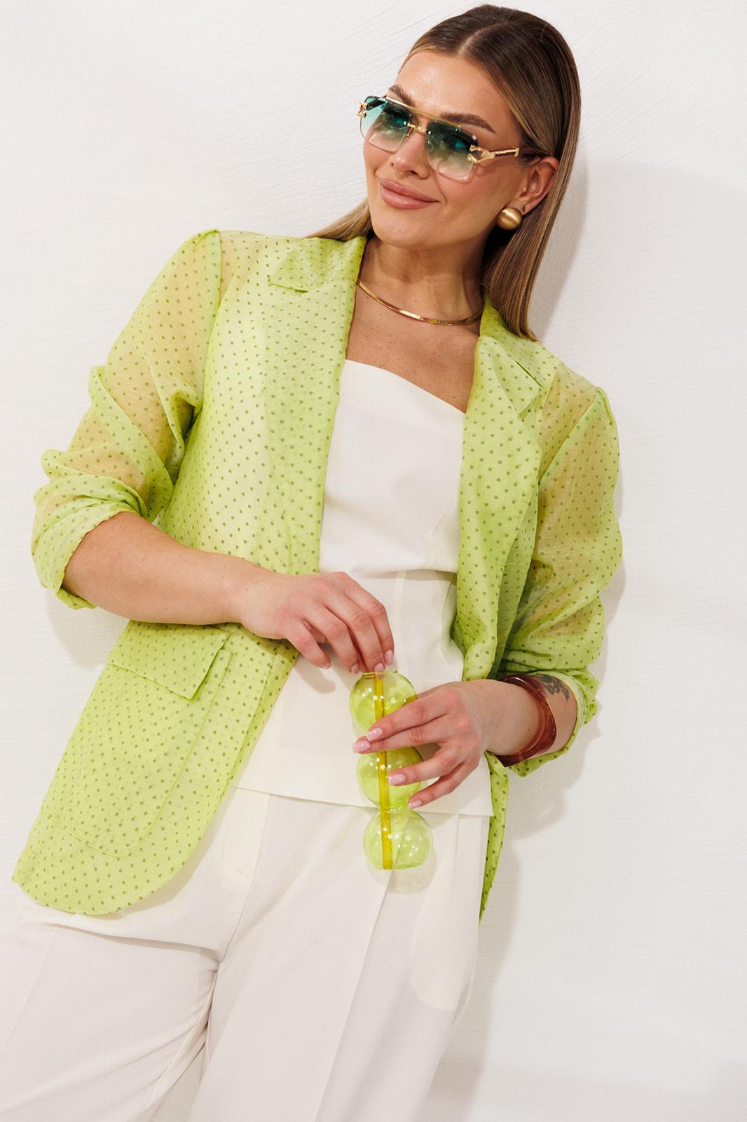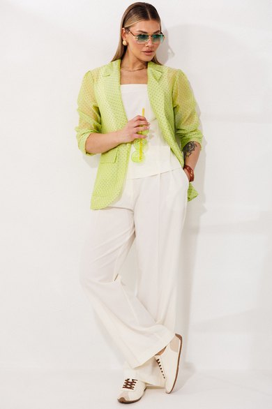 Комплект-тройка, состоящий из жакета, брюк и топа. Жакет выполнен из тонкой, прозрачной вуали свободного кроя без застежки по борту. Воротник английский, рукава по окату с небольшими складками, линия плеча слегка спущена. Рукав можно носить как длинным, так и с небольшим подворотом по низу. По переду накладные карманы и клапаны. По спинке средний шов и небольшие талиевые вытачки. По переду отрезной бочок. Топ из текстильной ткани, с укороченной линией плеча и расширенной горловиной. Горловина спинки и переда углубленные и квадратной формы. Спинка и перед с талиевыми вытачками для придания приталенного силуэта. По спинке застежка на потайную молнию. Брюки прямые, свободного кроя, со складками по передним половинкам. По бокам карманы хулиганы. Пояс со шлевками и резинкой по задним половинкам брюк. Застежка по переду на молнию и пуговицу.