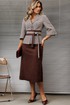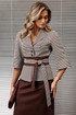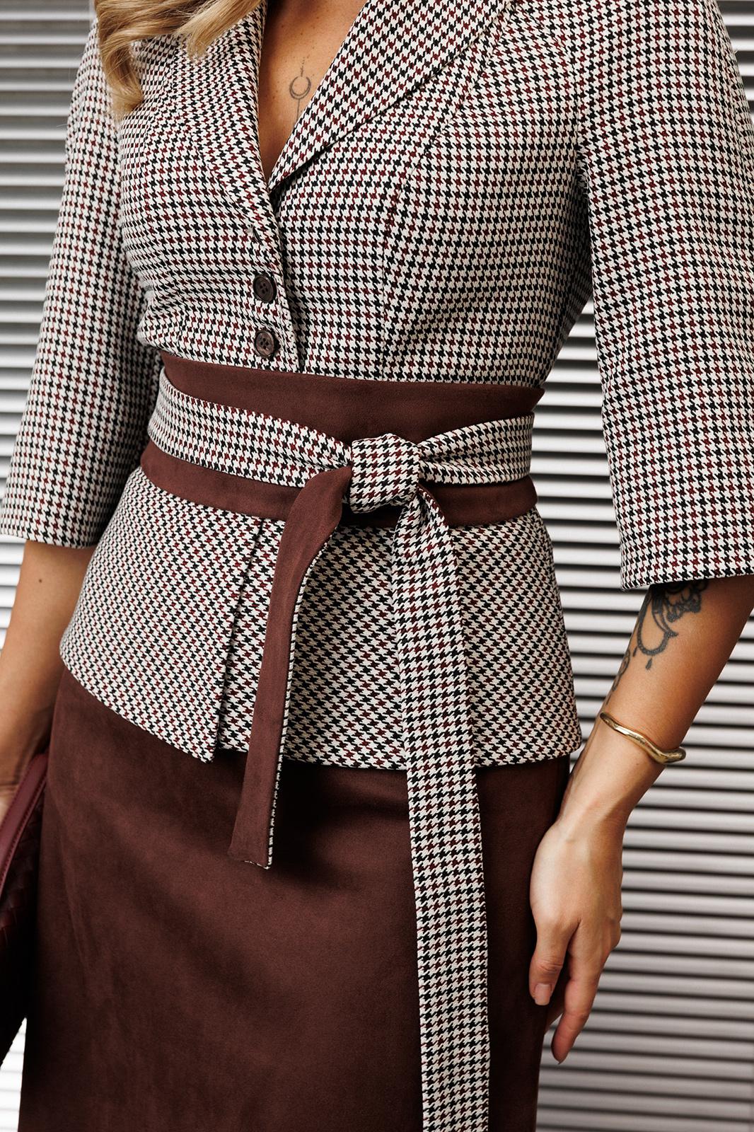 Бестселлер нашей коллекции - двухпредметный костюм, состоящий из жакета и юбки. Акцентом данного комплекта является съемный пояс. Для создания данного образа мы использовали мелкую клетку в тандеме с экокожей.Жакет прилегающего силуэта с отрезной баской по переду и спинка с рельефами. Рукав-реглан. Юбка А-силуэта на притачном поясе, сзади с резинкой. Застежка на тесьму-молнию в боковом шве. Костюм на подкладке.