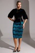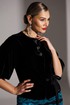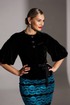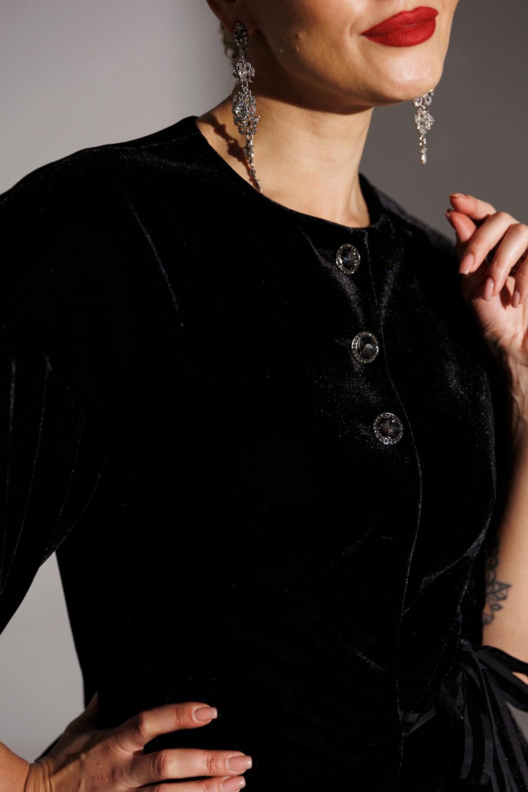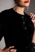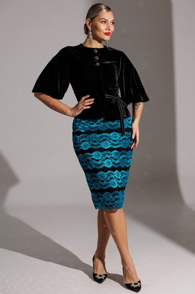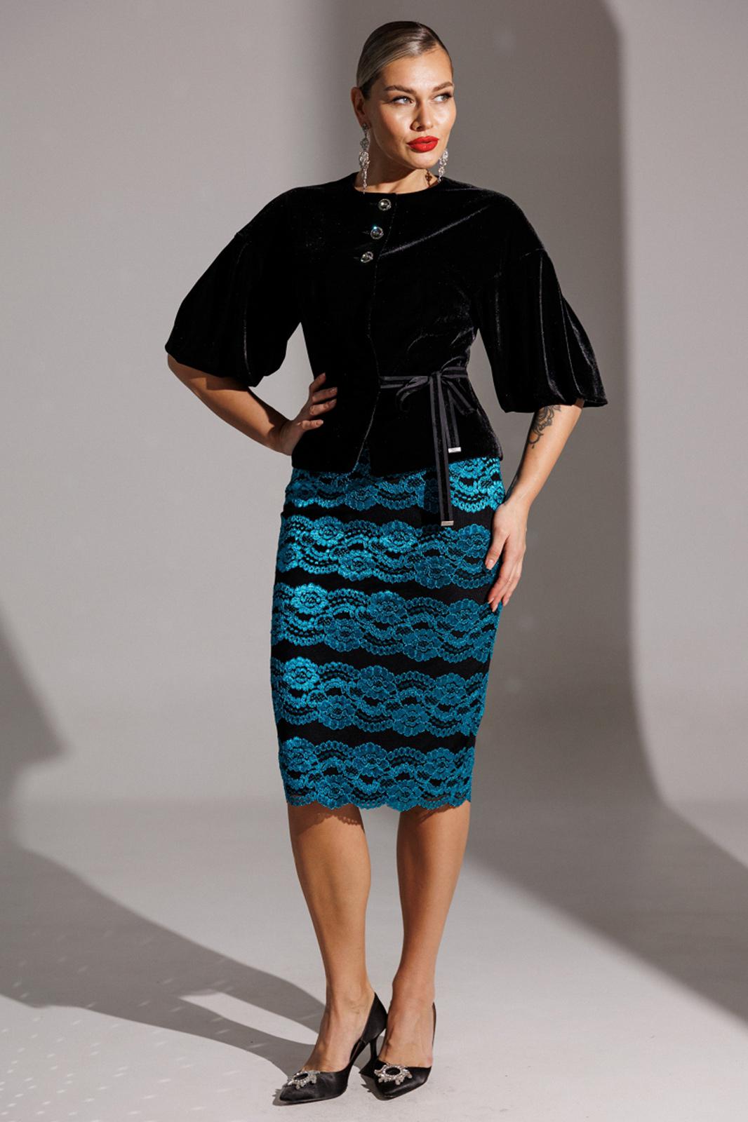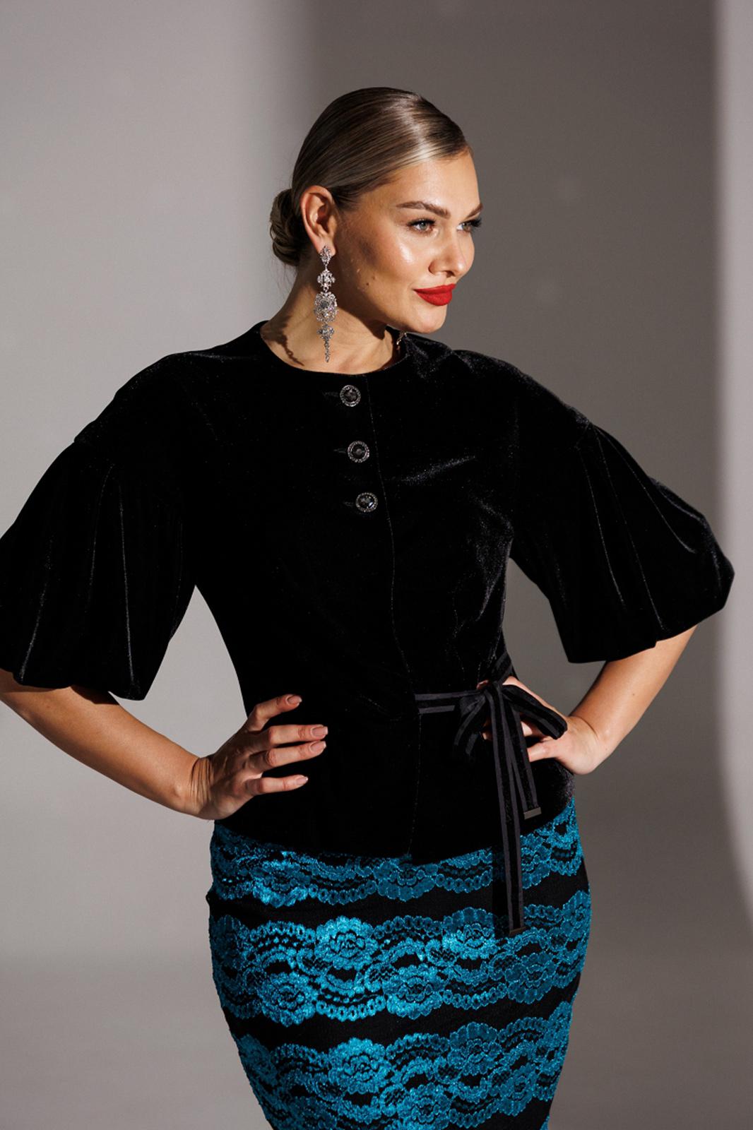 Нарядный комплект, состоящий из жакета и юбки. Комфортный жакет из велюра полуприлегающего силуэта с центральной комбинированной застежкой на 3 пуговицы и 3 потайные кнопки. Спинка со средним швом и талиевыми вытачками. По переду также талиевые вытачки. Горловина округлой формы. Объемные фантазийные рукава со складками смягчают строгий силуэт. Декором выступают декоративные пуговицы и завязка на талии. Шикарная юбка из сетки с серебряным напылением заужена к низу. Молния и шлица в среднем шве. По талии кокетки. Костюм на подкладке.
