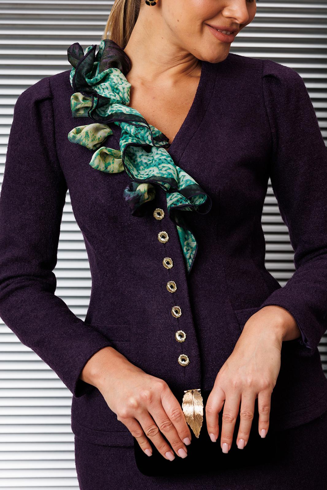 Что делает образ женственным и романтичным? Конечно же силуэты, подчеркивающие женскую фигуру, а также такие ткани как органза, шелк, шифон. Дизайнеры бренда предлагают Вам - жакет из шерсти со съемным шарфом . Данная модель смотрится очень стильно и женственно. Такой жакет может стать основой многих образов. Смело сочетайте его со своими праздничными и деловыми блузами. Жакет полуприлегающего силуэта. По переду и спинке с талиевыми вытачками, на полочках обработаны карманы. Спинка со средним швом. Рукава втачные, двухшовные, сверху по окату со складками. Застежка центральная на петли-пуговицы. Жакет декорирован съемным шарфом, нижняя часть которого застегивается на петли-пуговицы.