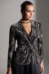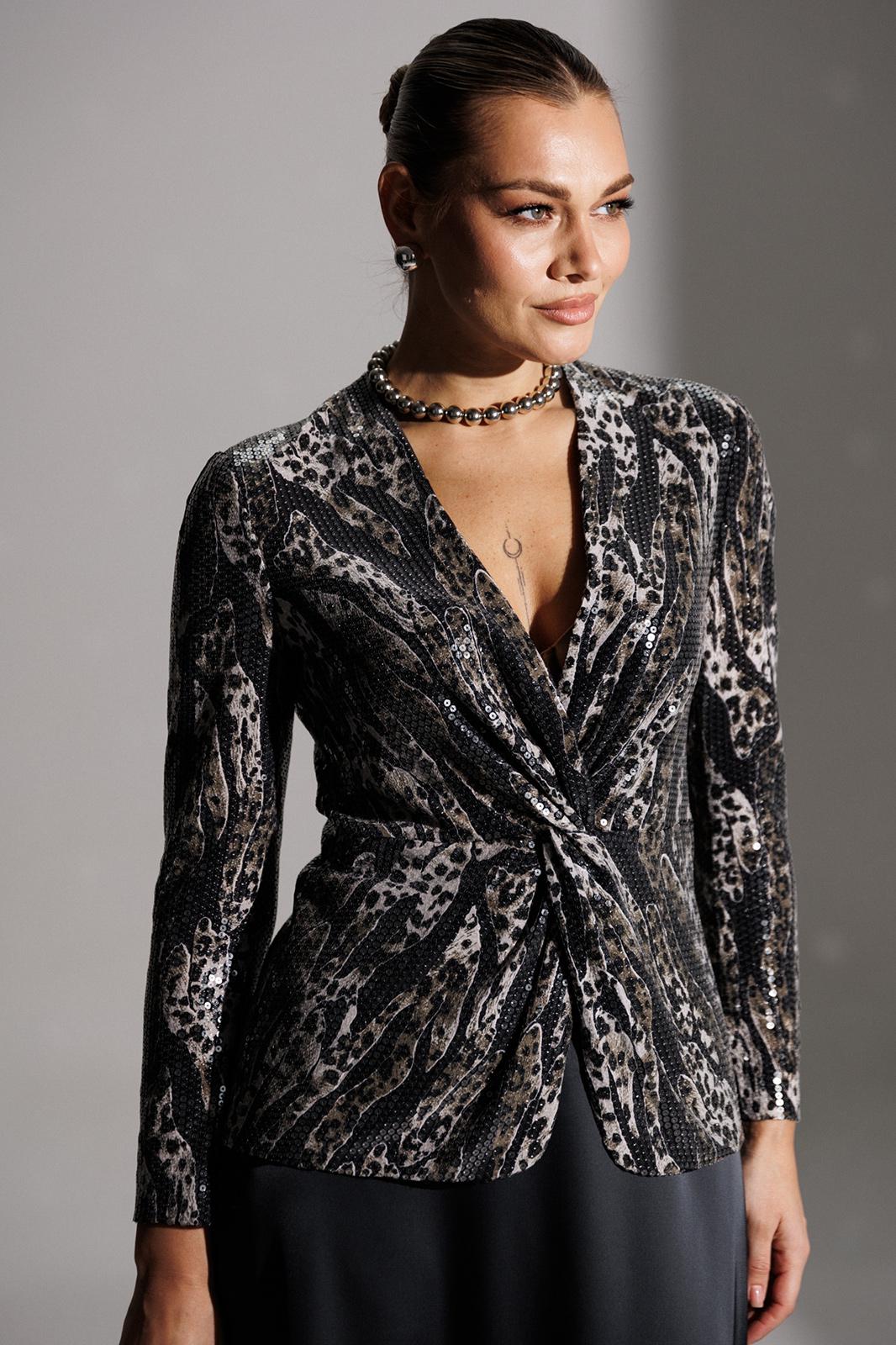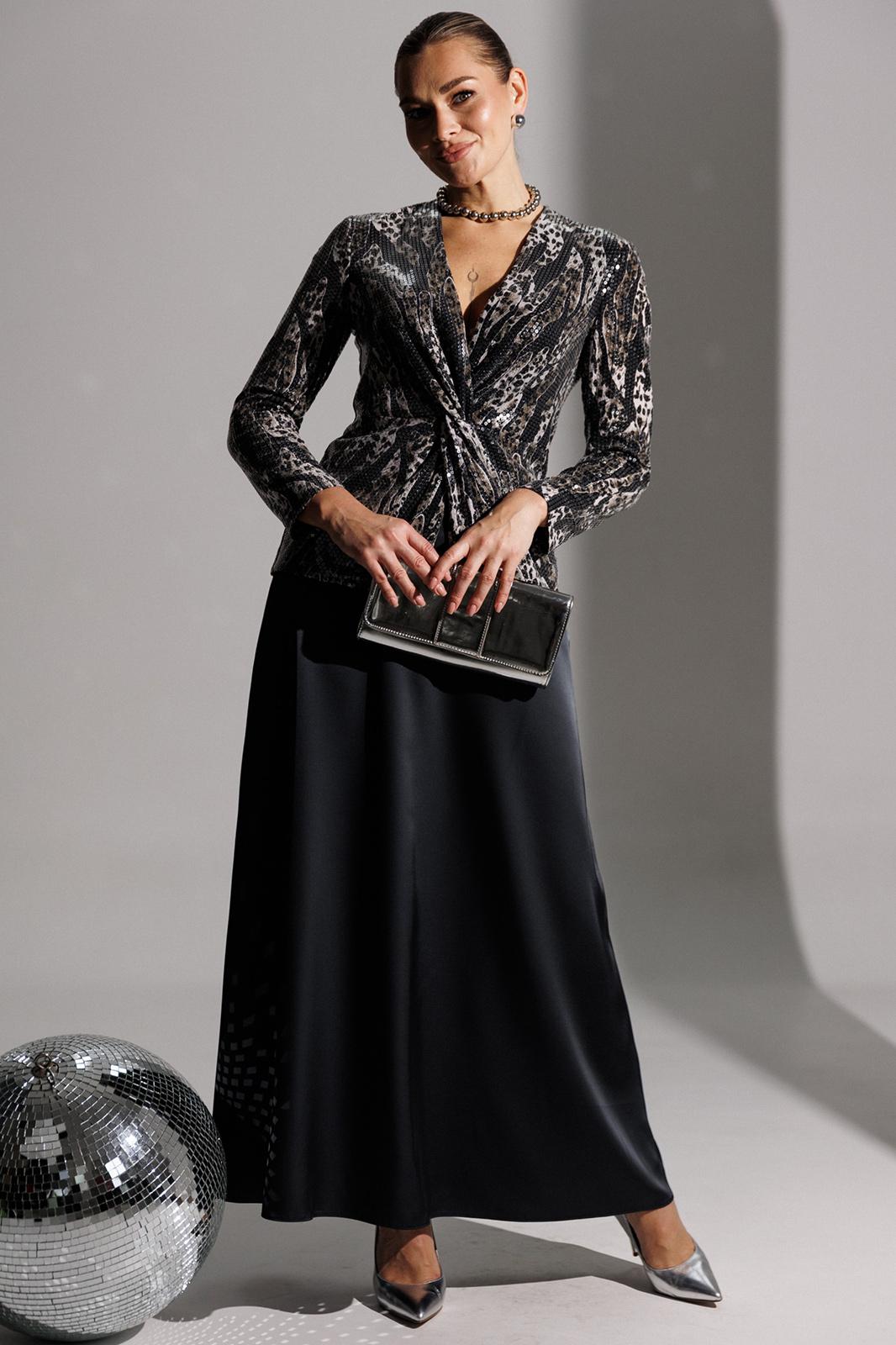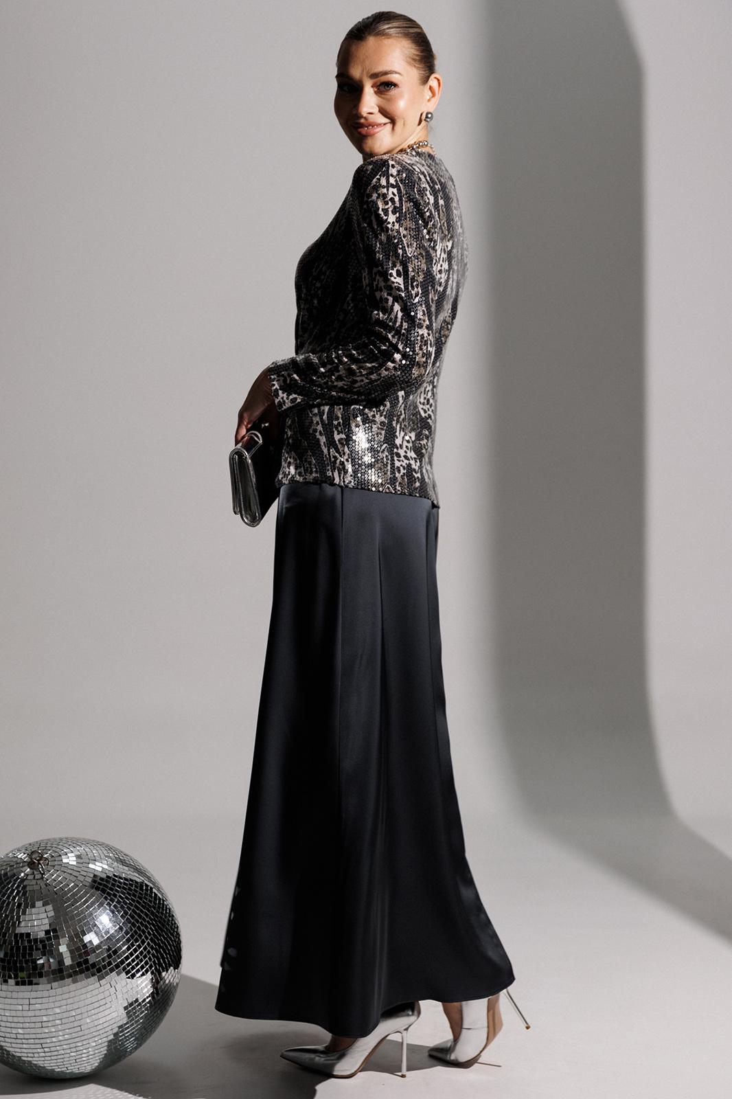 Продолжением нашей нарядной коллекции является роскошный комплект, состоящий из блузы, имитирующей жакет, и невероятной струящейся юбки из атласа длины макси. Блуза из ткани в пайетки с декоративным узлом в области талии. V-образный вырез. Блуза приталенного силуэта с втачными, двухшовными рукавами. Блуза частично на подкладке. Юбка на поясе с резинкой.