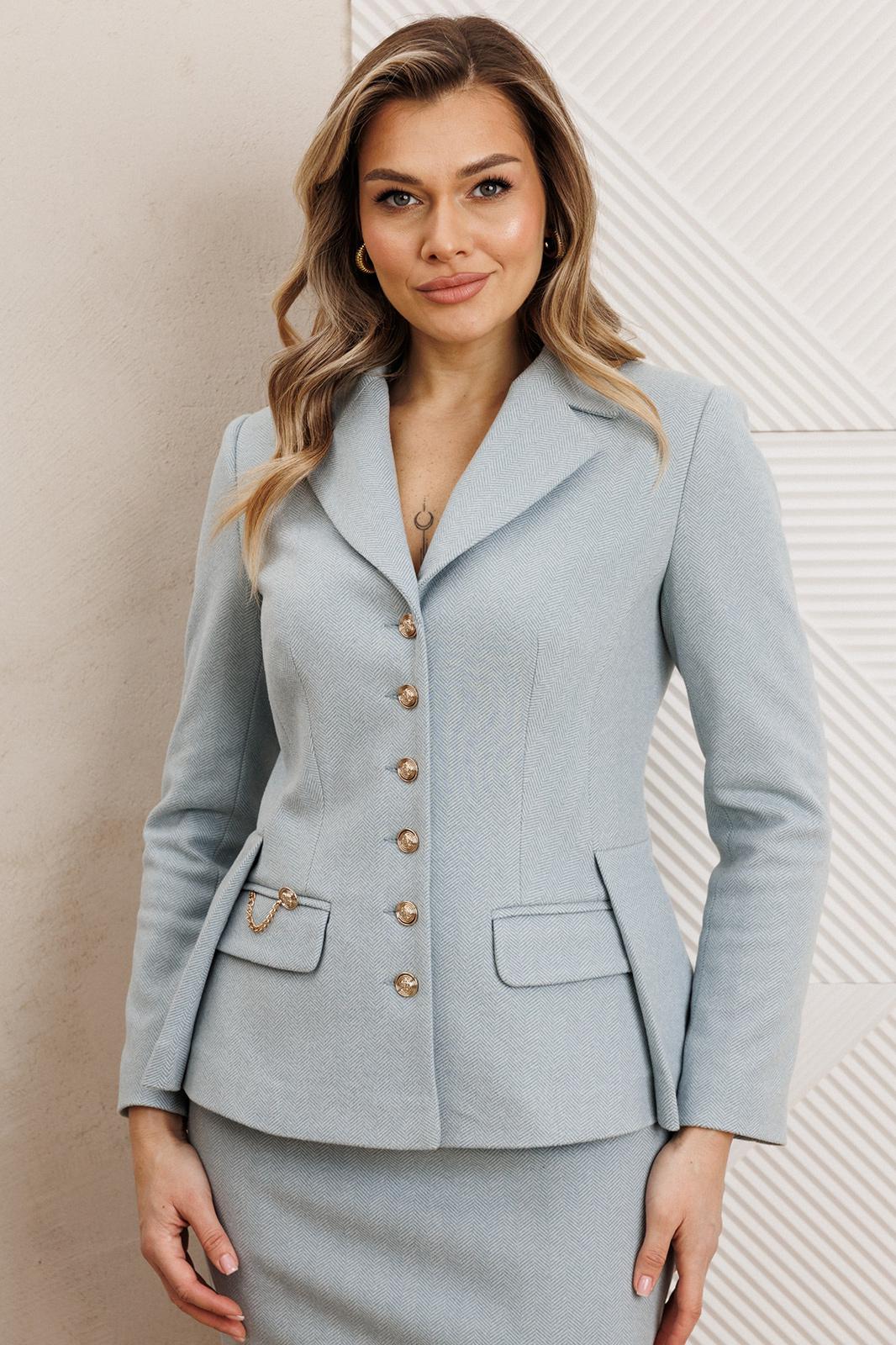 Жакет полуприлегающего силуэта с отрезной баской по линии бочка переда и спинке.