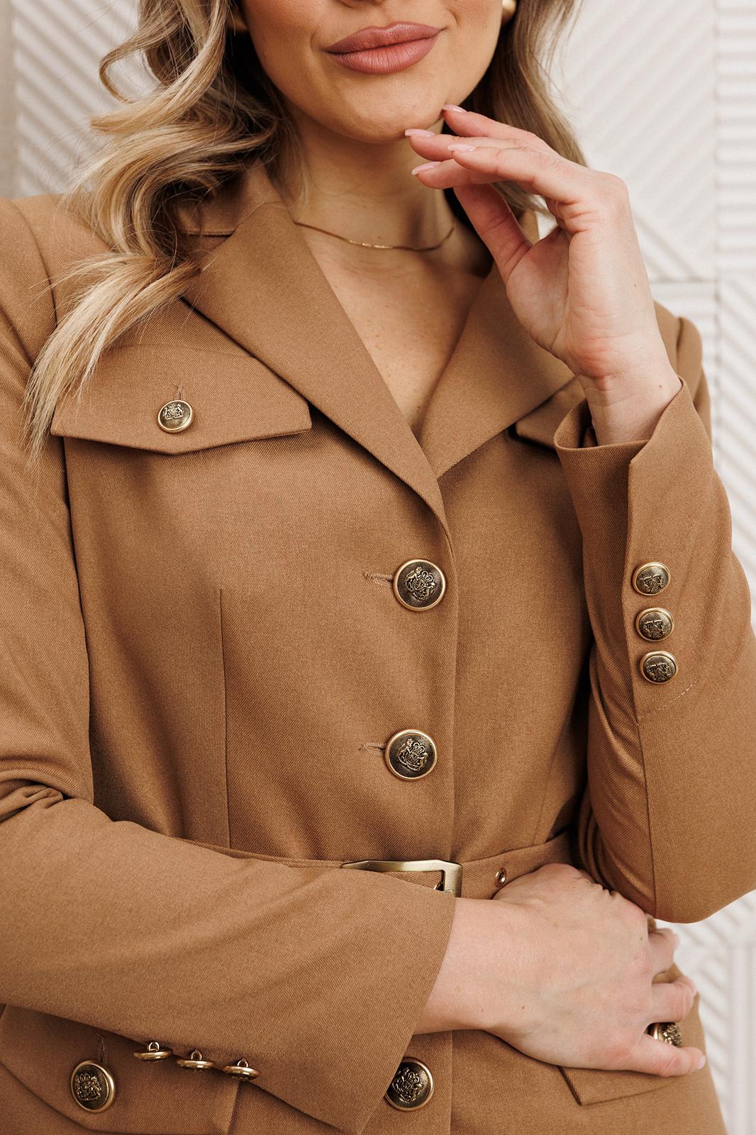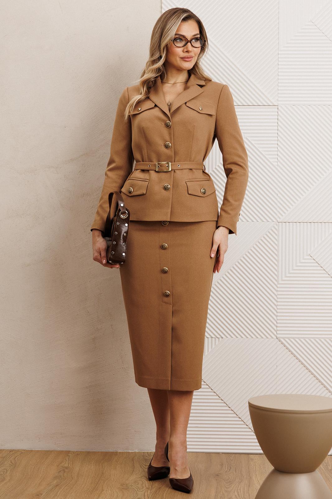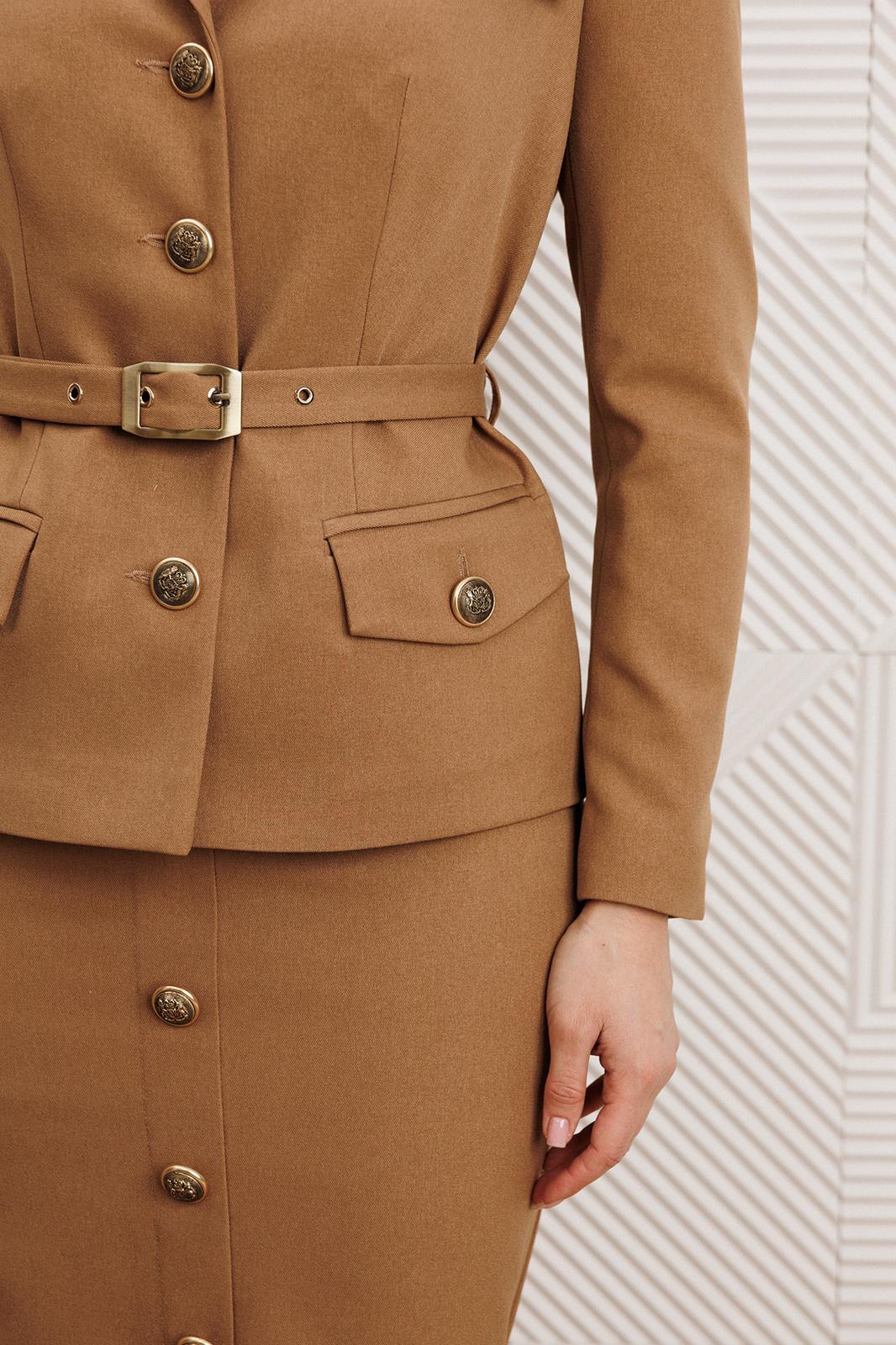 Жакет полуприлегающего силуэта с центральной застежкой на петли-пуговицы. Спинка со средним швом. По переду – талиевые вытачки, карманы с клапаном и декоративные клапаны в области груди. Воротник пиджачного типа. Рукава втачные, двухшовные. Локтевой шов заканчивается отлетной шлицей с декором из ряда пуговиц. Жакет на подкладке. Жакет дополнен съёмным поясом с пряжкой.
