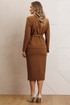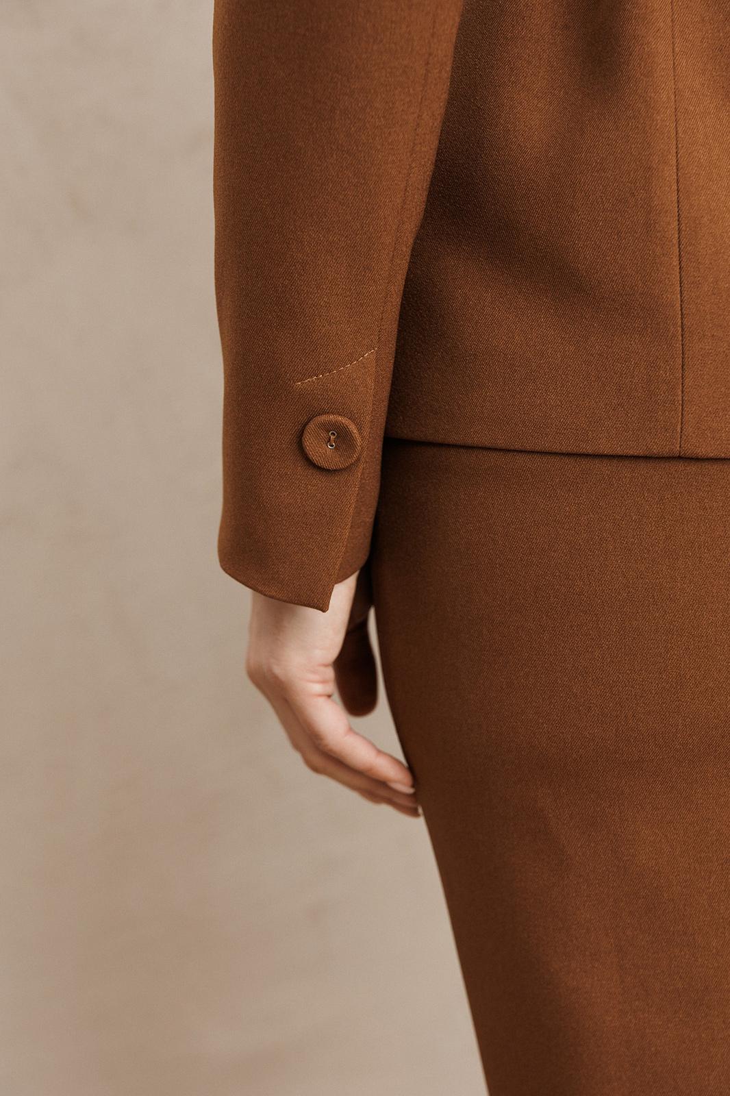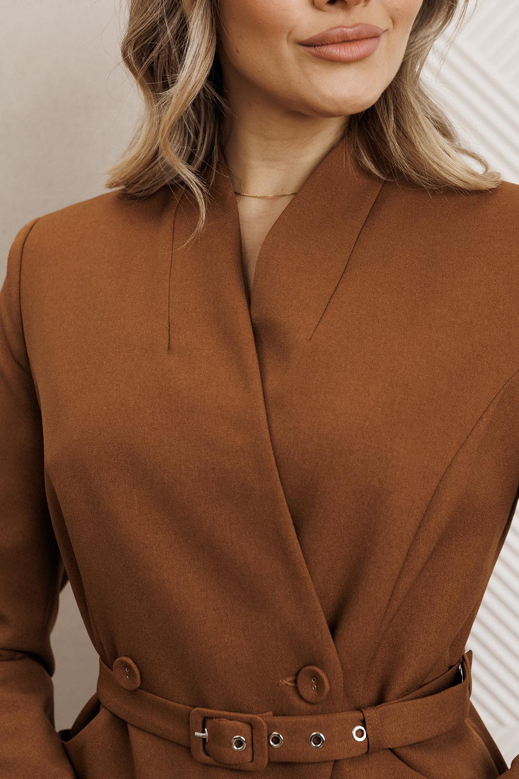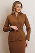 Представляем костюм женский двойку. Жакет полуприлегающего силуэта с двухбортной застёжкой на одну пару обтяжных, из основной ткани, пуговиц и одной потайной. Край борта фигурной формы, придающей динамичность жакету. На полочке выполнены фигурные рельефы, которые дополнены функциональными карманами, гармонично вписывающимися в общую структуру изделия. Спинка со средним швом и вертикальными рельефами из проймы. Воротник с цельнокроенной стойкой, что придает жакету элегантный и строгий вид. Рукава двухшовные, со шлицей в локтевом шве на одну пуговицу, также обтяжную из основной ткани. Жакет дополнен шлёвками и съемным поясом из основной ткани с пятью блочками на обтяжную пряжку, чем придает дополнительный акцент на талии.