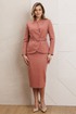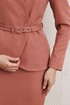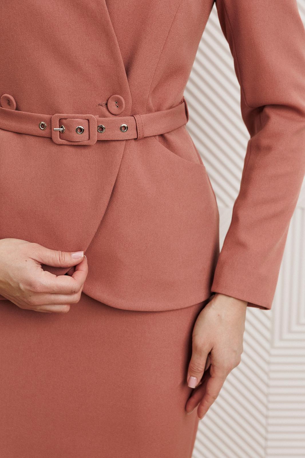 Представляем костюм женский двойку. Жакет полуприлегающего силуэта с двухбортной застёжкой на одну пару обтяжных, из основной ткани, пуговиц и одной потайной. Край борта фигурной формы, придающей динамичность жакету. На полочке выполнены фигурные рельефы, которые дополнены функциональными карманами, гармонично вписывающимися в общую структуру изделия. Спинка со средним швом и вертикальными рельефами из проймы. Воротник с цельнокроенной стойкой, что придает жакету элегантный и строгий вид. Рукава двухшовные, со шлицей в локтевом шве на одну пуговицу, также обтяжную из основной ткани. Жакет дополнен шлёвками и съемным поясом из основной ткани с пятью блочками на обтяжную пряжку, чем придает дополнительный акцент на талии.