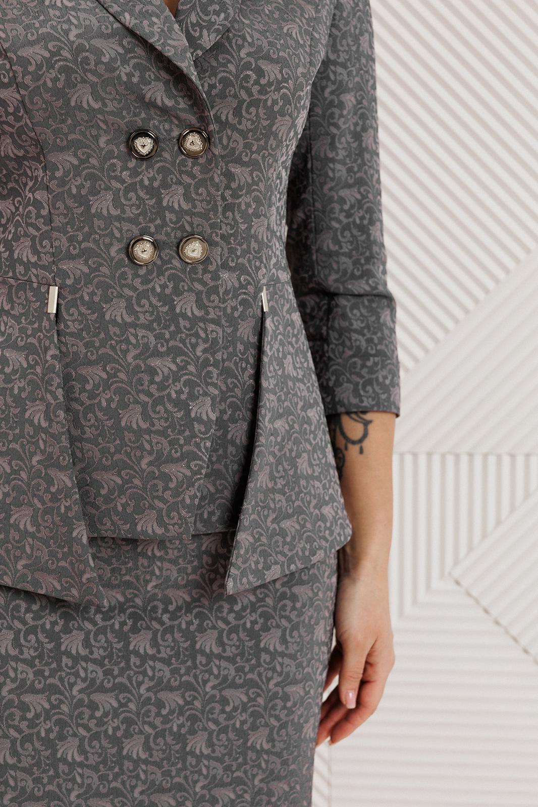 Что сделает комплимент Вашей фигуре? Правильный силуэт! Костюм от бренда Мода-Юрс подчеркнет все изгибы и достоинства Вашей фигуры. Жакет полуприлегающего силуэта с отрезной баской фигурной формы и воротником шалька. Перед с рельефами, выходящими из проймы. Спинка со средним швом. Рукав втачной, двухшовный. Юбка прямая, зауженная к низу, сзади со средним швом, переходящим в шлицу. Застежка на тесьму-молнию. Пояс притачной, по бокам с резинками. Жакет и юбка на подкладке.