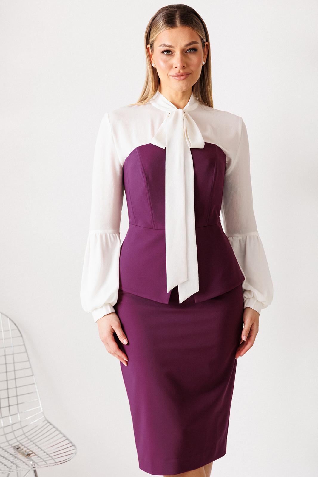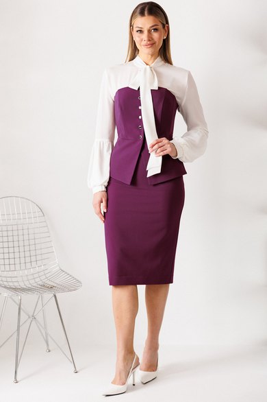 Этот нарядный костюм представляет собой элегантное и утонченное решение для особых случаев. Костюм состоит из корсета и юбки. Топ-корсет прилегающего силуэта с регилином по рельефам по переду и спинке, который обеспечивает дополнительную жёсткость и посадку на фигуре. Застёжка центральная бортовая на 6 петель и пуговиц. Низ переда фигурной заострённой формы, что подчёркивает элегантный силуэт. Модель идеально подходит для создания строгих, утонченных образов и может использоваться как в качестве элемента вечернего наряда, так и для повседневных образов с более нейтральными деталями. Наденьте его с нашей юбкой - это беспроигрышный дуэт, где игривость и строгость подчеркивают друг друга. Юбка прямая, зауженная к низу, сверху на притачном поясе. Застежка на тесьму-молнию в среднем шве, который переходит в шлицу. Костюм на подкладке.