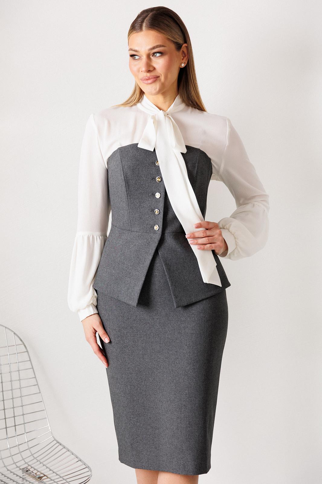 Этот нарядный костюм представляет собой элегантное и утонченное решение для особых случаев. Костюм состоит из корсета и юбки. Топ-корсет прилегающего силуэта с регилином по рельефам по переду и спинке, который обеспечивает дополнительную жёсткость и посадку на фигуре. Застёжка центральная бортовая на 6 петель и пуговиц. Низ переда фигурной заострённой формы, что подчёркивает элегантный силуэт. Модель идеально подходит для создания строгих, утонченных образов и может использоваться как в качестве элемента вечернего наряда, так и для повседневных образов с более нейтральными деталями. Наденьте его с нашей юбкой - это беспроигрышный дуэт, где игривость и строгость подчеркивают друг друга. Юбка прямая, зауженная к низу, сверху на притачном поясе. Застежка на тесьму-молнию в среднем шве, который переходит в шлицу. Костюм на подкладке.