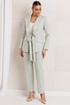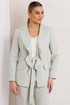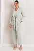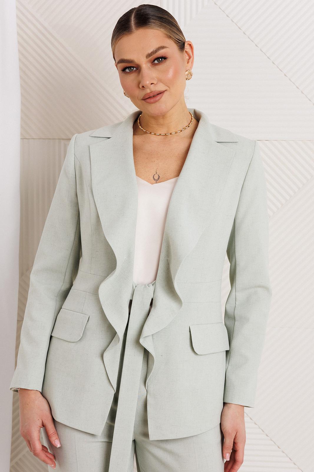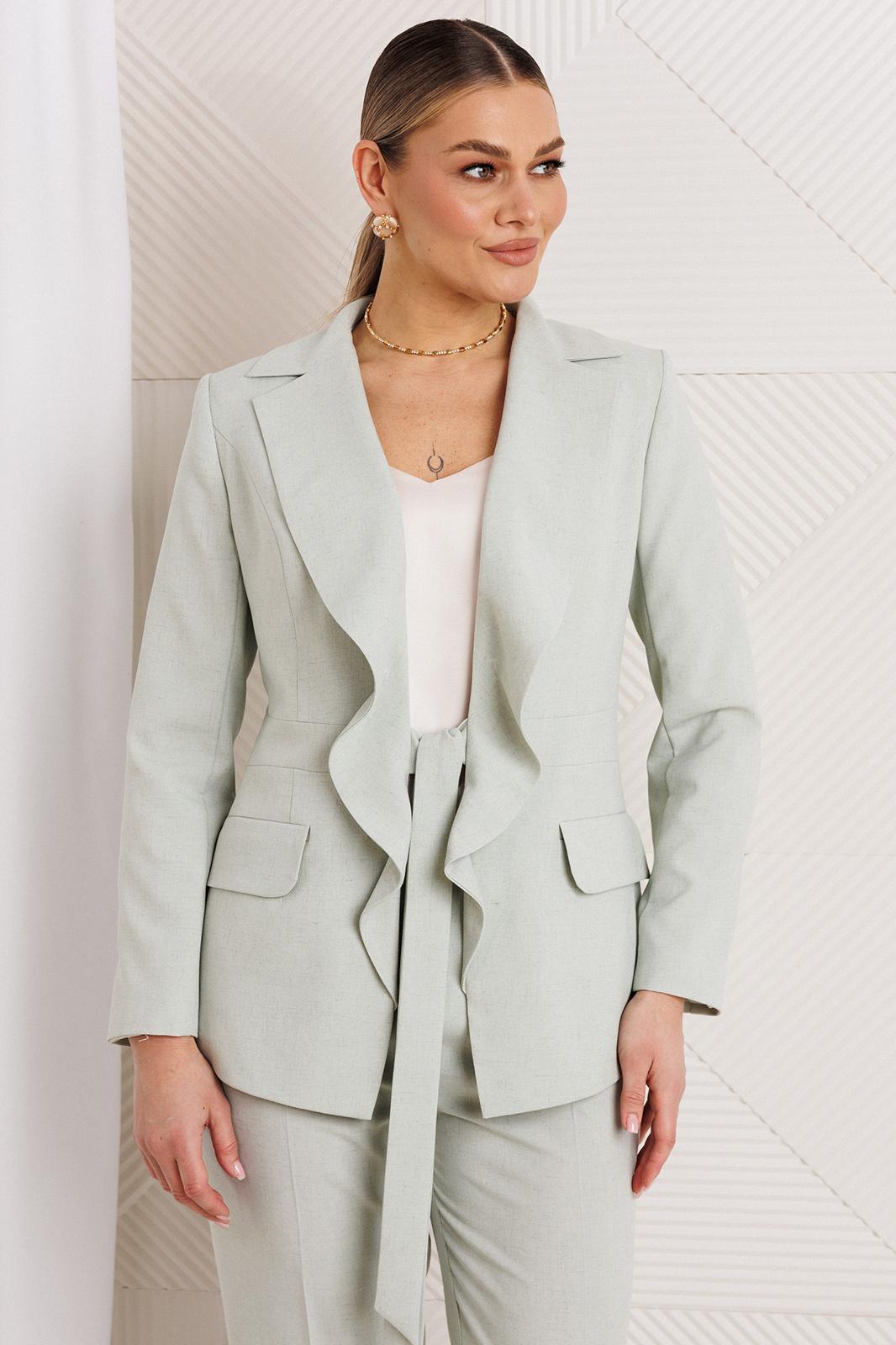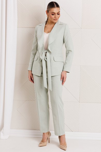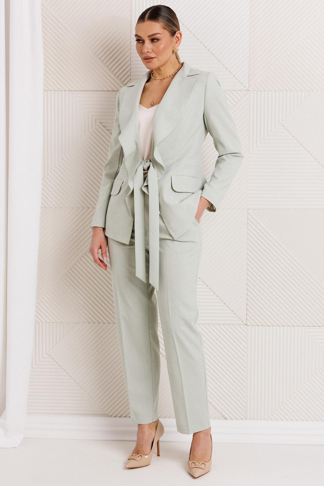Облегченный костюм из натуральной ткани — это идеальный выбор для стильных и комфортных вечеринок или встреч. Двухпредметный комплект, состоящий из жакета и брюк. Жакет полуприлегающего силуэта с рельефами по переду, выходящими из проймы, отрезной деталью по линии талии в виде пояса, прорезными карманами с листочкой и клапанами по нижней части переда. Воротник английский, фантазийный, с лацканами, переходящими в воланы и завязывающимися поясами по линии талии. По спинке средний шов и отрезные бочки, создающие полуприлегающий силуэт. Рукава втачные, двухшовные. Жакет на подкладке. Брюки укороченные и слегка зауженные к низу. По передней и задней половинке брюк заутюженные стрелки. Пояс - кокетка, создающий хорошую посадку брюк по линии талии, с застежкой на молнию и пуговицу.