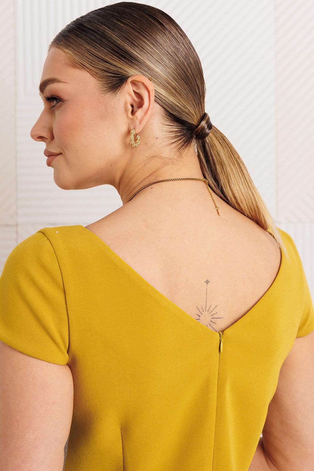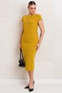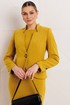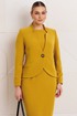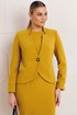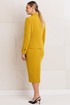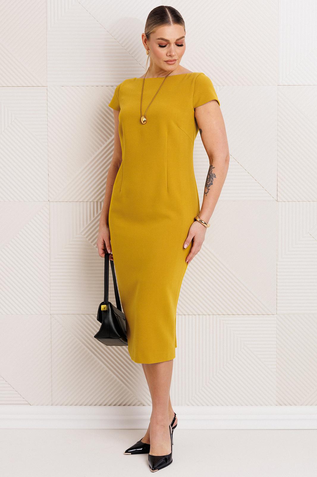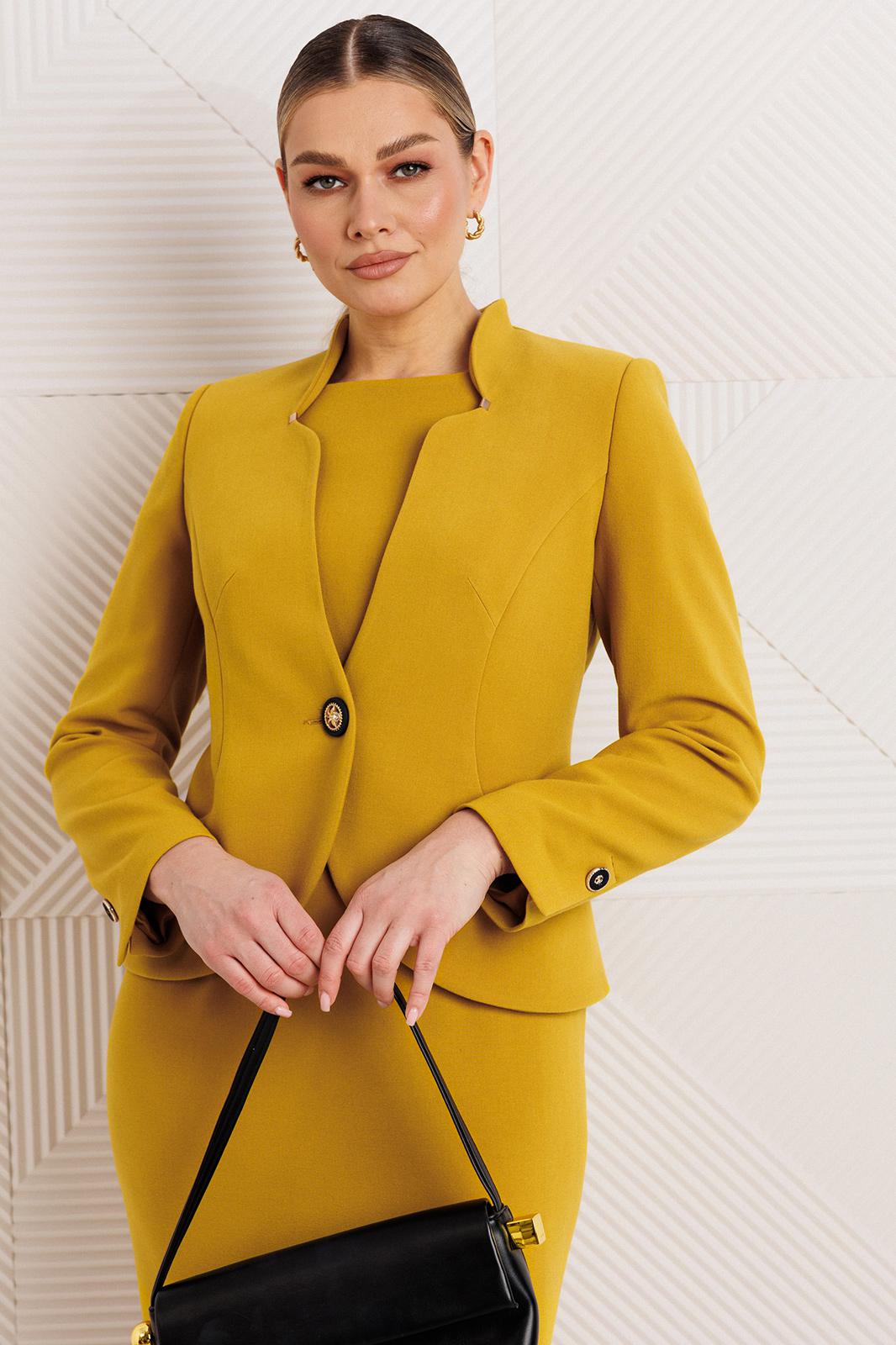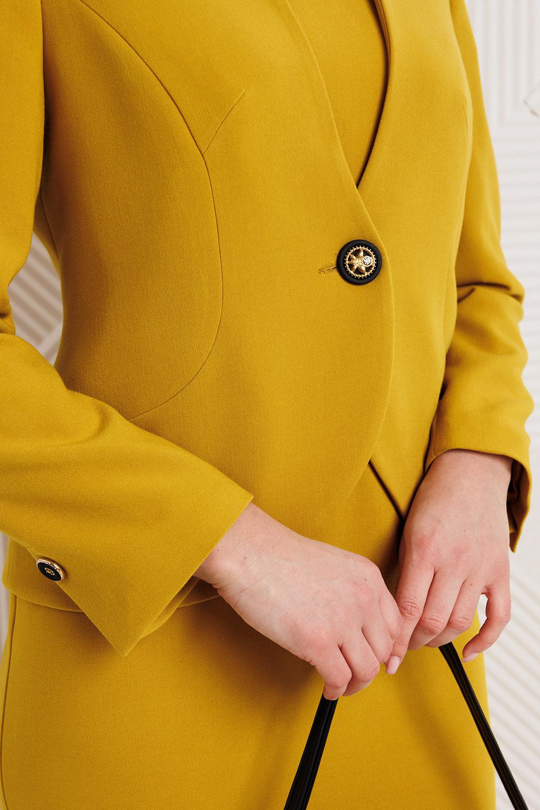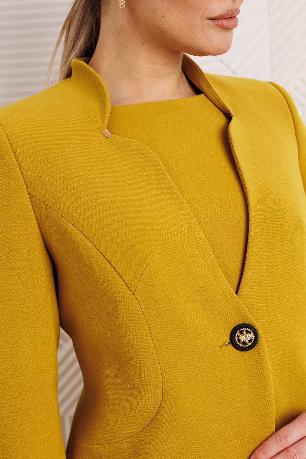 Изысканный двухпредметный костюм, состоящий из жакета полуприлегающего силуэта и женственного платья. Модель выполнена из мягкого костюмного полотна, которое дарит ощущение комфорта в течение всего дня.Жакет отличается продуманным кроем: фигурные рельефы, выходящие из пройм в боковые швы, моделируют силуэт. Центральная застежка на петлю и пуговицу дополнена закругленными бортами. Главный акцент — фантазийный вырез горловины с цельнокроеной стойкой по переду, элегантно зафиксированной стильными зажимами. Рукава — втачные, двухшовные, со шлицами на пуговицах. Жакет полностью на подкладке.Платье приталенного силуэта длиной ниже колена подчеркивает достоинства фигуры. Вырез «лодочкой» спереди и V-образный вырез на спинке открывают плечи. Короткие рукава-«крылышки» придают образу легкость. Для комфорта движений в среднем шве спинки предусмотрены шлица и потайная молния. Платье также посажено на подкладку.