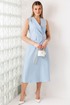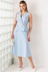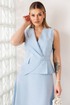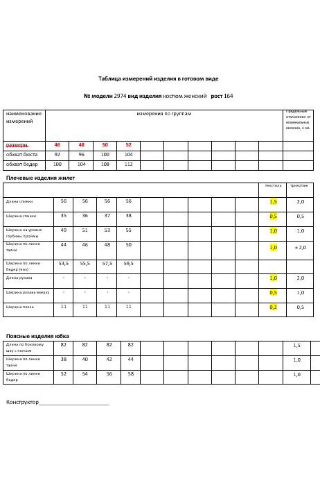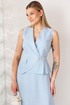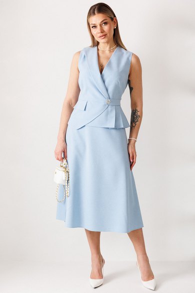 Летний костюм, состоящий из жилета и юбки. Жилет со смещенной застежкой на одну пуговицу и ассиметричный по построению. По линии талии по левой стороне пояс, который застегивается на пуговицу и удерживает правый край борта. В жилете отрезная баска по переду и спинке. Правая баска переда фигурной формы, левая баска переходит в складки. По правой стороне переда отложной лацкан и клапан с прорезным карманом. По спинке средний шов и талиевые вытачки. Юбка конусная, построенная на радиусе, имеет свободную и легкую форму. Пояс по боками на резинке. По заднему полотнищу застежка на потайную молнию и пуговицу.Жилет на подкладке.
