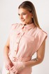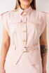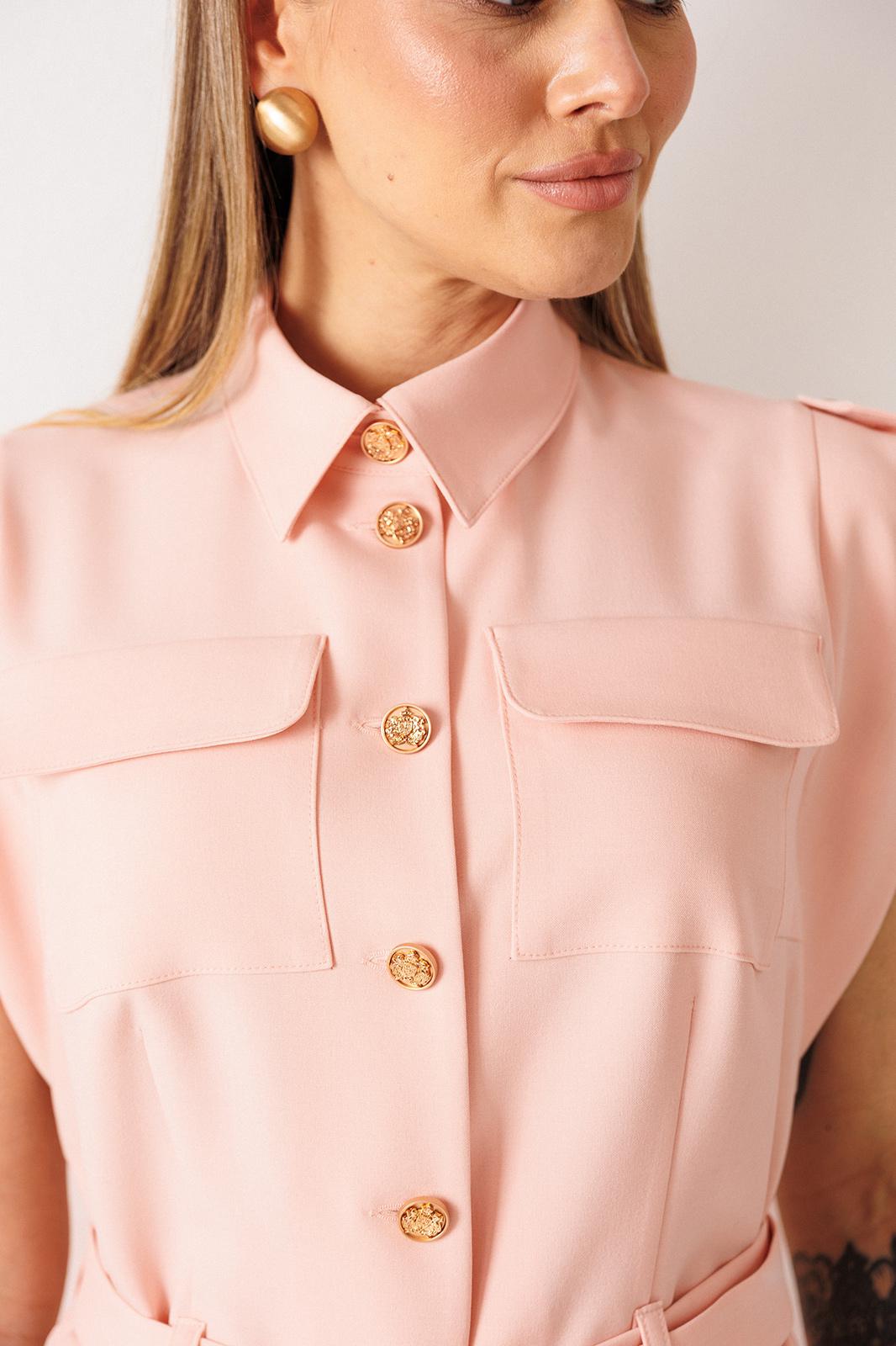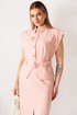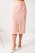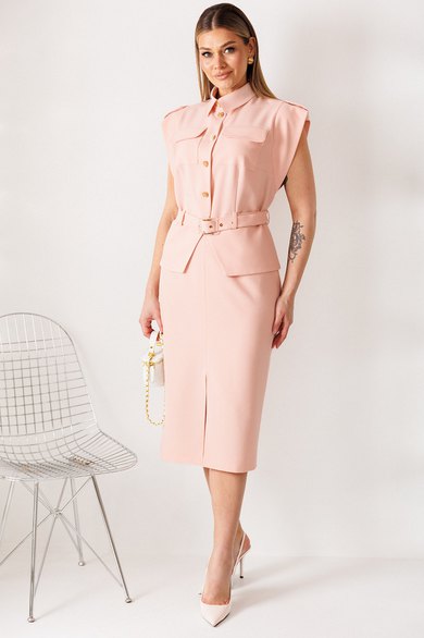Элегантный костюм, состоящий из жакета без рукава и юбки. Жакет с отрезной баской по переду и спинке. Без рукавов, но с декоративными крылышками по проймам. Застежка центральная на пуговицы. Воротник с отрезной стойкой. По линии плеча погоны, которые застегиваются на пуговицу. По переду нагрудные и талиевые вытачки. По спинке средний шов и талиевые вытачки. По переду накладные карманы с клапанми. По линии талии шлевки и пояс, которые застегивается на пряжку. Пояс съемный. Юбка прямая, зауженная к низу. По переднему полотнищу разрез. Пояс с резинками по бокам. Застежка на потайную молнию и пуговицу. Юбка на подкладке.