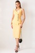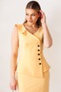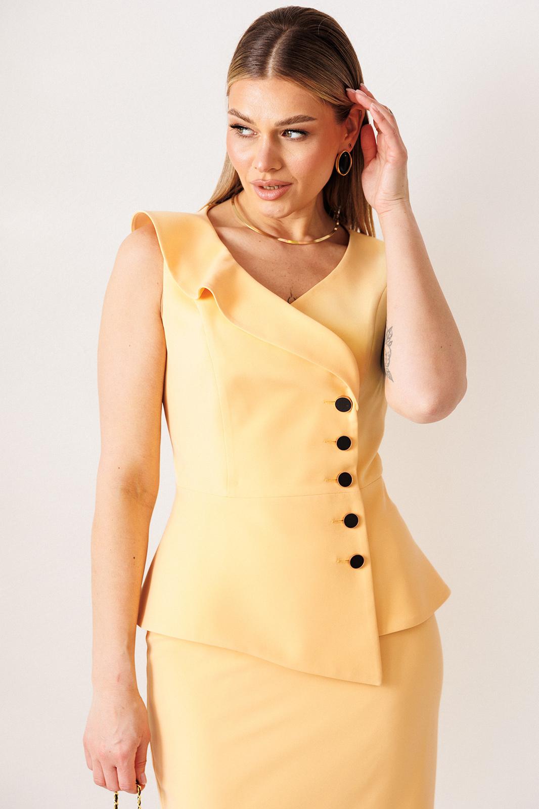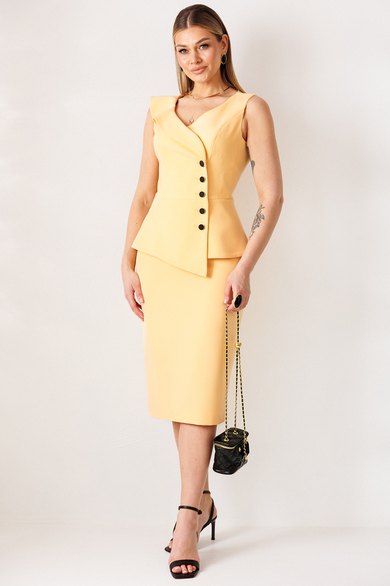 Элегантный костюм, состоящий из жакета без рукава и юбки. Жакет полуприлегающего силуэта. Отрезной бочок по переду, рельефная линия, выходящая из проймы, а также средний шов и талиевые вытачки по спинке создают утонченный силуэт. Жакет с отрезной, ассиметричной по переду баской. Со смещенной застежкой на пять отделочных пуговиц. Горловина расширена и углублена по переду. Правый борт украшает волан фигурной формы. Юбка прямая, зауженная к низу. Сзади шлица и застежка на потайную молнию и пуговицу. Пояс с резинками по бокам. Жакет и юбка на подкладке.