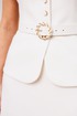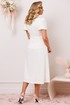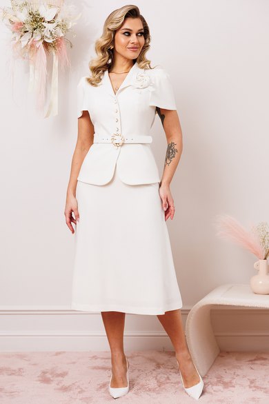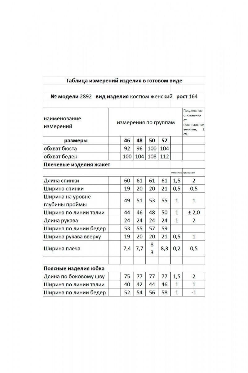 Двухпредметный комплект, состоящий из жакета и юбки. Жакет полуприлегающего силуэта, отрезной по линии талии. Перед и спинка с вертикальными рельефами, в которые вставлены рукава, сверху по окату со складками. Спинка со средним швом. Воротник пиджачного типа. Застежка на петли-пуговицы. Юбка А-силуэта, на притачном поясе, по бокам с резинками. Застежка на тесьму-молнию в среднем шве, который переходит в шлицу. Костюм на подкладке. Комплект декорирован съемной брошью в виде цветка.