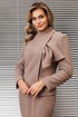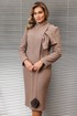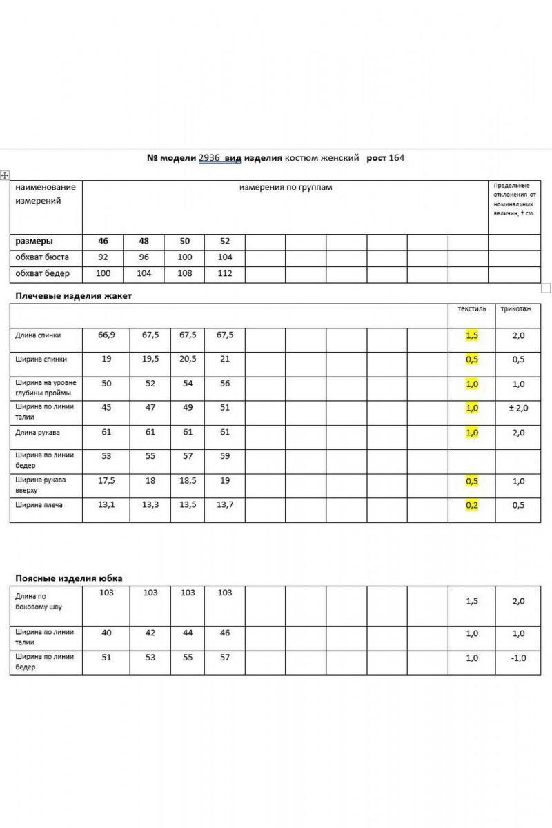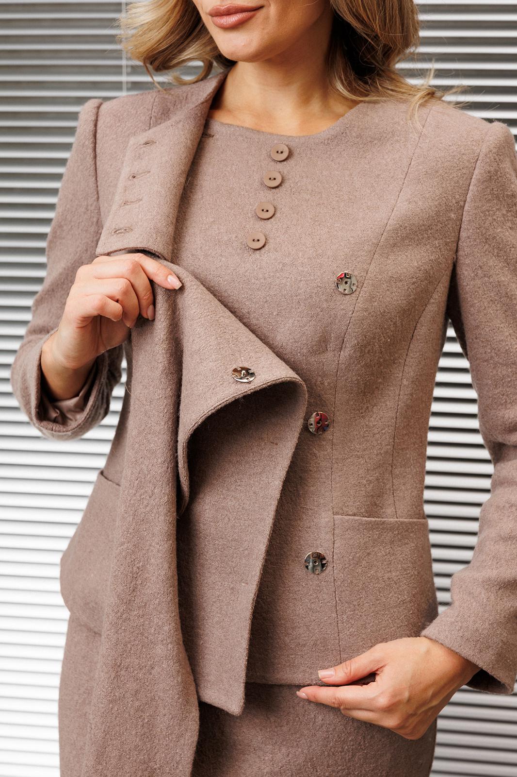 Комплект женский, состоящий из жакета и юбки. Жакет полуприлегающего силуэта с рельефами по переду и спинке. Полочка с карманами от рельефа до бокового шва. Застежка на кнопки и в верхней части на петли-пуговицы. В жакете оригинально оформлена линия горловины - в виде драпирующегося шарфа, что позволяет использовать его в прохладную погоду в качестве верхней одежды. Юбка прямая, зауженная к низу, сверху на притачном поясе с резинками. Застежка на тесьму-молнию в среднем шве, которая переходит в шлицу. Костюм на подкладке.