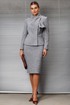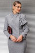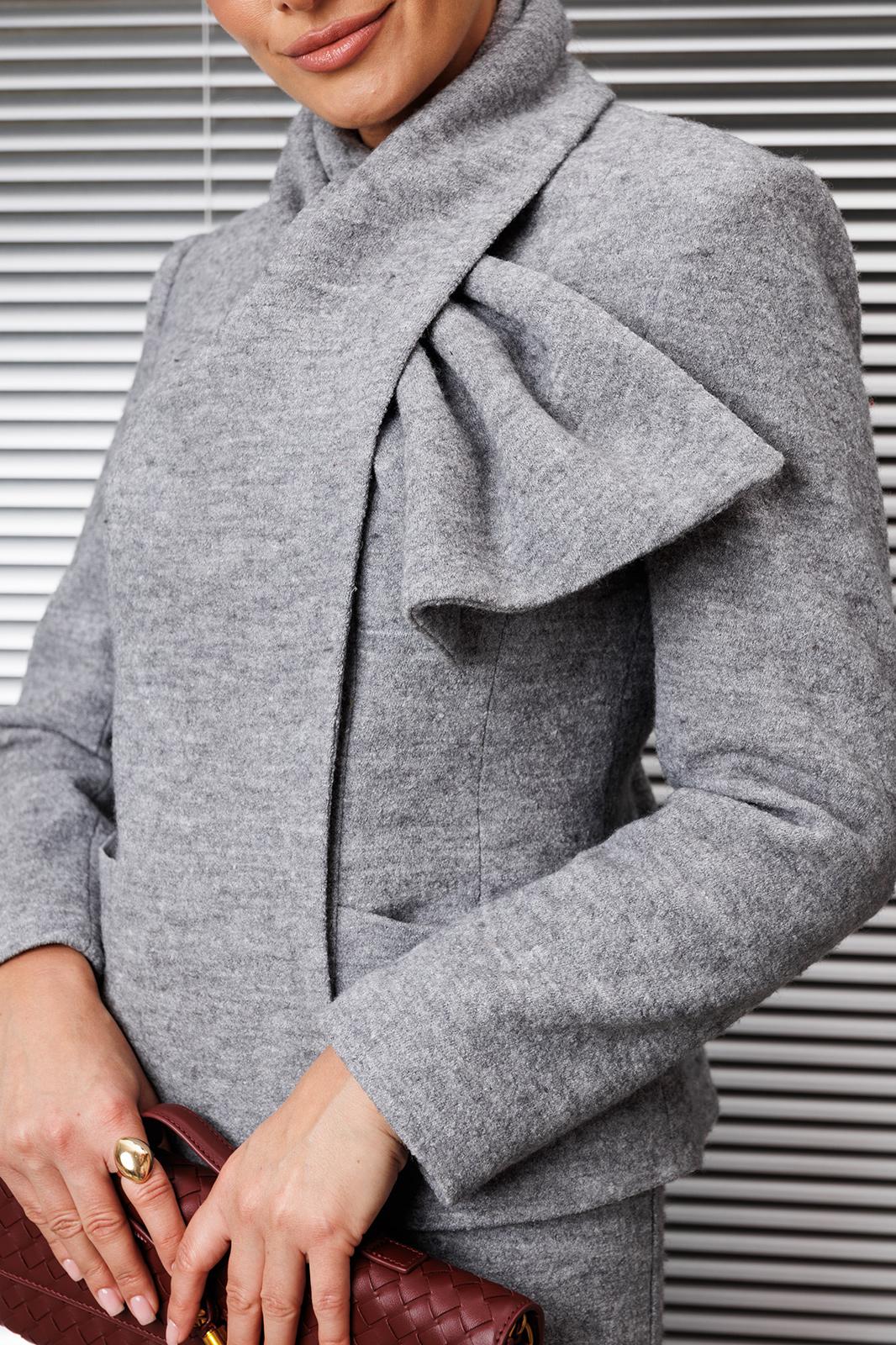 Комплект женский, состоящий из жакета и юбки. Жакет полуприлегающего силуэта с рельефами по переду и спинке. Полочка с карманами от рельефа до бокового шва. Застежка на кнопки и в верхней части на петли-пуговицы. В жакете оригинально оформлена линия горловины - в виде драпирующегося шарфа, что позволяет использовать его в прохладную погоду в качестве верхней одежды. Юбка прямая, зауженная к низу, сверху на притачном поясе с резинками. Застежка на тесьму-молнию в среднем шве, которая переходит в шлицу. Костюм на подкладке.