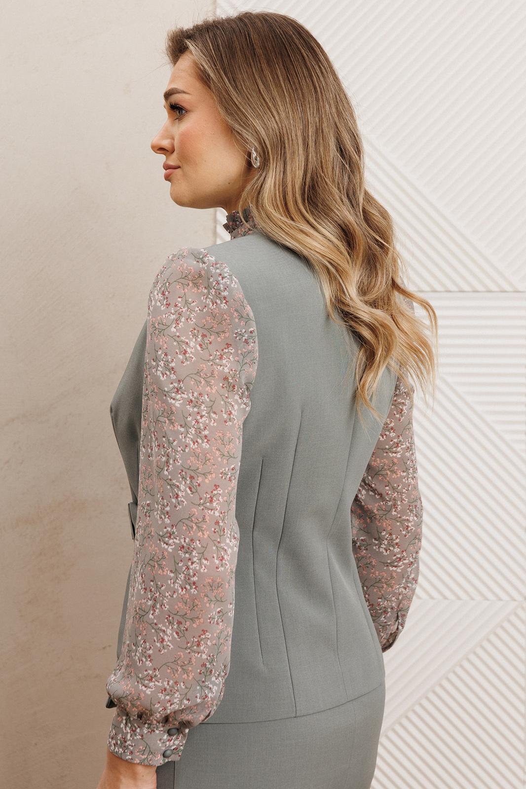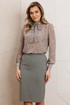 Блузка полуприлегающего силуэта. По переду нагрудные вытачки, спинка - с талиевыми вытачками. Воротник-стойка с рюшей по краю и завязкой. Рукав втачной, одношовный, по низу с манжетой. Жилет приталенного силуэта. Перед жилета отрезной по талии, с асимметричной фигурной баской. По верхней части переда по две талиевых вытачки. Спинка со средним швом и талиевыми вытачками. Застежка в виде пояса через пряжку-полукольца. Жилет на подкладке. Юбка зауженная к низу, с застежкой и шлицей в среднем шве. Юбка на притачном поясе, на подкладке. Элегантный комплект безупречно сидит на фигуре и смотрится очень современно, а регулируемый пояс поможет усилить акцент на талии.