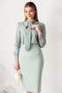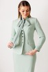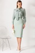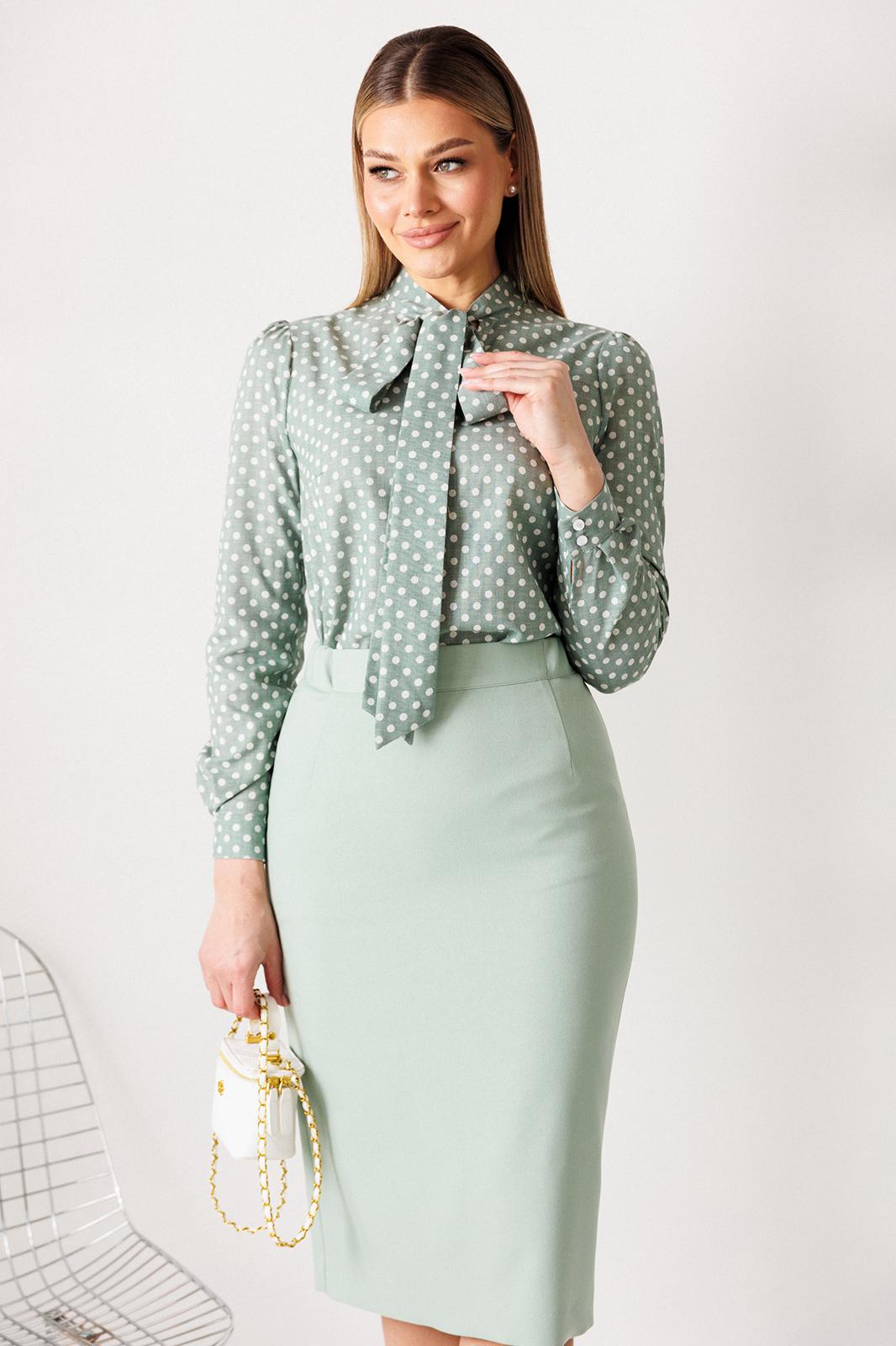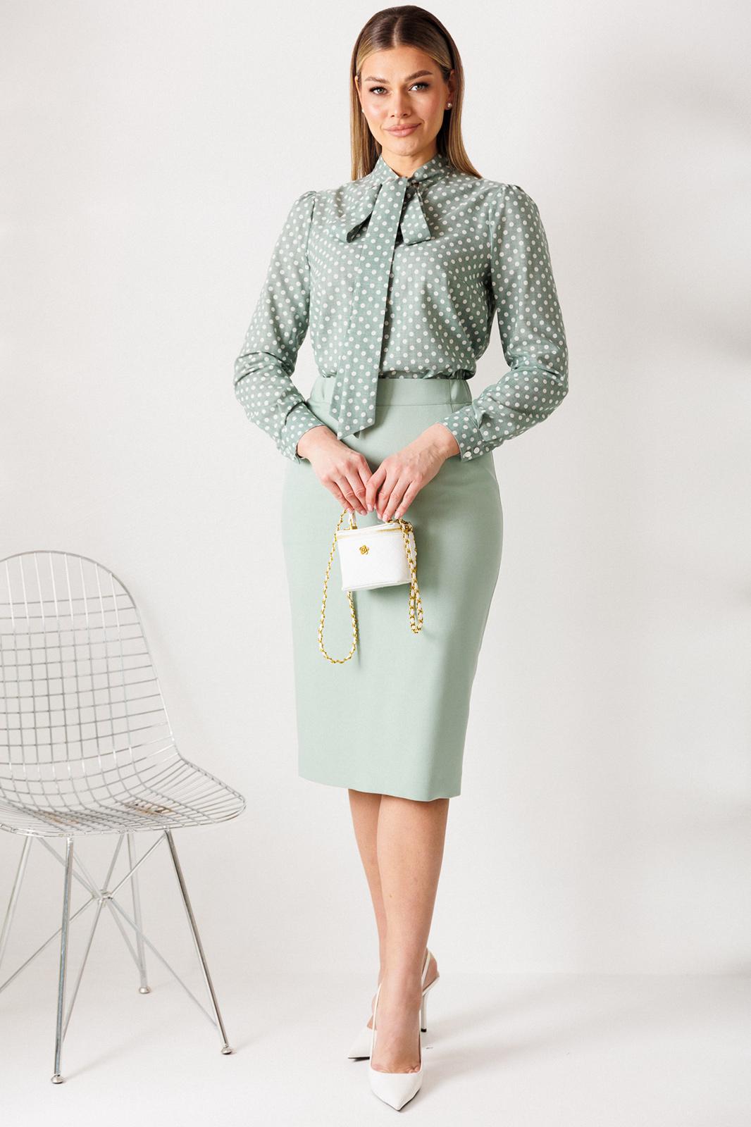 Блуза прямого силуэта, в боковых швах с разрезами, по переду с нагрудной вытачкой. Воротник стойка переходящий в бант. Рукав втачной одношовный, снизу на манжете. Сверху по окату со сборкой. Юбка прямая, зауженная к низу, на притачном поясе, по бокам с рисунком.