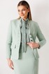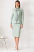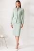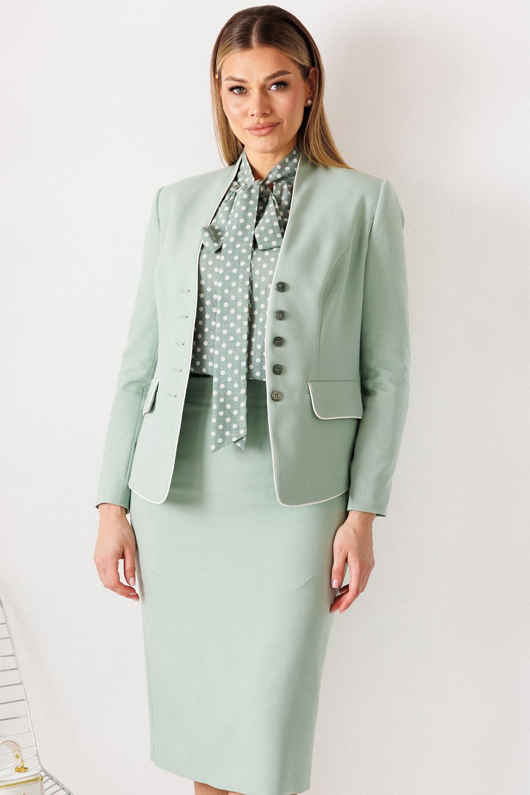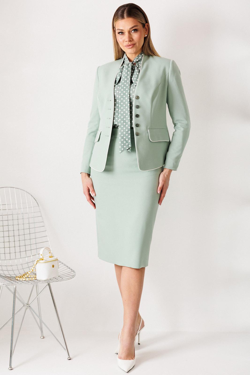 Трехпредметный костюм с приталенным жакетом в модной цветовой гамме – яркий экземпляр для вашей коллекции. Жакет с рельефами. По переду и спинке на полочках обработаны карманы с клапаном. Рукав втачной двухшовный. Воротник стойка. Застежка на петли пуговицы. Жакет декорирован кантом по линии борта и клапаном.