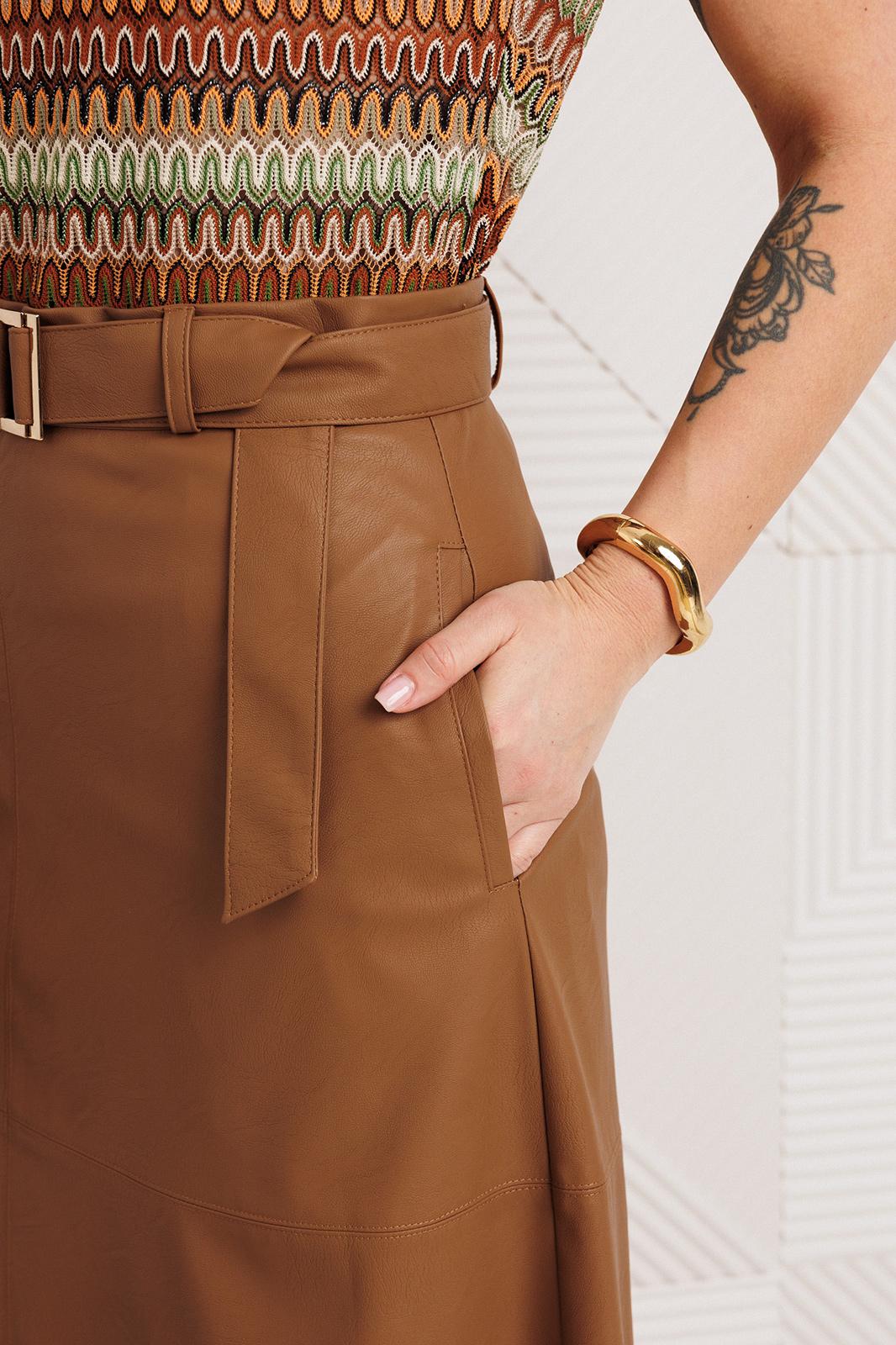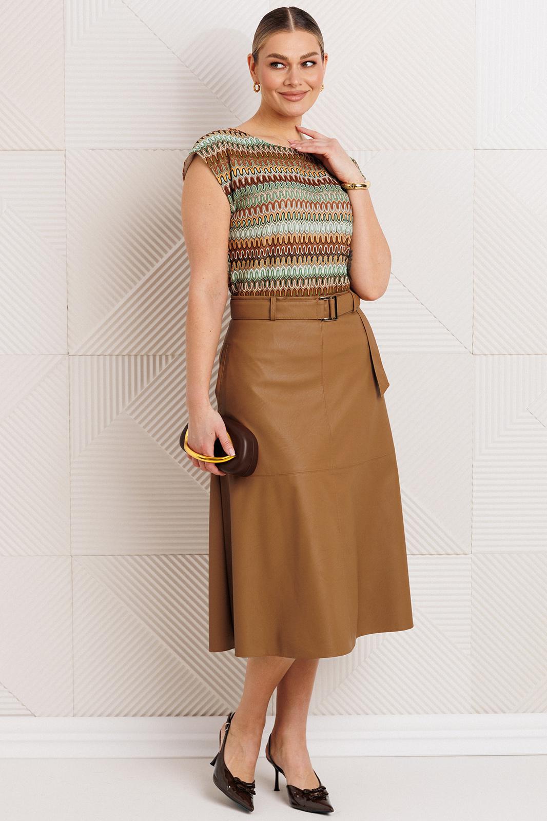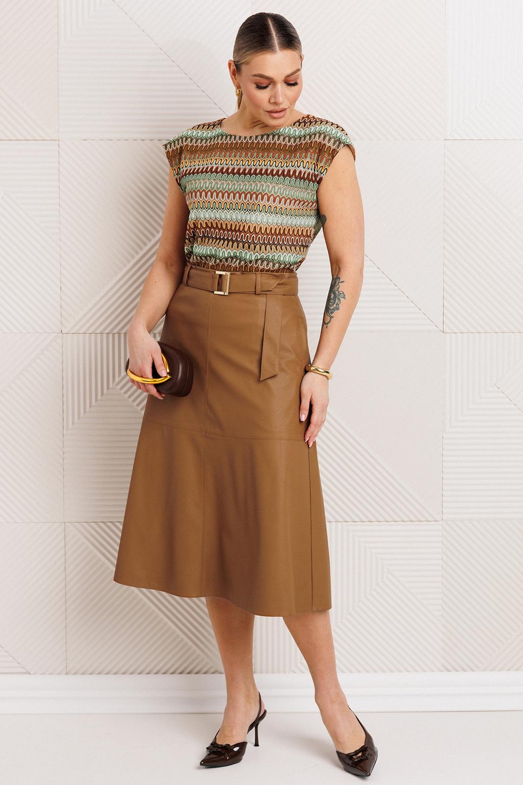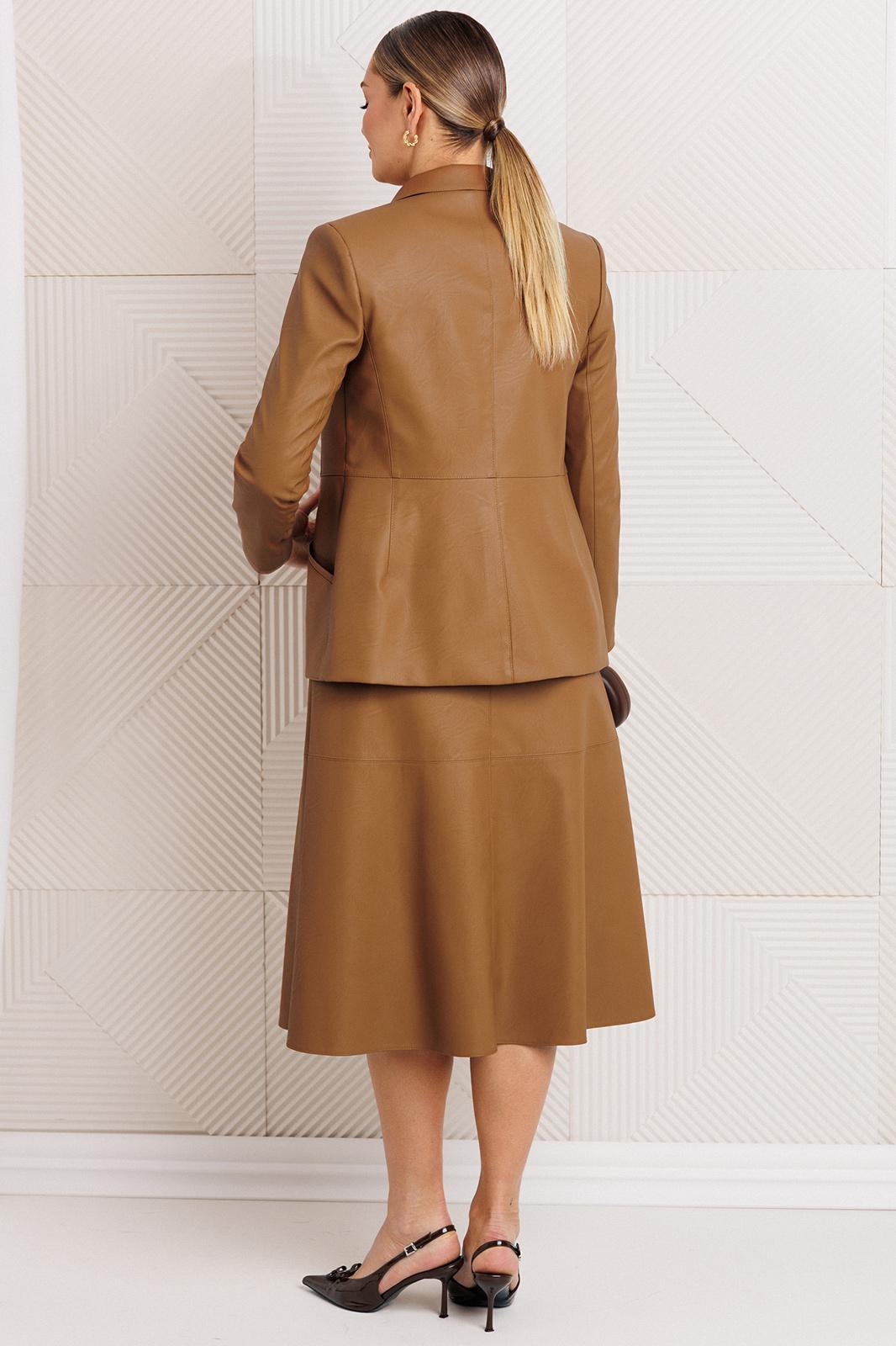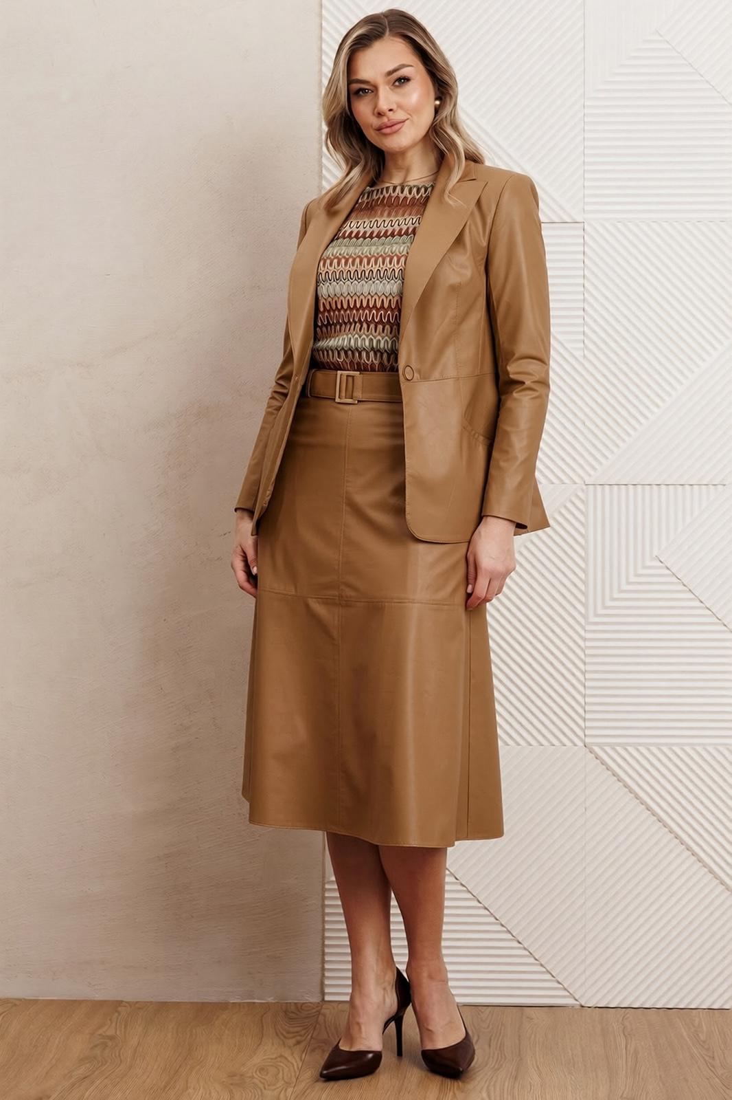 - Тип ткани: Жакет, юбка: п/э 100% (экокожа на вискозной основе). Топ: хлопок 97%, спандекс 3%.