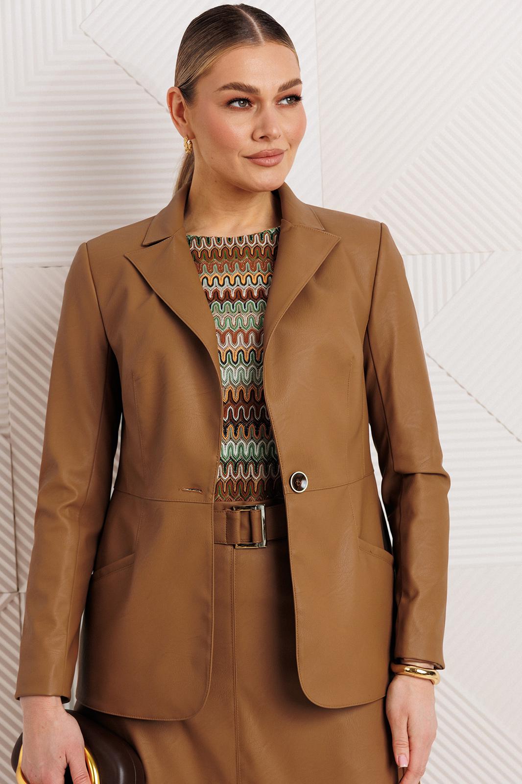 Модный и стильный костюм-тройка с топом - это идеальный выбор как для работы, так и для повседневной жизни. Жакет однобортный, полуприлегающий. Застежка жакета на одну пуговицу, чуть выше линии талии. Рукав втачной, двухшовный. Воротник отложной с лацканами. На полочке прорезные карманы с листочкой. Длина жакета ниже линии бедер. Топ выполнен из кружевного полотна. Такой топ станет отличной базовой вещью гардероба. Его можно носить на выпуск или заправлять. Топ выполнен на трикотажной подкладке. Спинка чуть длиннее полочки, вырез горловины округлый, плечо спущенное. Юбка расширенного силуэта, четырехклинка. Благодаря универсальности и практичности фасона юбка-четырехклинка уже давно является классической моделью. Она идет большинству женщин различных возрастов и типов фигур. Такой фасон способен подчеркнуть достоинства и скрыть недостатки внешности ее хозяйки. Самый хитовый вариант – это кожаная или джинсовая юбка с карманами и притачным поясом. Наша юбка выполнена из экокожи на вискозной основе. Жакет выполнен на подкладке, юбка без подкладки.