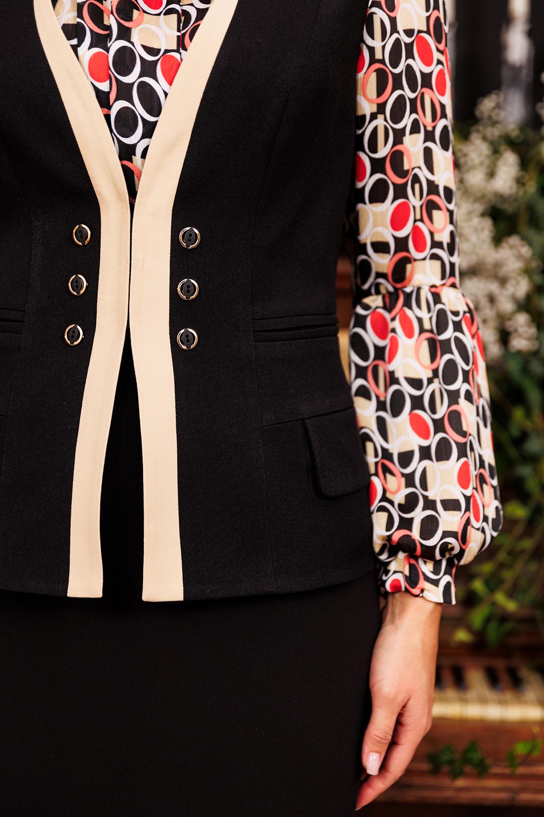 Жилет полуприлегающего силуэта с рельефами. На полочках обработаны карманы с рамками. Перед и спинка с рельефами. Спинка со средним швом. Борта жилета с притачными планками контрастного цвета. Застежка на пришивные крючки. Жилет на подкладке. Юбка прямая, зауженная к низу на притачном поясе с резинками по бокам. Застежка на тесьму молнию в среднем шве. Юбка на подкладке. Блуза прямого силуэта по переду с нагрудными вытачками, выходящими из боковых швов. Рукава втачные, снизу на притачной манжете с резинкой. Воротник-стойка, переходящая в бант.