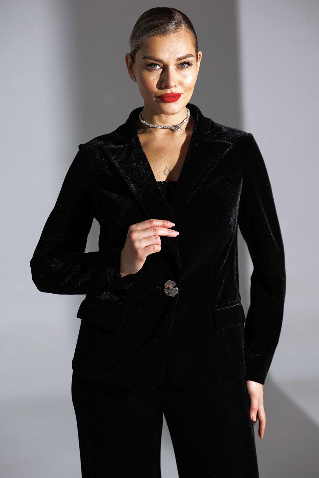 Наш бархатный жакет - это не просто вещь, это ключ к безупречному праздничному образу. Его мягкий блеск и королевская фактура делают его главным героем любого ансамбля.