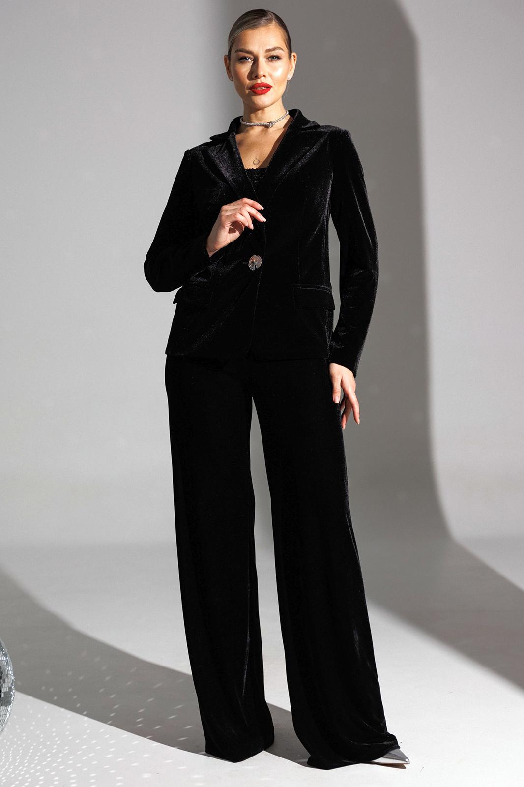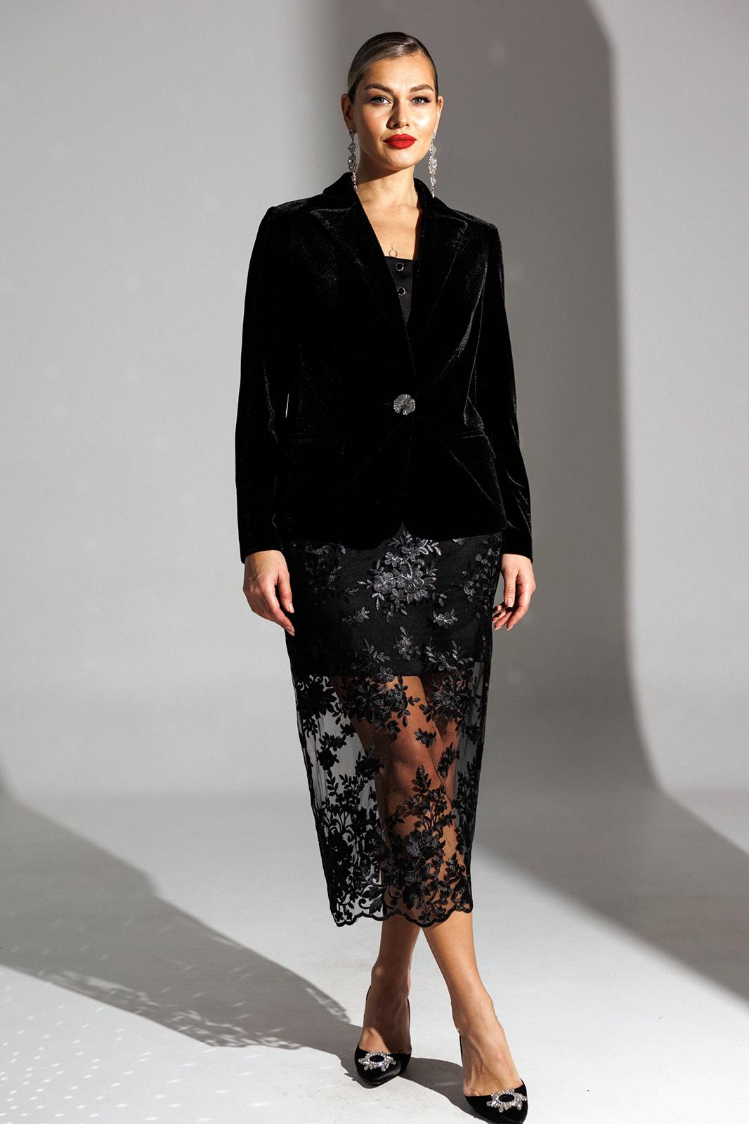 Жакет выполнен из роскошного бархата, имеет полуприлегающий силуэт и центральную застежку на одну отделочную пуговицу. Спинка оформлена средним швом и вертикальными рельефами, что подчеркивает фигуру. Передняя часть жакета дополнена талиевыми вытачками и боковыми швами., что придает ему изысканность. Карманы в рамку с клапанами добавляют функциональности, а воротник пиджачного типа завершает образ. Рукава жакета втачные, двухшовные, что делает его удобным и стильным. Жакет не имеет подкладки, что делает его легким и подходящим для разнообразных мероприятий.