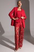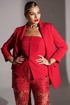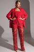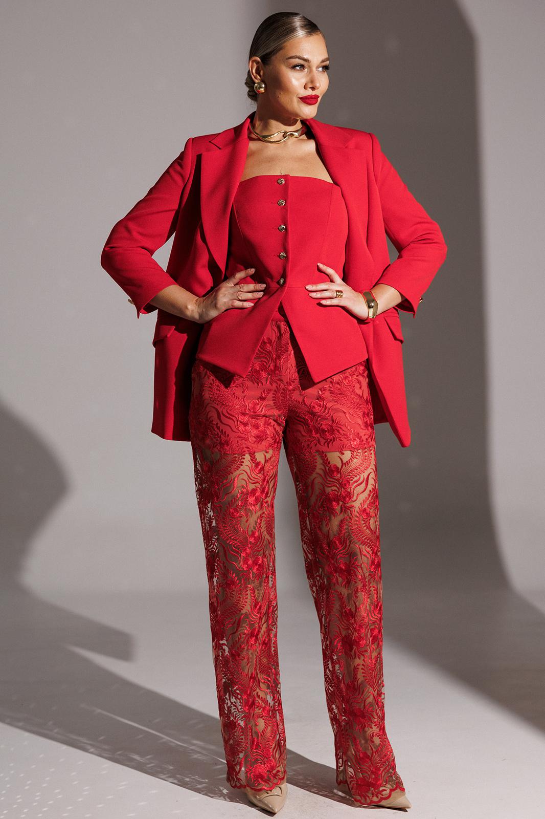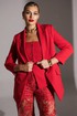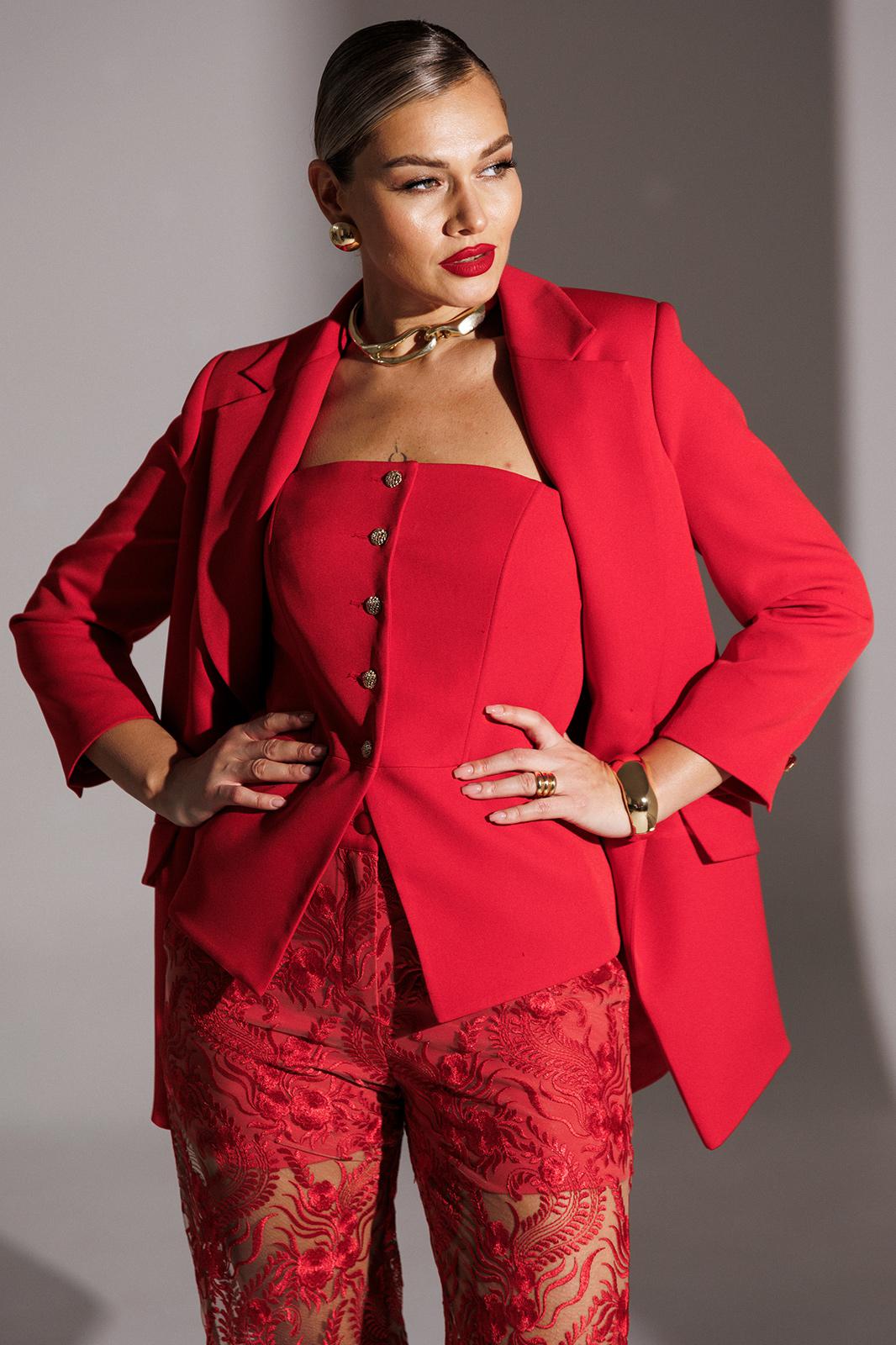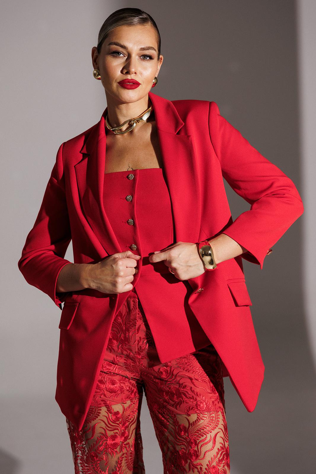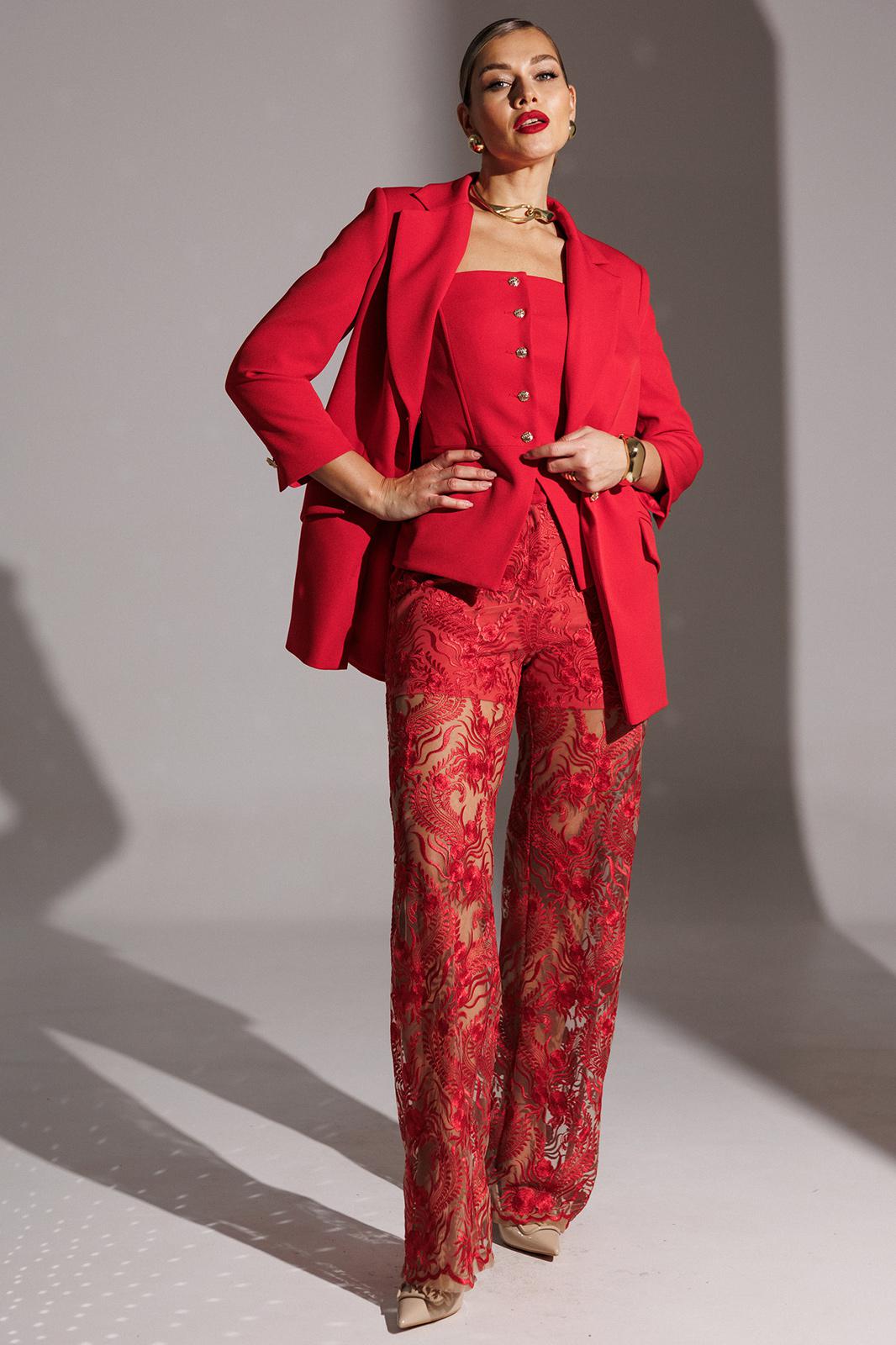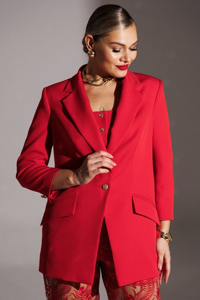 Капсула R E D C O D E - Ваша формула смелого праздника. Она создана для особых случаев включает в себя жакет, корсет и брюки, создавая элегантный и стильный образ. Жакет выполнен в классическом стиле с полуприлегающим силуэтом. Он удлиненный, имеет центральную застежку на одну пуговицу и элегантные детали, такие как спинка с средним швом и шлицей, а также перед с талиевыми вытачками и наклонными карманами с клапанами. Воротник пиджачного типа добавляет строгости, а втачные двухшовные рукава длиной 3/4 со шлицей в локтевом шве и пуговицей придают жакету изысканный вид. Жакет на подкладке.