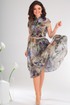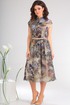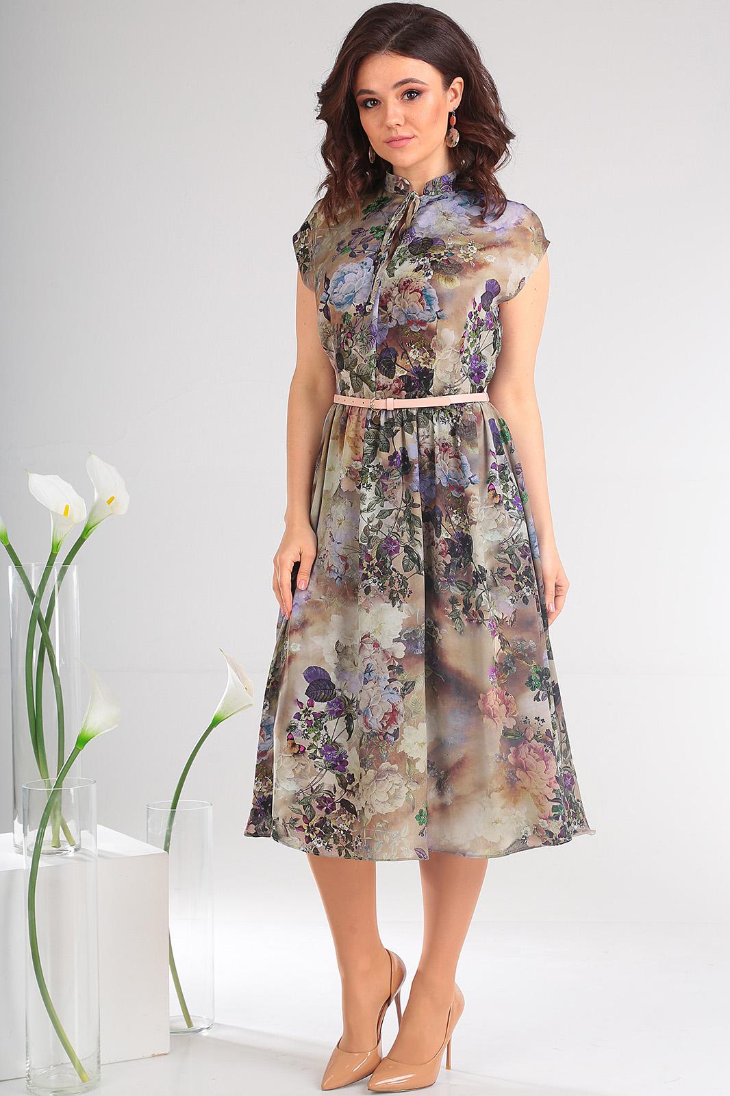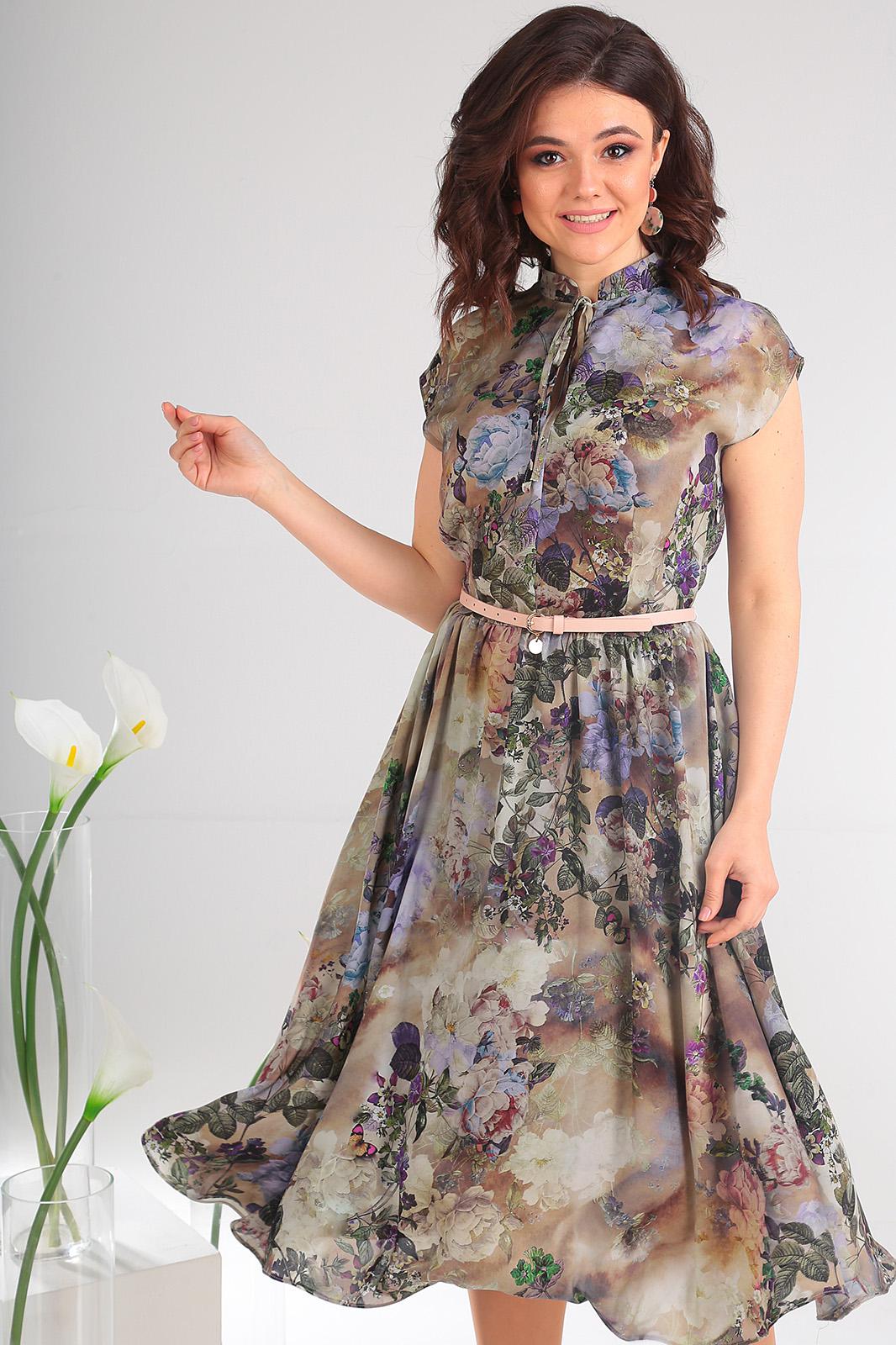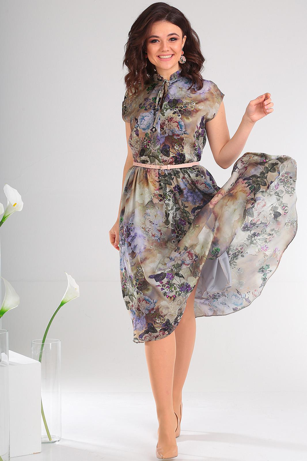 Струящееся летнее платье приталенного силуэта выполнено из шифона. Платье отрезное по талии. Юбка платья в сборку по линии талии. Застежка в боковом шве. Лиф платья с цельнокроеными рукавами. Спинка лифа с талиевыми вытачками и средним швом. Перед лифа также со средним швом, оформленный талиевыми вытачками. Воротник-стойка. Платье дополнено декоративным поясом. Платье на трикотажной подкладке. Длина платья: