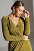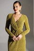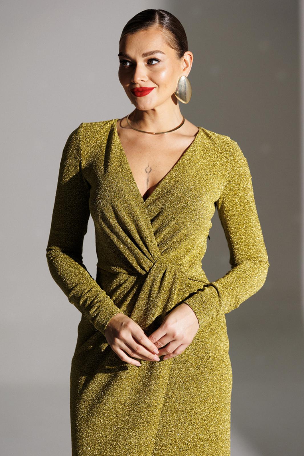 Блеск софитов, огни салютов, игривые пузырьки в бокале - и Ваше сияние обеспечено нашим вечерним платьем! Это действительно озорно, игриво, празднично! И, как ни крути, приковывает взгляды! Представленное платье приталенного силуэта. Спинка с талиевыми вытачками. Перед отрезной по линии талии. Лиф с эффектным V-образным вырезом и узлом в области талии. Юбка на запах. Рукав полуреглан, присборенный на резинку в нижней части (по шву). Платье на подкладке. Материал платья - тонкий трикотаж с блеском. Хорошо тянется. Длина рукава (полуреглан): 68 см.