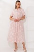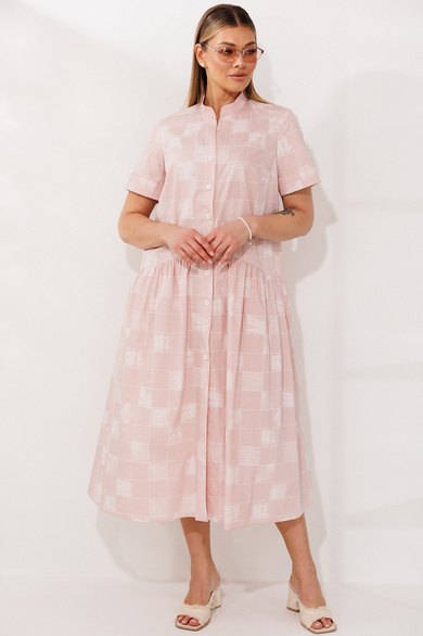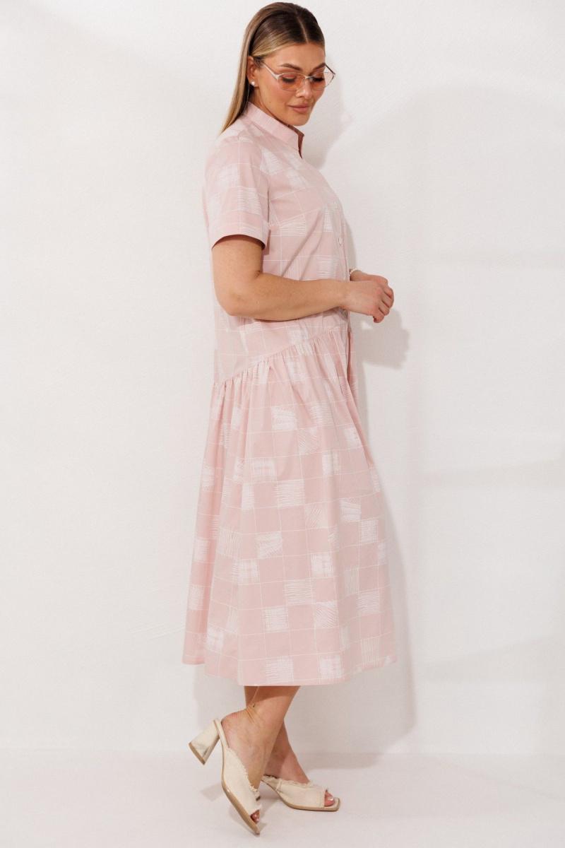 Женское платье свободного покроя, удлиненное. По переду притачная планка и застежка на петли и пуговицы. По горловине - стойка, переходящая в планку с V-образным вырезом. Рукав короткий, по низу манжет с отворотом. Платье с подрезом, фигурной формы ниже уровня талии. В линии подреза сборка, которая придает платью легкость, создает нужный объем, делает его свободным для теплого летнего дня.