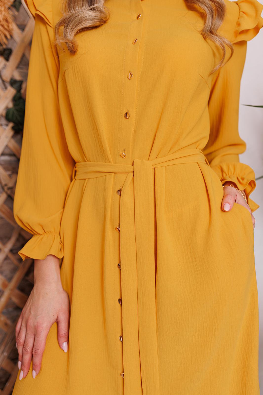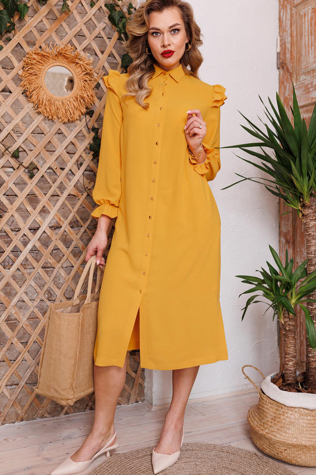 Яркое, женственное и романтичное платье от бренда Мода-Юрс. Платье прямого силуэта, по боковым швам с разрезами. Перед платья с вытачками, которые выходят из бокового шва. Рукав втачной, одношовный, снизу на резинке, сверху по окату с воланами. Воротник рубашечного типа. Застежка на петли-пуговицы. Дополнением к платью яляется съмный пояс, который подчеркнет линию талии. Платье без подкладки.