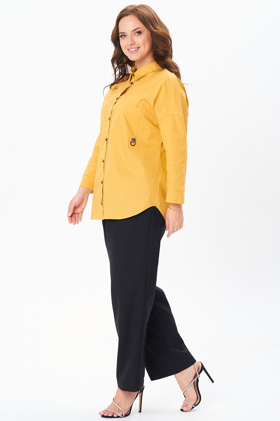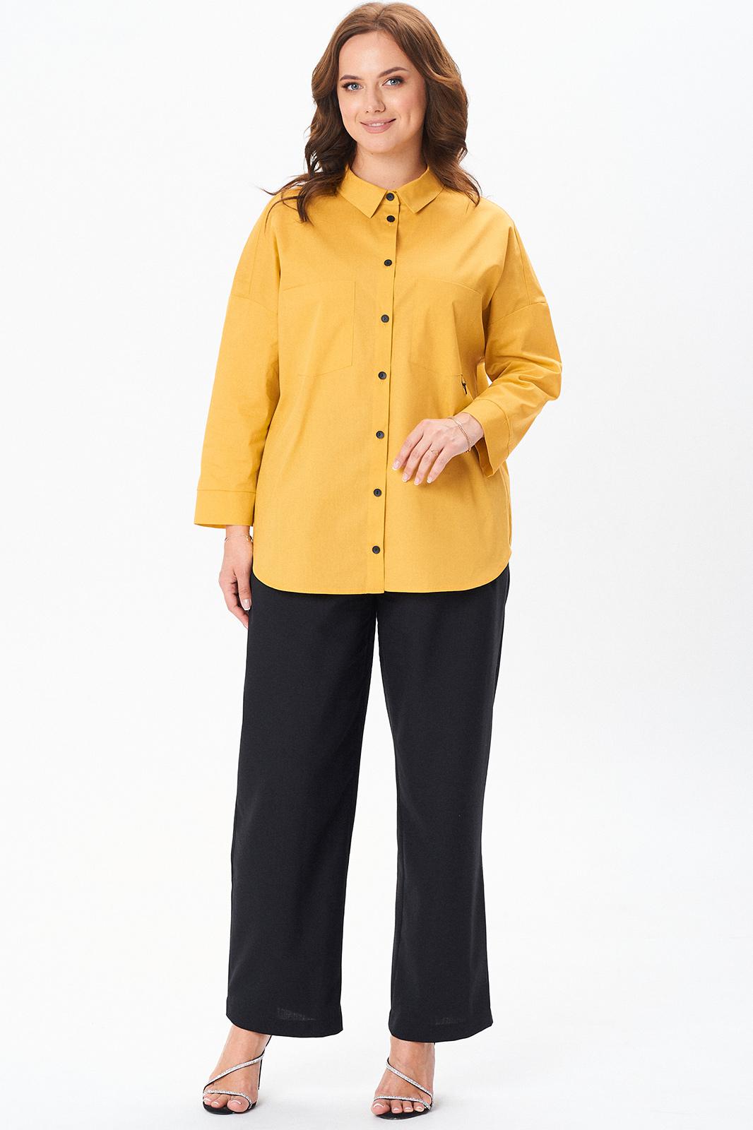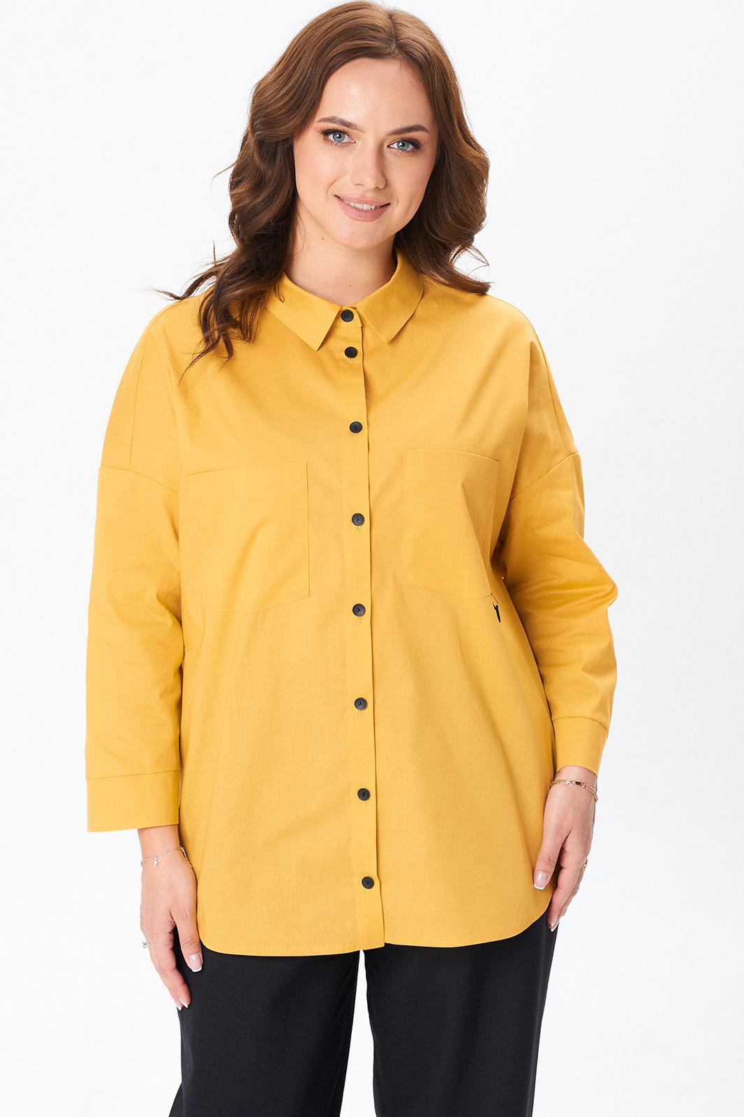 Стильная рубашка свободного кроя с центральной планкой на застежку петли-пуговицы и накладными карманами по переду. Плечо изделия спущено. Рукав 7/8 прямой с широкой манжетой. Воротник со стойкой. Спинка изделия цельная. Низ изделия фигурный отстрочен отделочной строчкой.