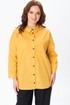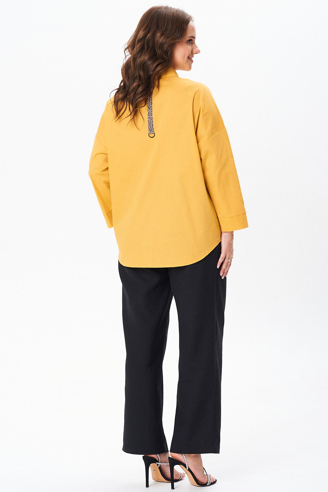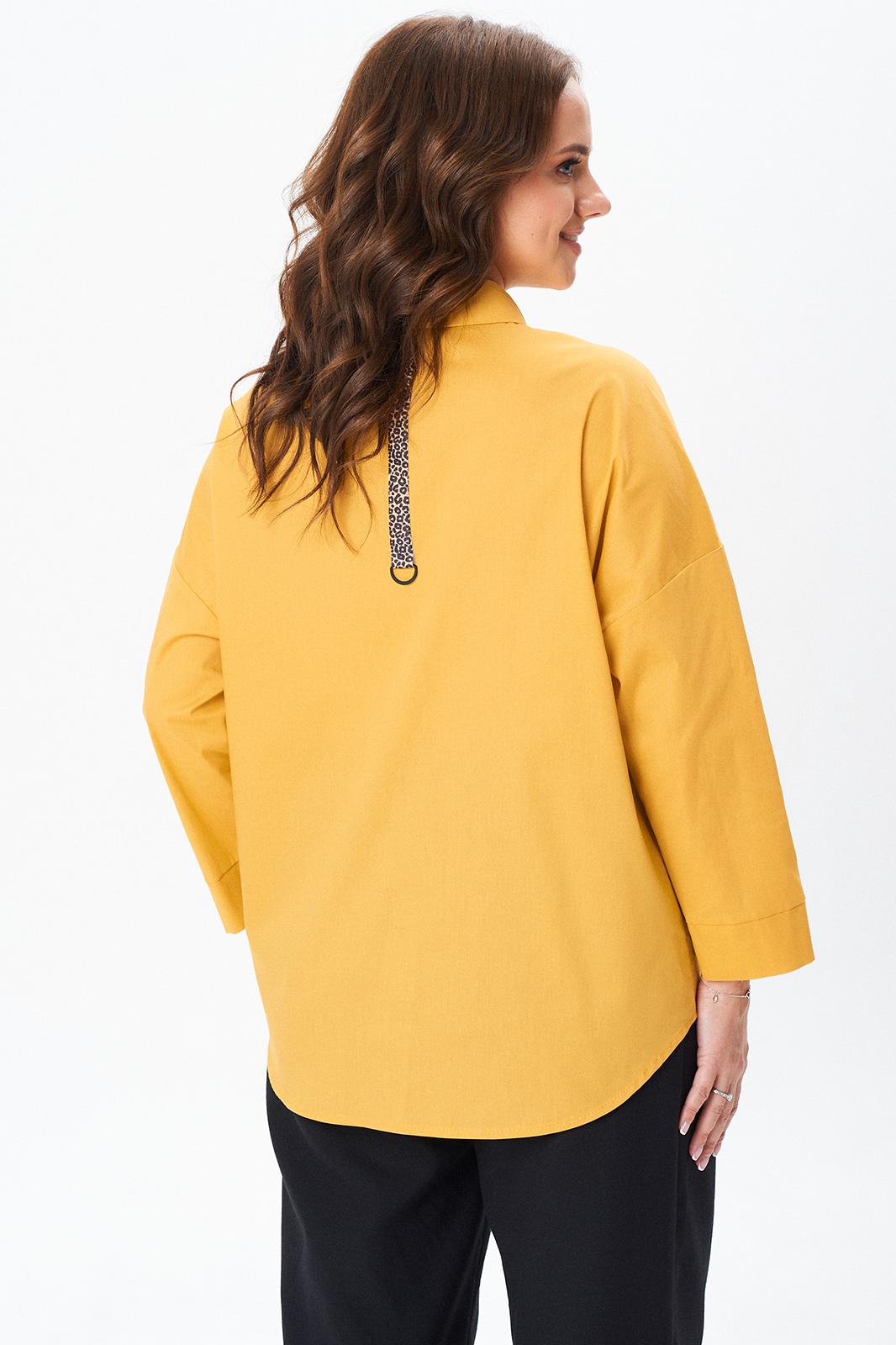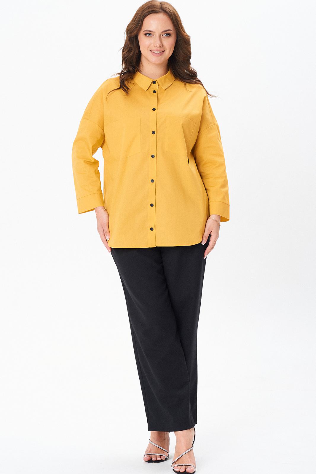 Стильная рубашка свободного кроя с центральной планкой на застежку петли-пуговицы и накладными карманами по переду. Плечо изделия спущено. Рукав 7/8 прямой с широкой манжетой. Воротник со стойкой. Спинка изделия цельная. Низ изделия фигурный отстрочен отделочной строчкой.