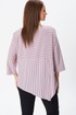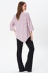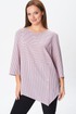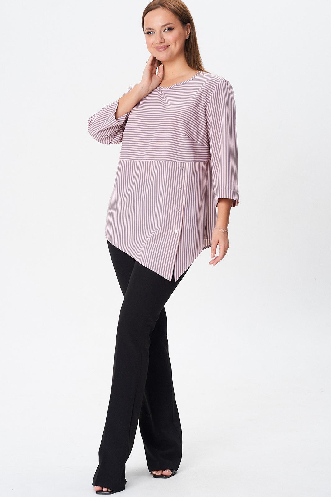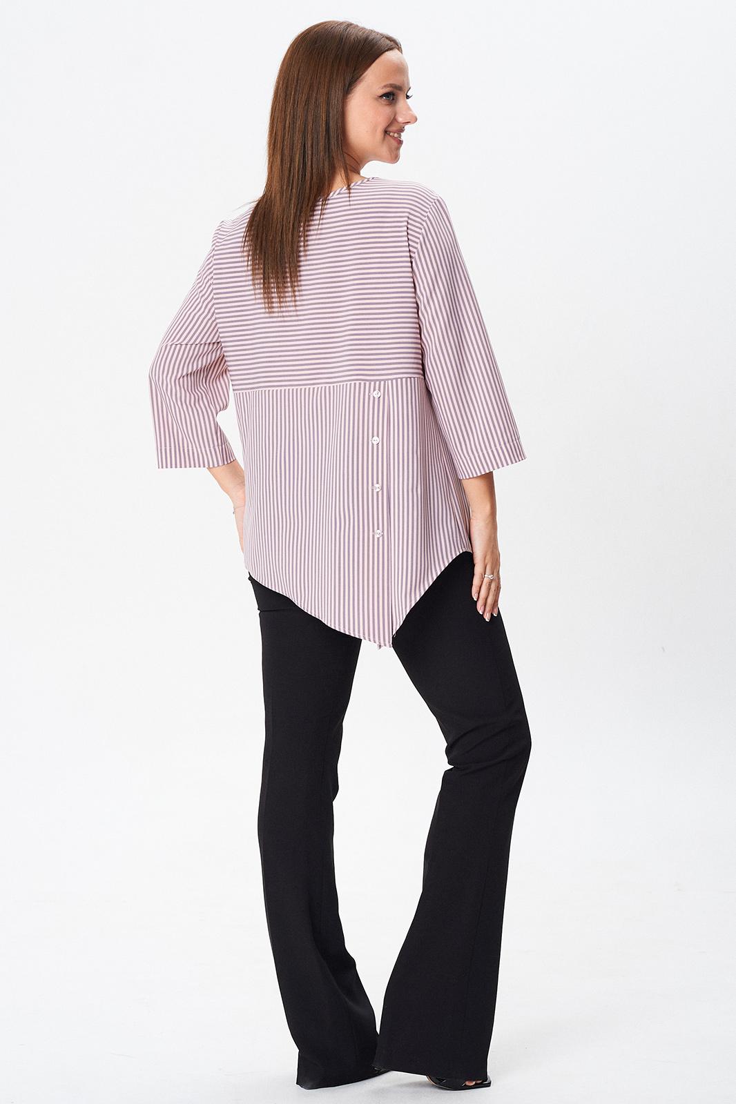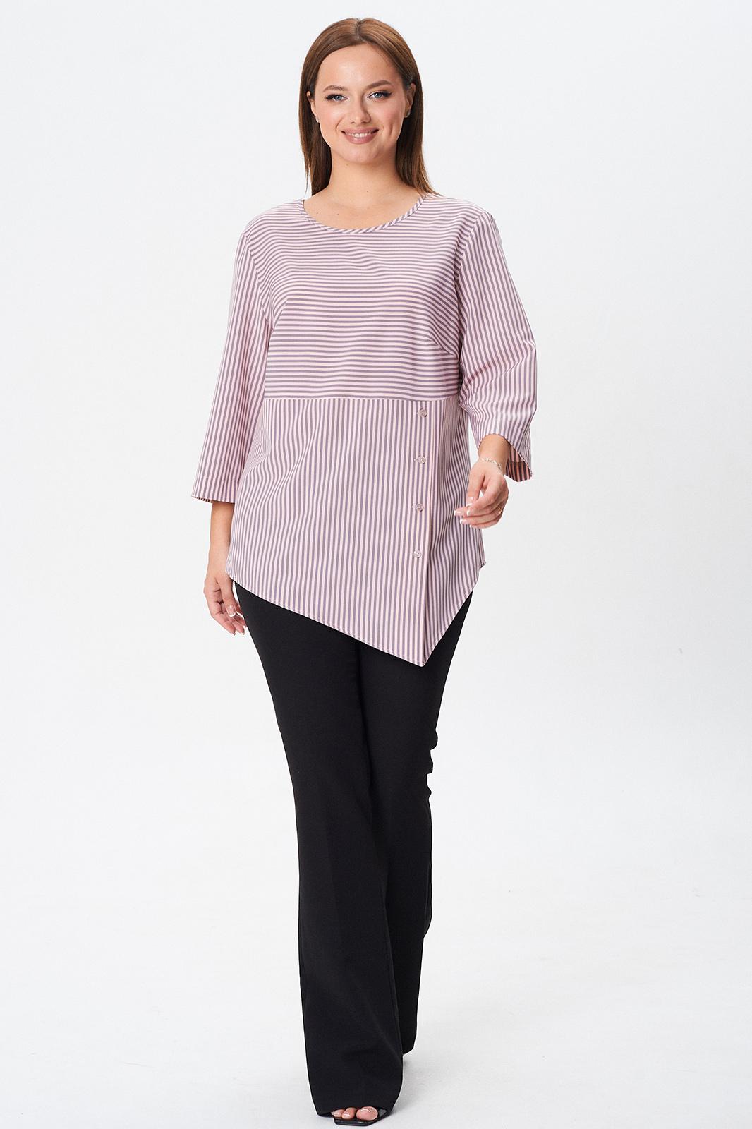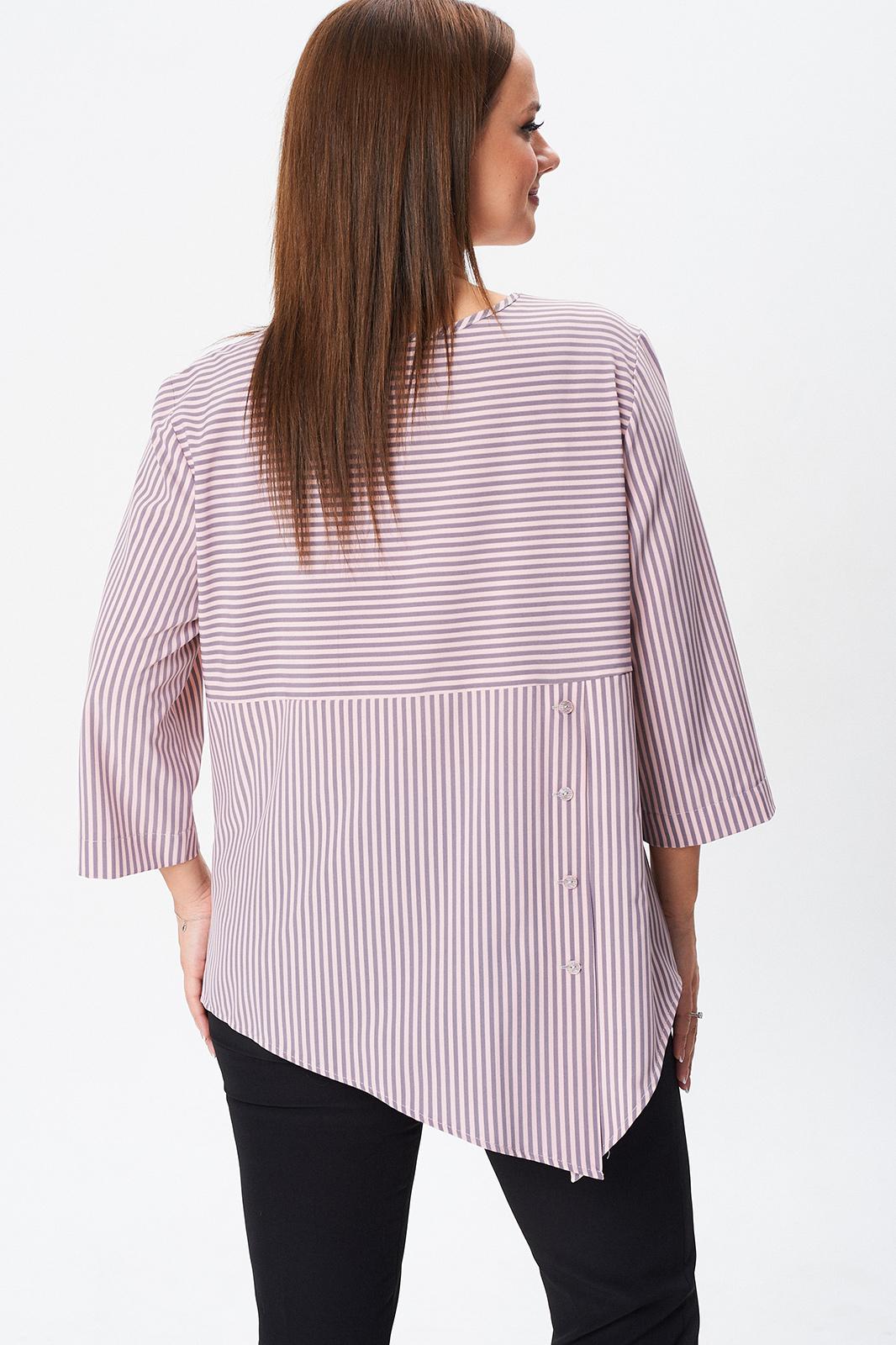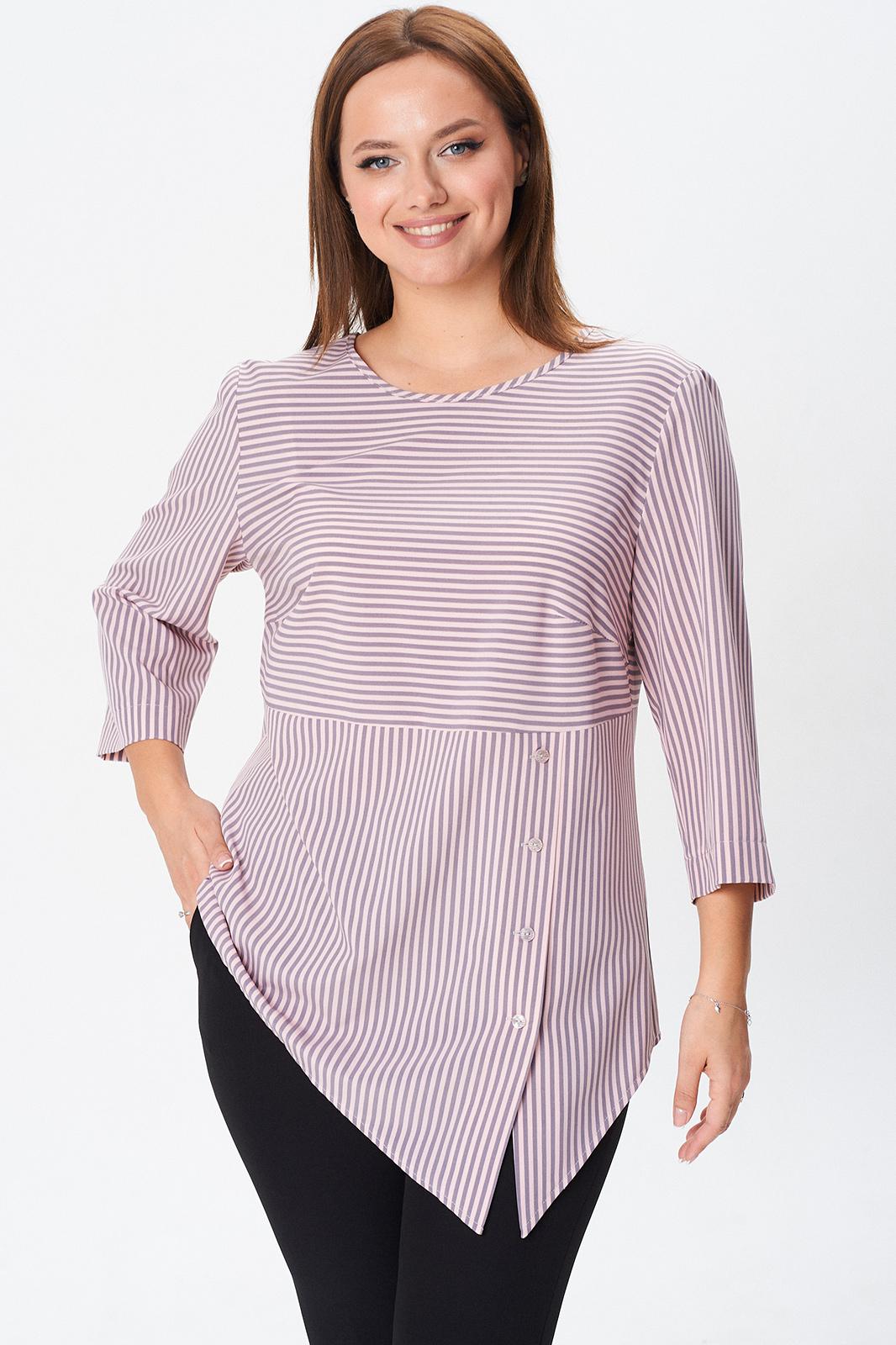 Стильная блузка с круглым вырезом горловины и нагрудными вытачками. По переду и спинке отрезная по линии талии. Нижняя часть блузки с ассиметричным фигурным низом как спереди, так и сзади и функциональной застежкой на петли пуговицы. Рукав в тачной длинной за локоть.