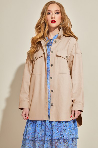 Куртка джинсовая со спущенным плечом. Воротник отложной, застежка на планку, по переду накладные карманы с клапаном. По низу рукава манжета. Низ куртки фигурный. По воротник, карманам, манжетам и низу отделочная строчка, джинс со стрейчем. Длина блузона – 82 см. Длина рукава – 62 см.