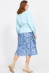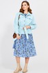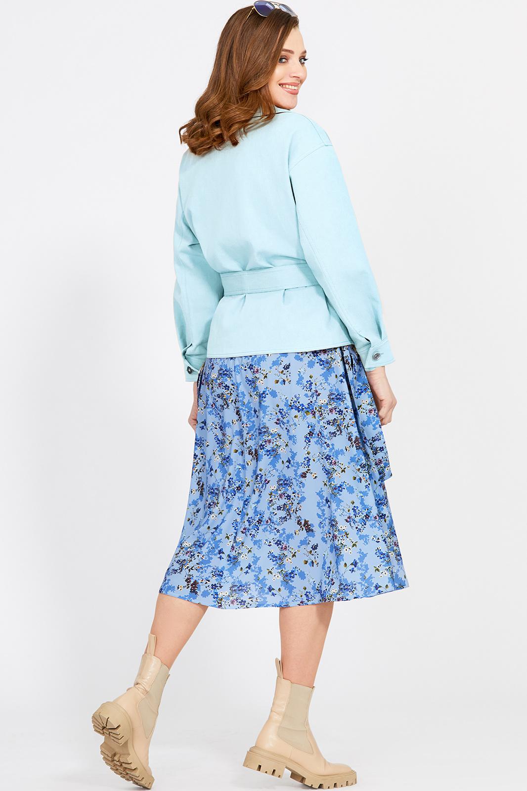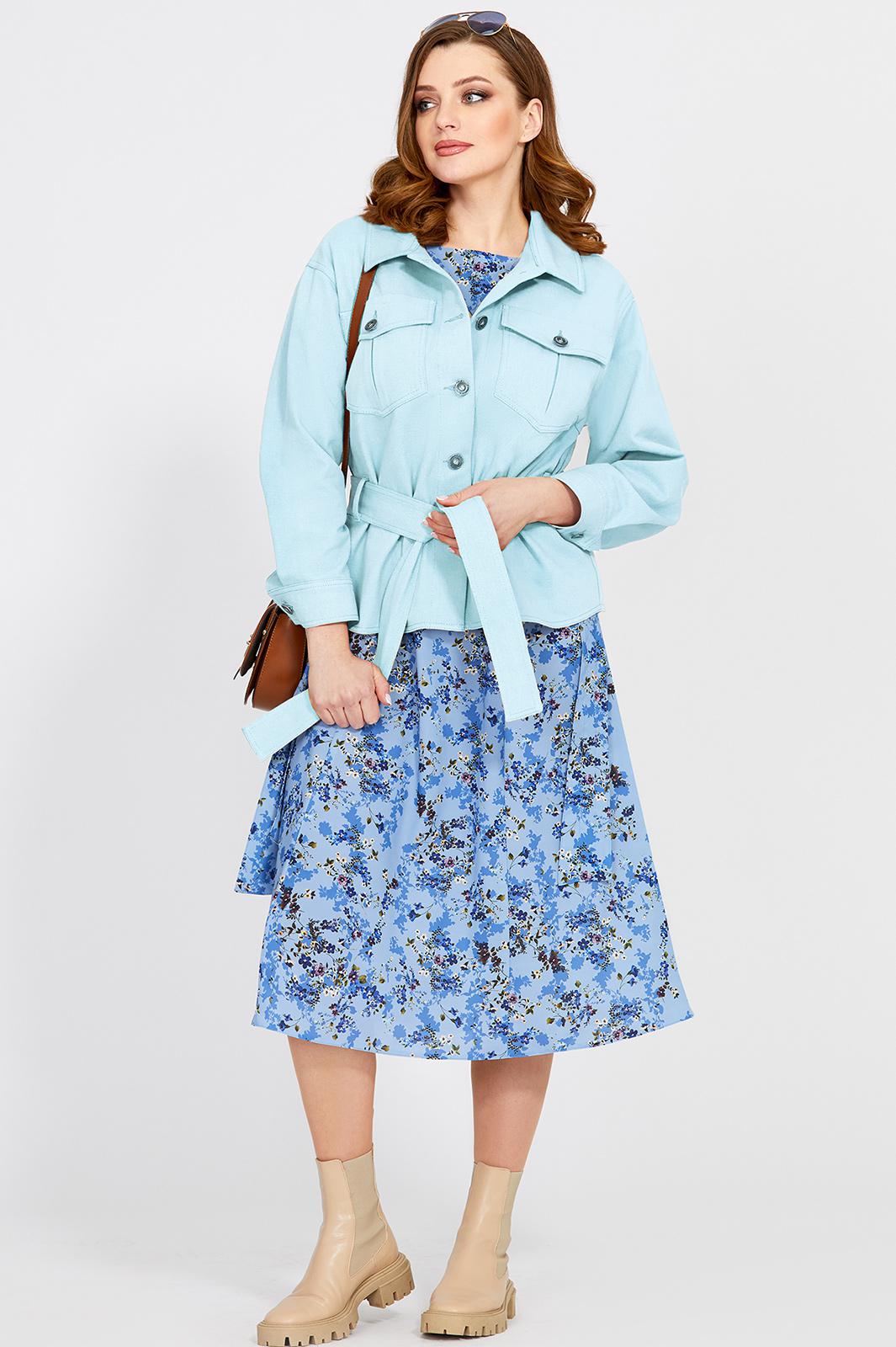 Блузон женский прямого силуэта для повседневной носки со спущенным плечом. Выполнен из джинсовой ткани (не тянется). Застежка центральная на обметанные петли и пуговицы, воротник рубашечного типа (без стойки). Рукав двух шовный, по низу на манжете, вставлен в открытую пройму. Декором служат накладные карманы по полочкам и съемный пояс из ткани, протянутый через шлевки. По всем деталям блузона двойные отделочные строчки. Длина блузона – 63 см. Длина рукава – 62 см.