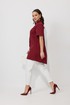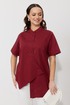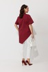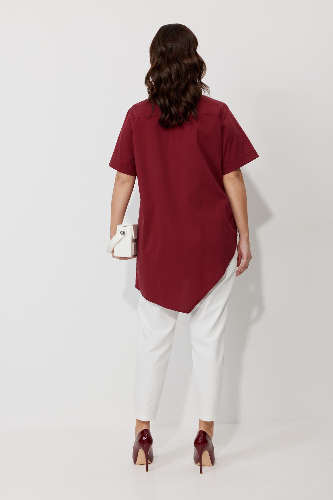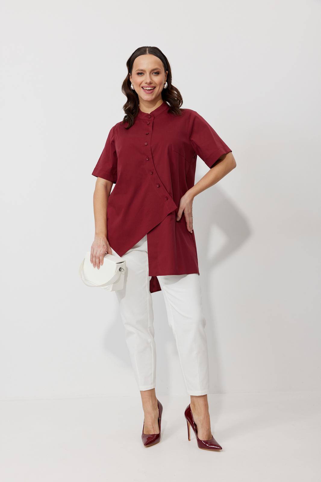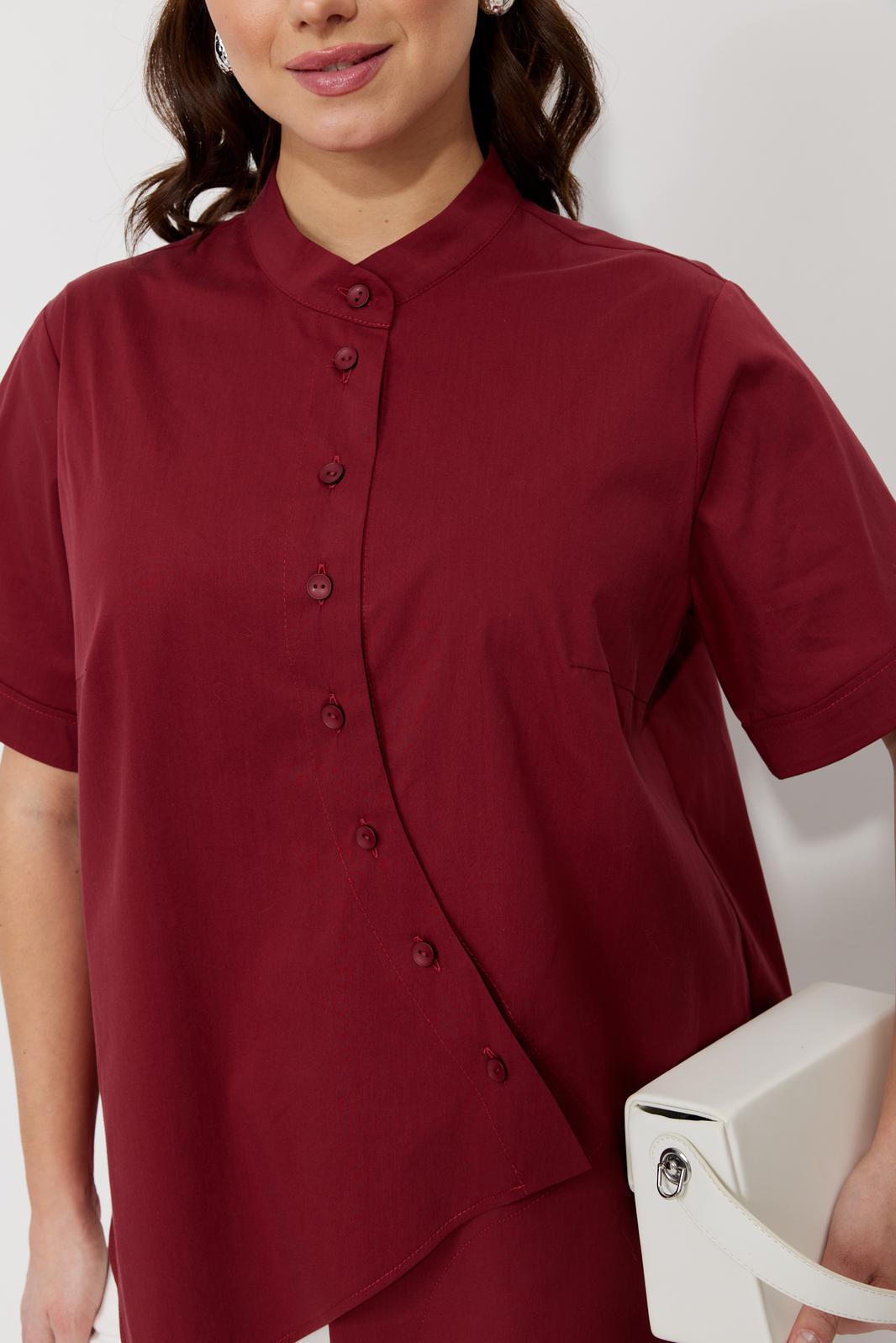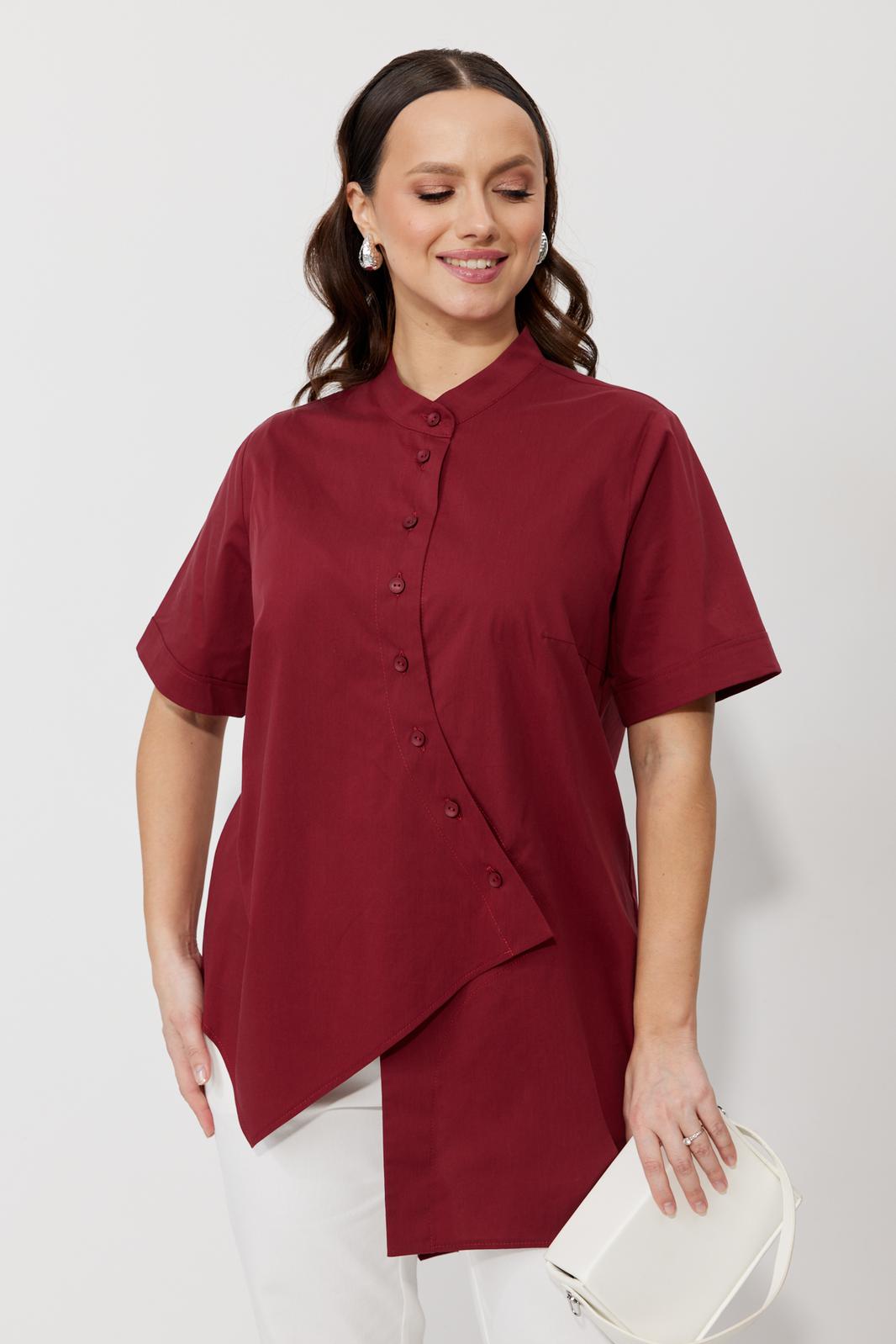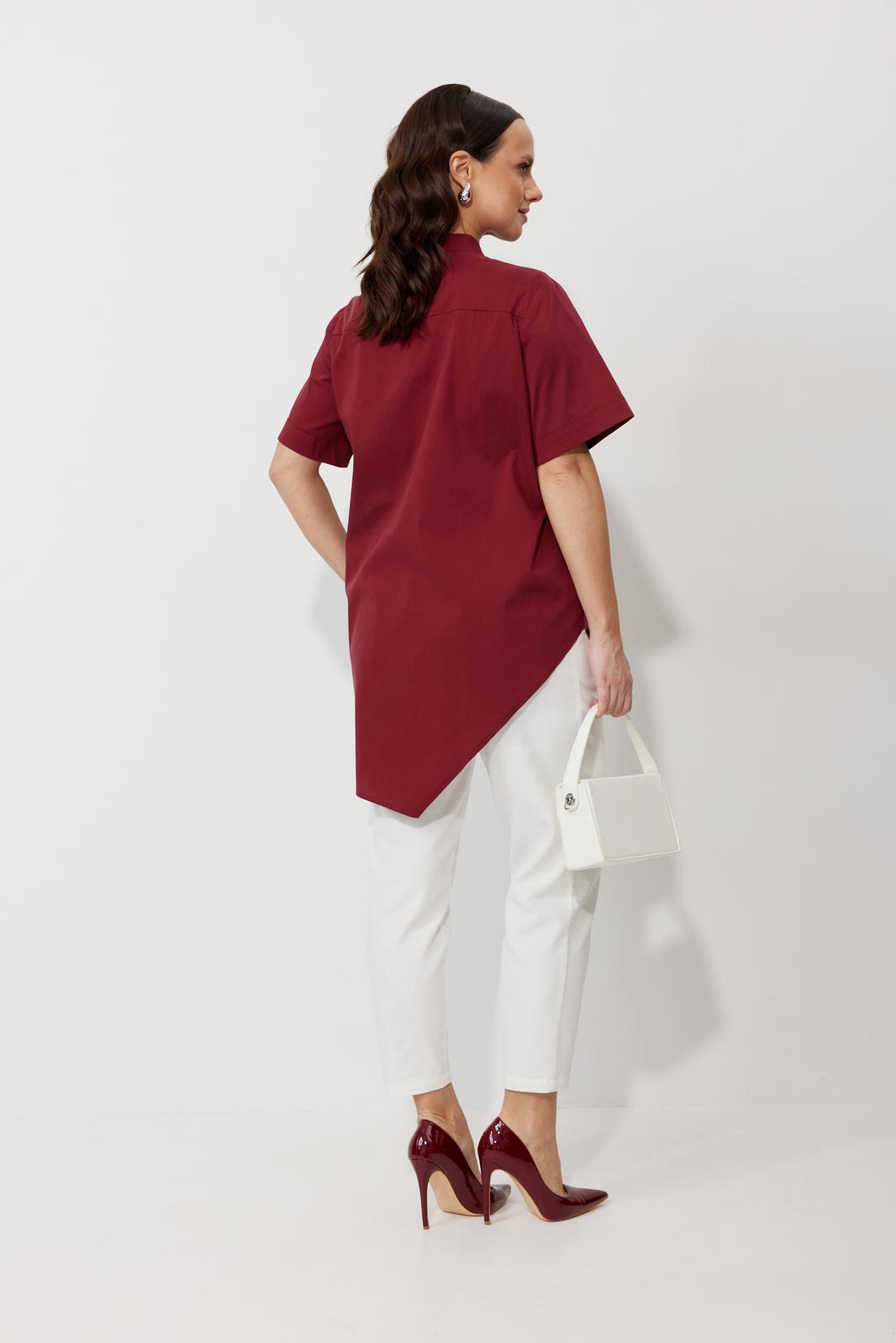 Блуза свободного силуэта, выполненная из рубашечной ткани на хлопковой основе (тянется). По переду ассиметричная застежка на петли-пуговицы. По спинке отрезная кокетка. Низ блузы ассиметричный, разноуровневый по длине. Горловина оформлена воротником-стойкой. Рукав втачной, одношовный с манжетой.