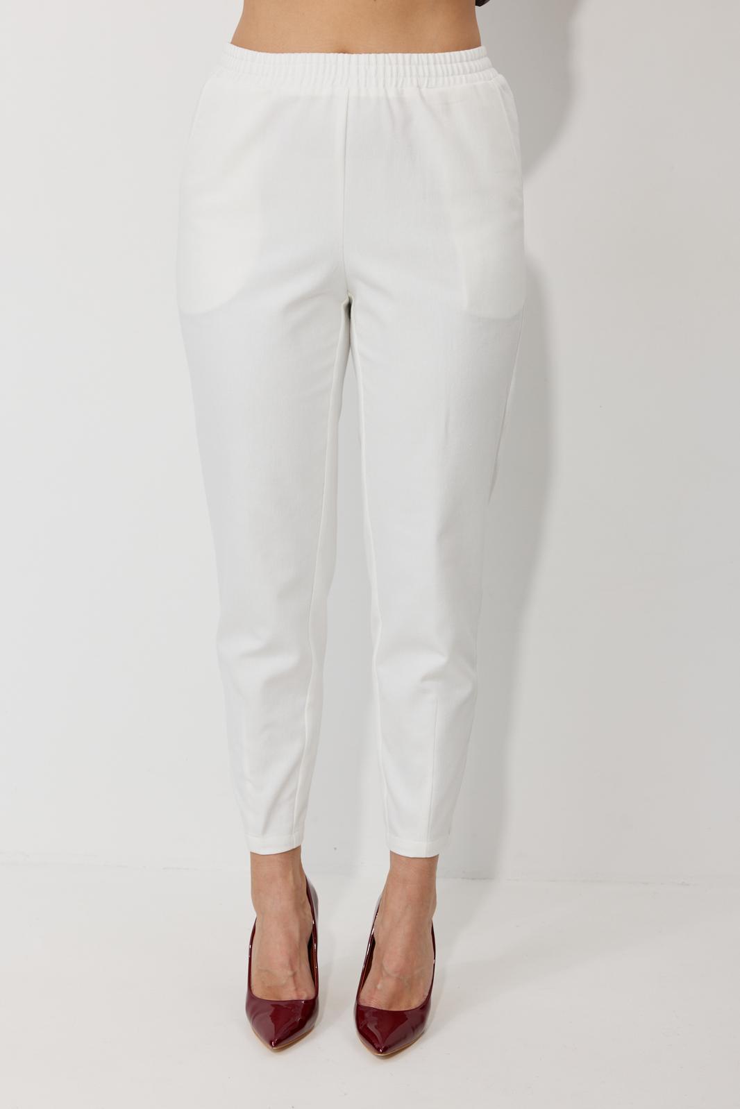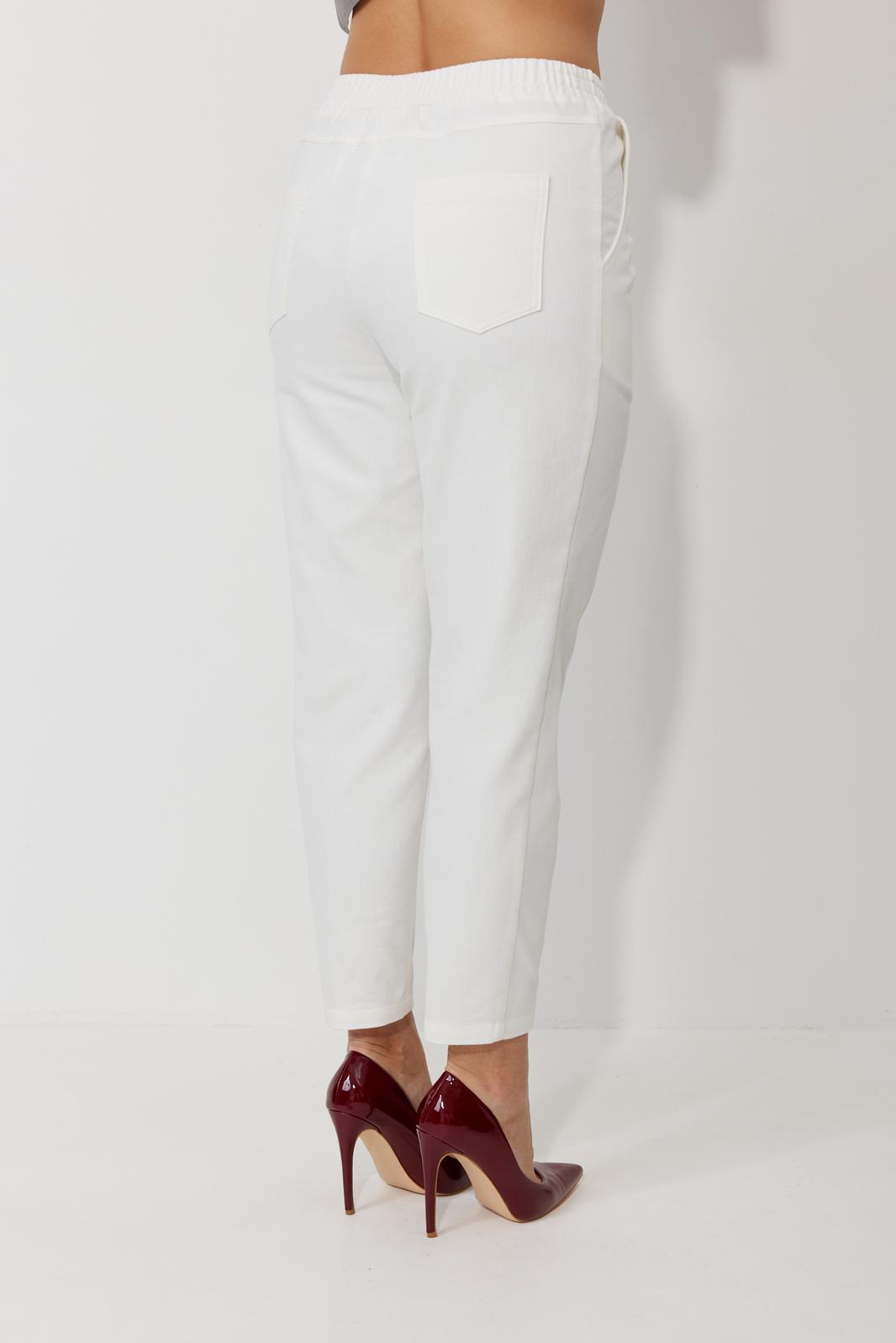 Брюки зауженные к низу с высокой посадкой, выполнены из джинсовой ткани (тянется). Верхний срез оформлен поясом с эластичной резинкой. Низ брюк с застроченными вытачками. В боковых швах наклонные карманы. По задним половинкам брюк – отрезные кокетки и накладные карманы.