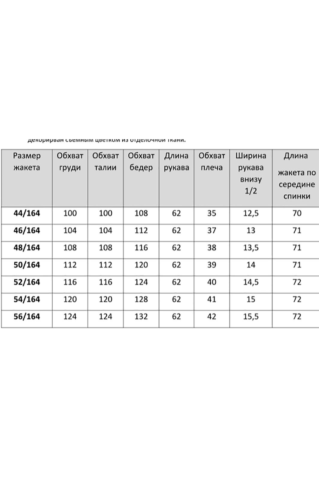 Жакет прямого кроя на подкладке. По переду нагрудные вытачки, функциональные карманы с листочкой, центральная двубортная застежка на петли-пуговицы. Горловина оформлена воротником пиджачного типа с лацканом. Спинка со средним швом, шлицей-планкой из отделочной ткани, застегивающейся на петли-пуговицы. Рукава втачные, двухшовные. Жакет декорирван съемным цветком из отделочной ткани.