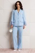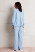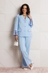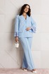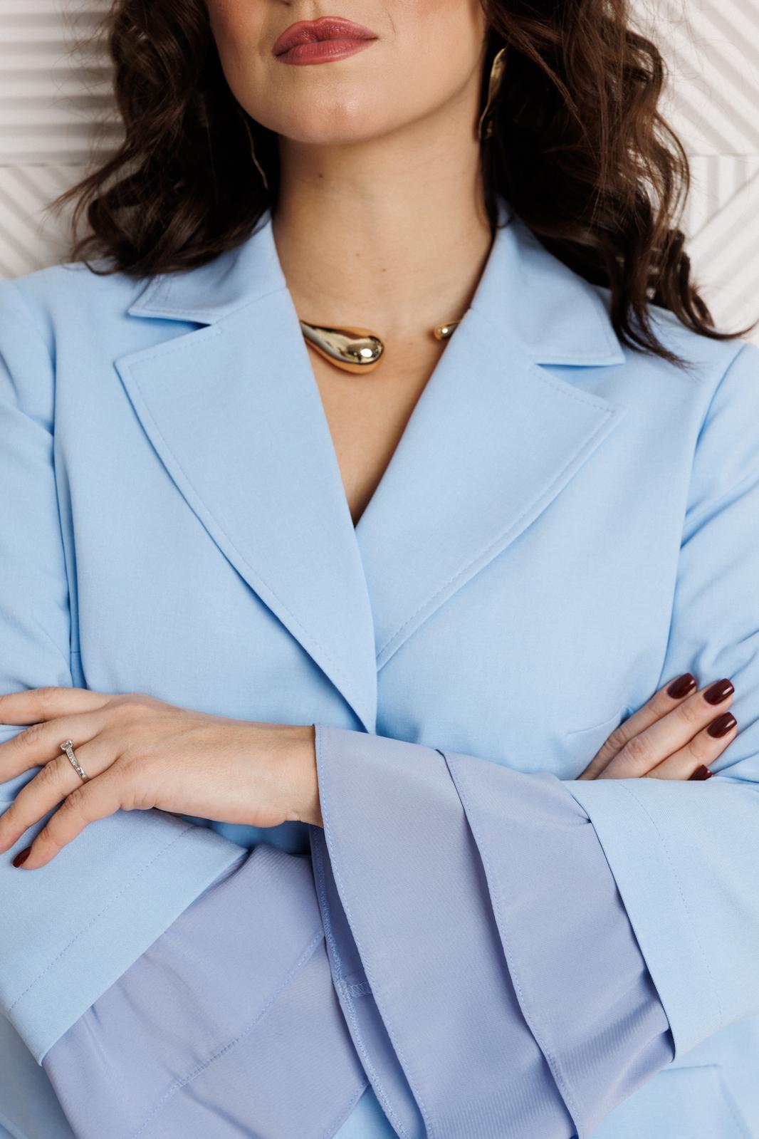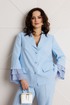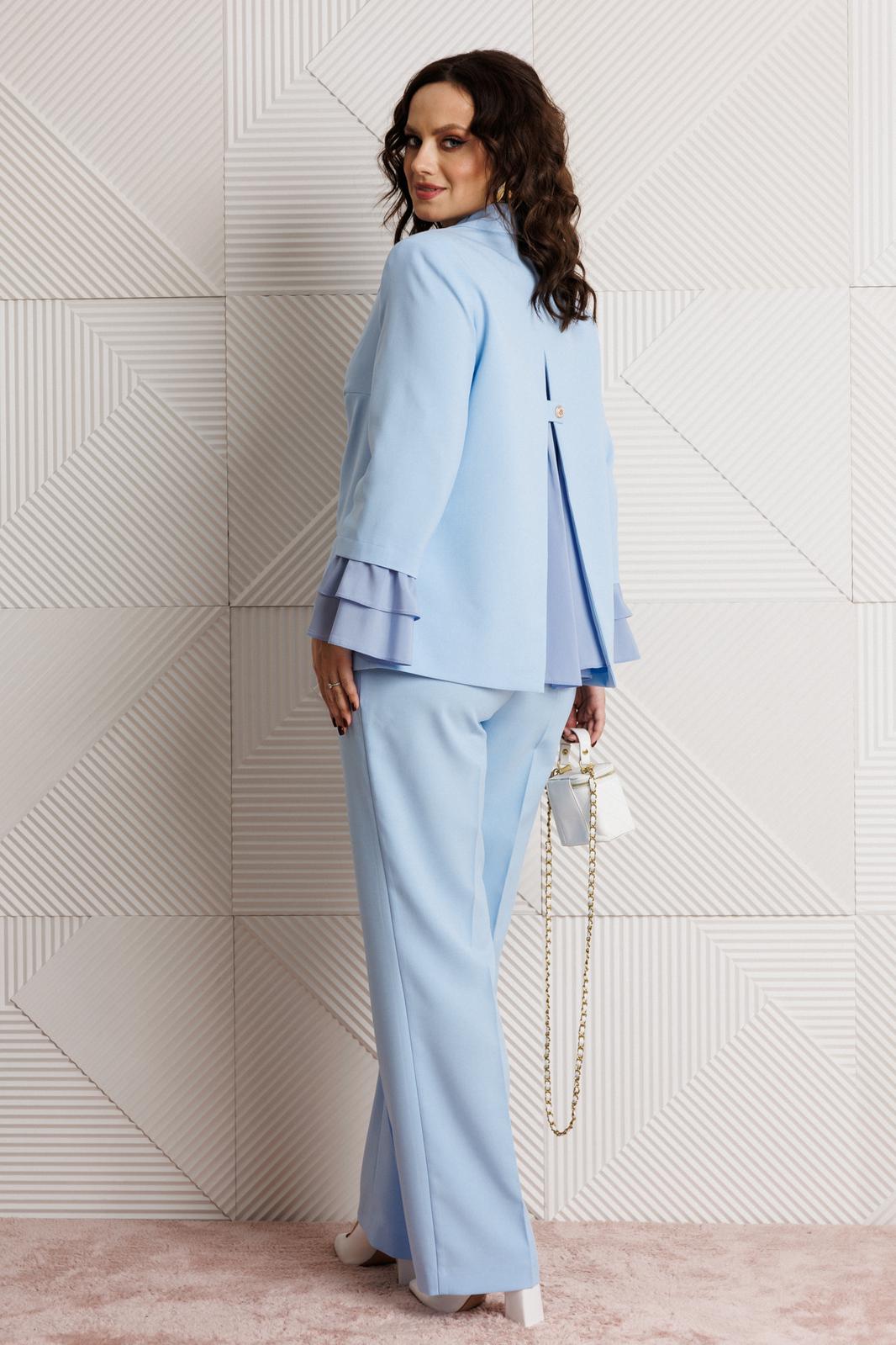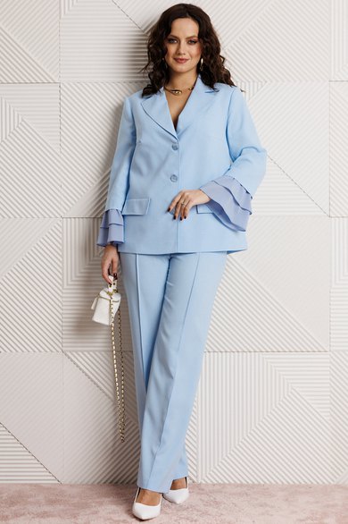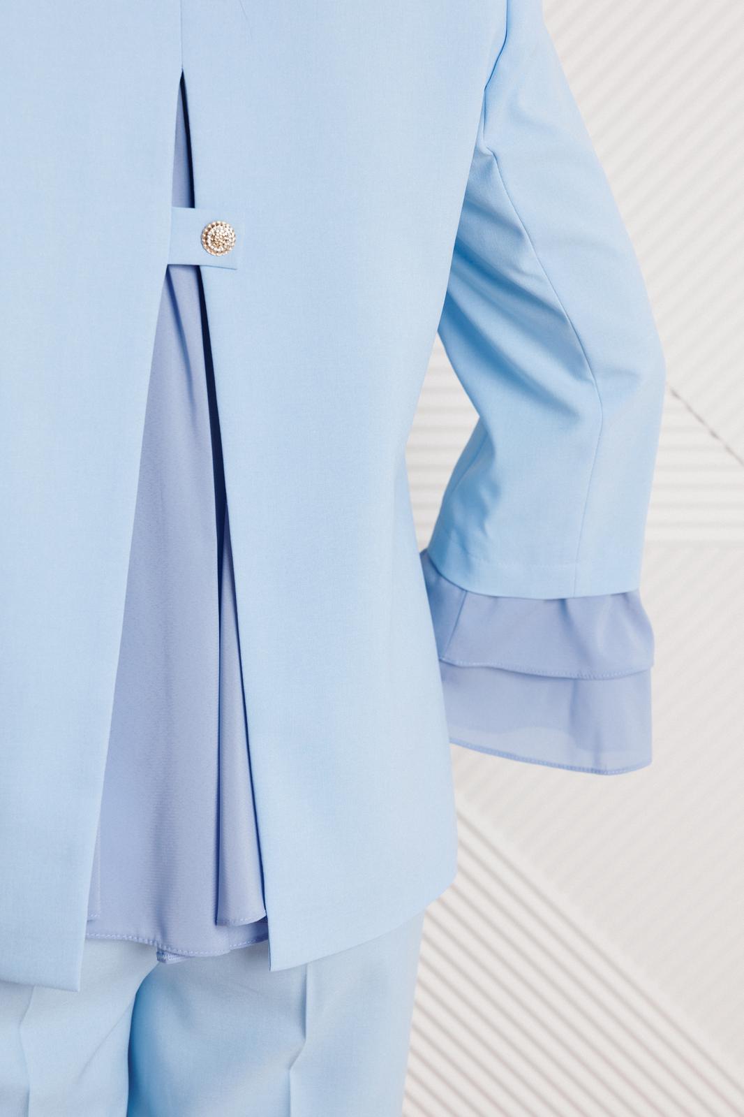 Жакет прямого силуэта с нагрудными вытачками по переду. Накладные клапаны, являются имитацией кармана. По горловине воротник с отложными бортами пиджачного типа. Застежка на три петли-пуговицы. По спинке центральный разрез эффектно оформлен декоративной вставкой из струящегося шифона, который дополняет отделочная пуговица (не функциональная при застегивании). Рукав втачной, двухшовный, длина 7/8. По низу рукава два притачных волана из шифоновой ткани. Жакет на подкладке.