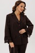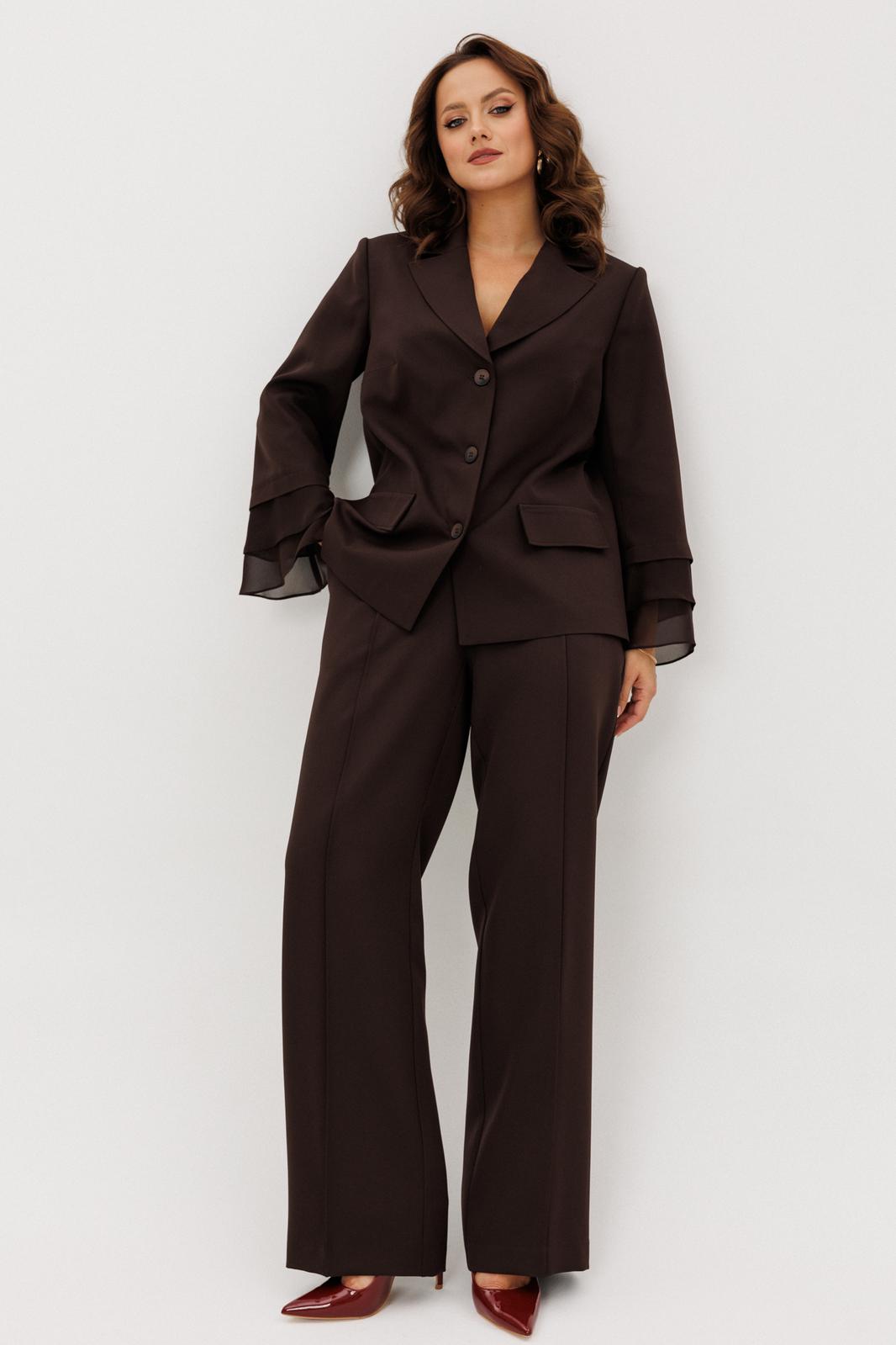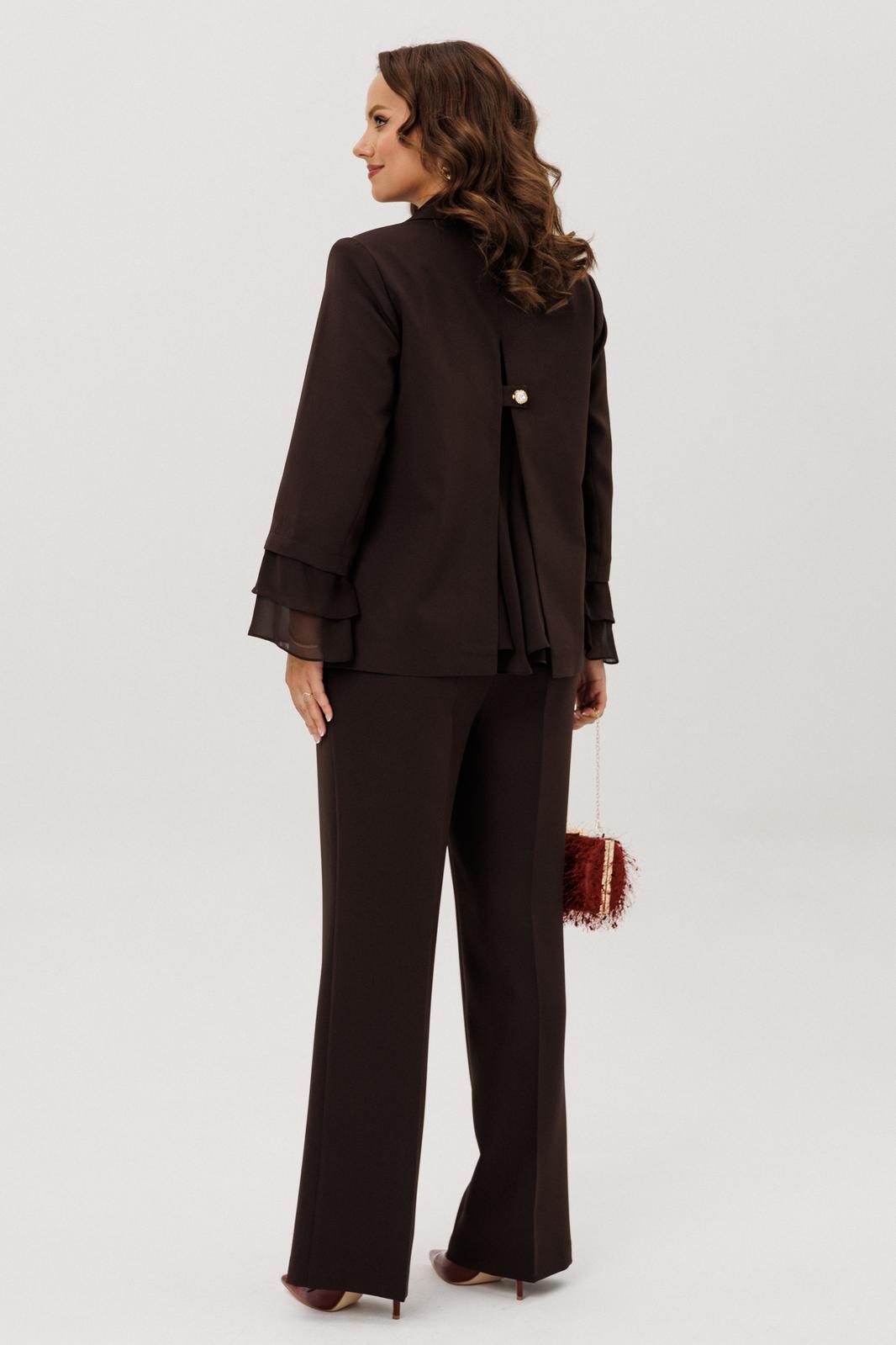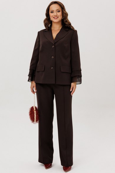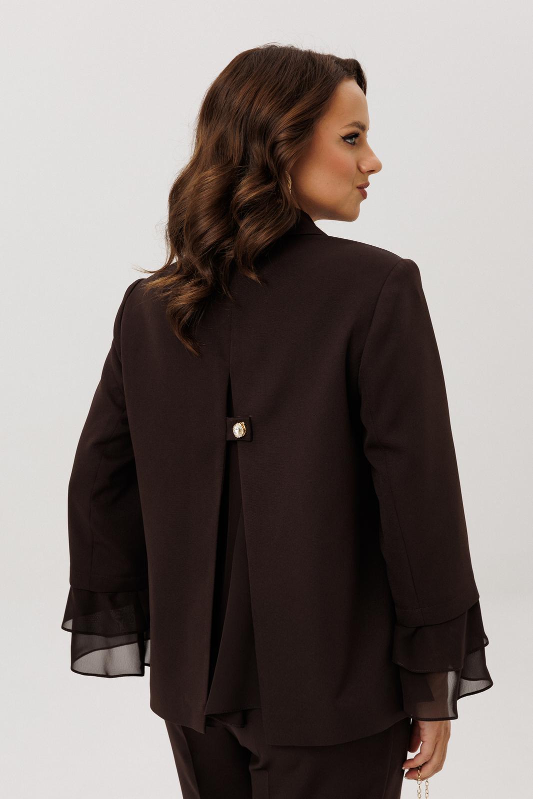 Жакет прямого силуэта с нагрудными вытачками по переду. Накладные клапаны, являются имитацией кармана. По горловине воротник с отложными бортами пиджачного типа. Застежка на три петли-пуговицы. По спинке центральный разрез эффектно оформлен декоративной вставкой из струящегося шифона, который дополняет отделочная пуговица (не функциональная при застегивании). Рукав втачной, двухшовный, длина 7/8. По низу рукава два притачных волана из шифоновой ткани. Жакет на подкладке.