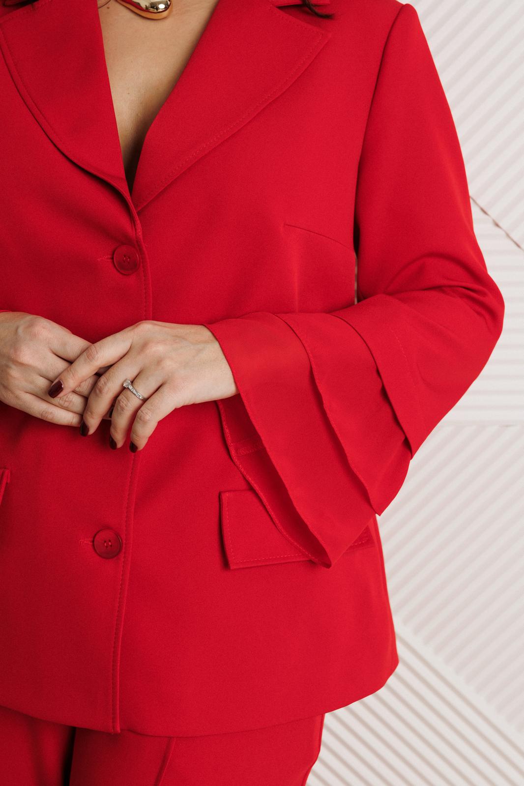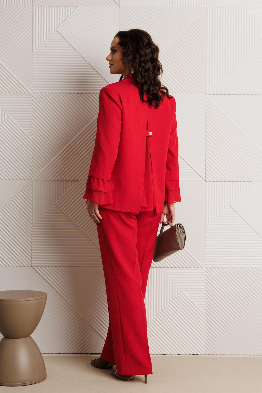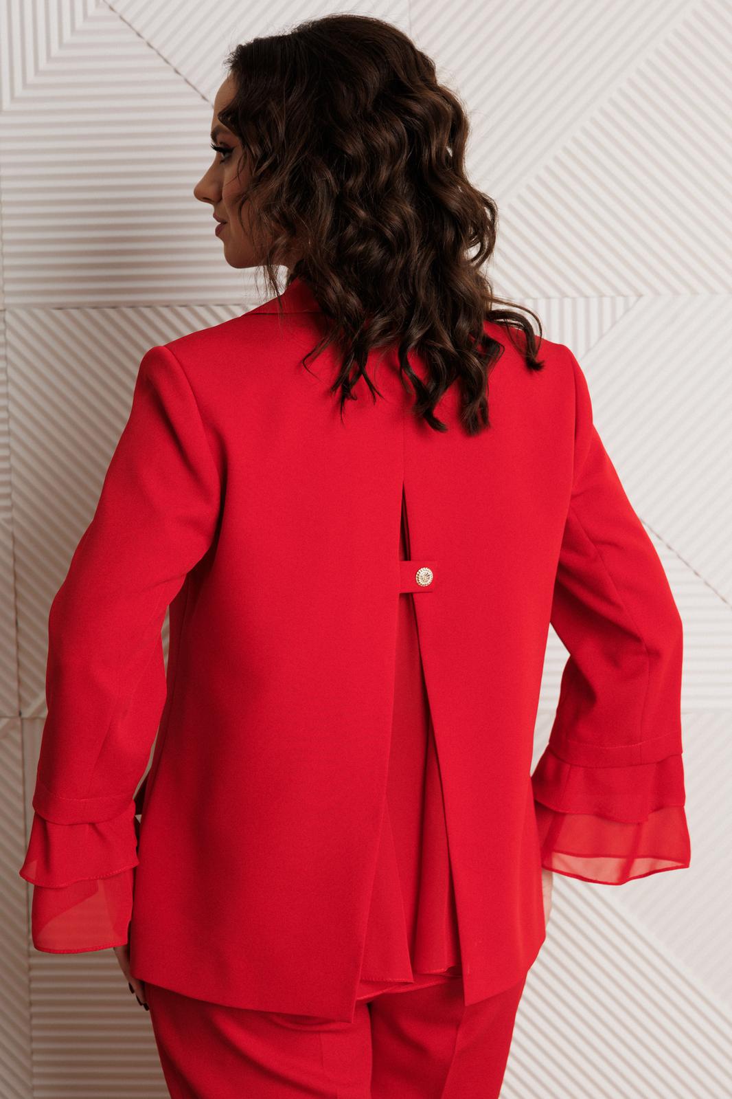 Жакет прямого силуэта с нагрудными вытачками по переду. Накладные клапаны, являются имитацией кармана. По горловине воротник с отложными бортами пиджачного типа. Застежка на три петли-пуговицы. По спинке центральный разрез эффектно оформлен декоративной вставкой из струящегося шифона, который дополняет отделочная пуговица (не функциональная при застегивании). Рукав втачной, двухшовный, длина 7/8. По низу рукава два притачных волана из шифоновой ткани. Жакет на подкладке.