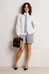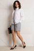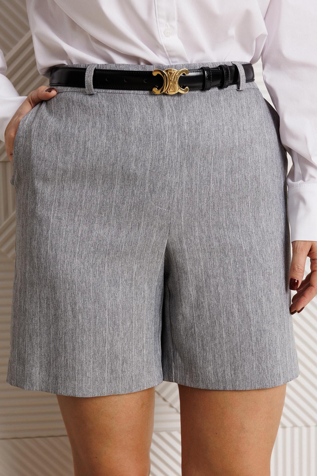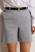 Шорты прямого кроя с высокой посадкой, выполнены из костюмной ткани в полоску (чуть тянется). В боковых швах наклонные карманы. По срезу банта – застежка-молния. Верхний срез оформлен поясом с эластичной резинкой по задней половинке. По поясу –шлевки.