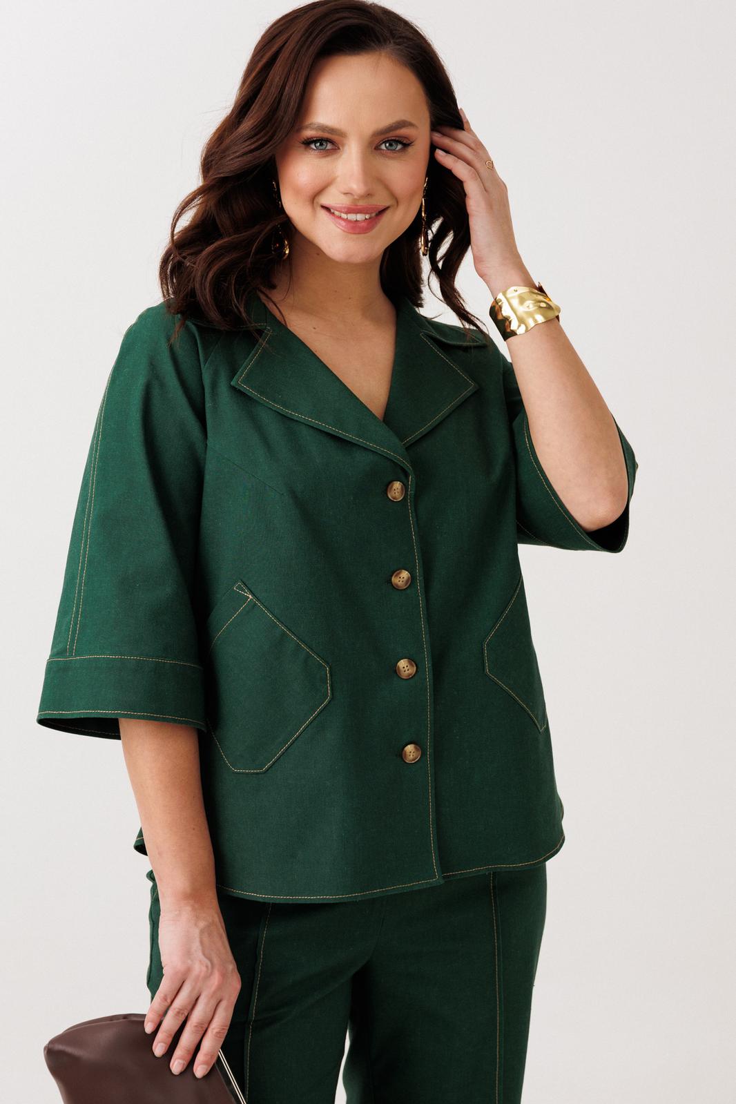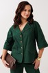 Жакет прямого силуэта без подкладки. По переду нагрудные вытачки, накладные карманы, центральная застежка на петли-пуговицы. По спинке встречная складка, застроченная до уровня лопаток. Горловина оформлена воротником пиджачного типа с лацканом. Рукава покроя реглан с притачными манжетами.