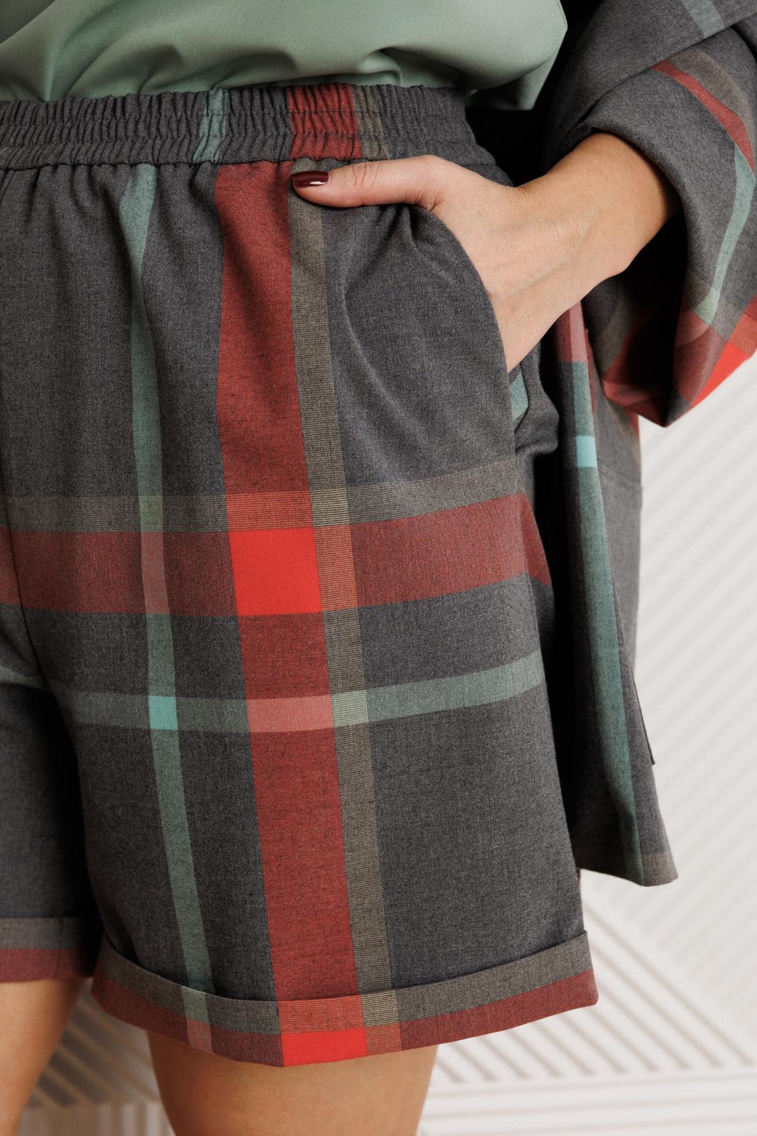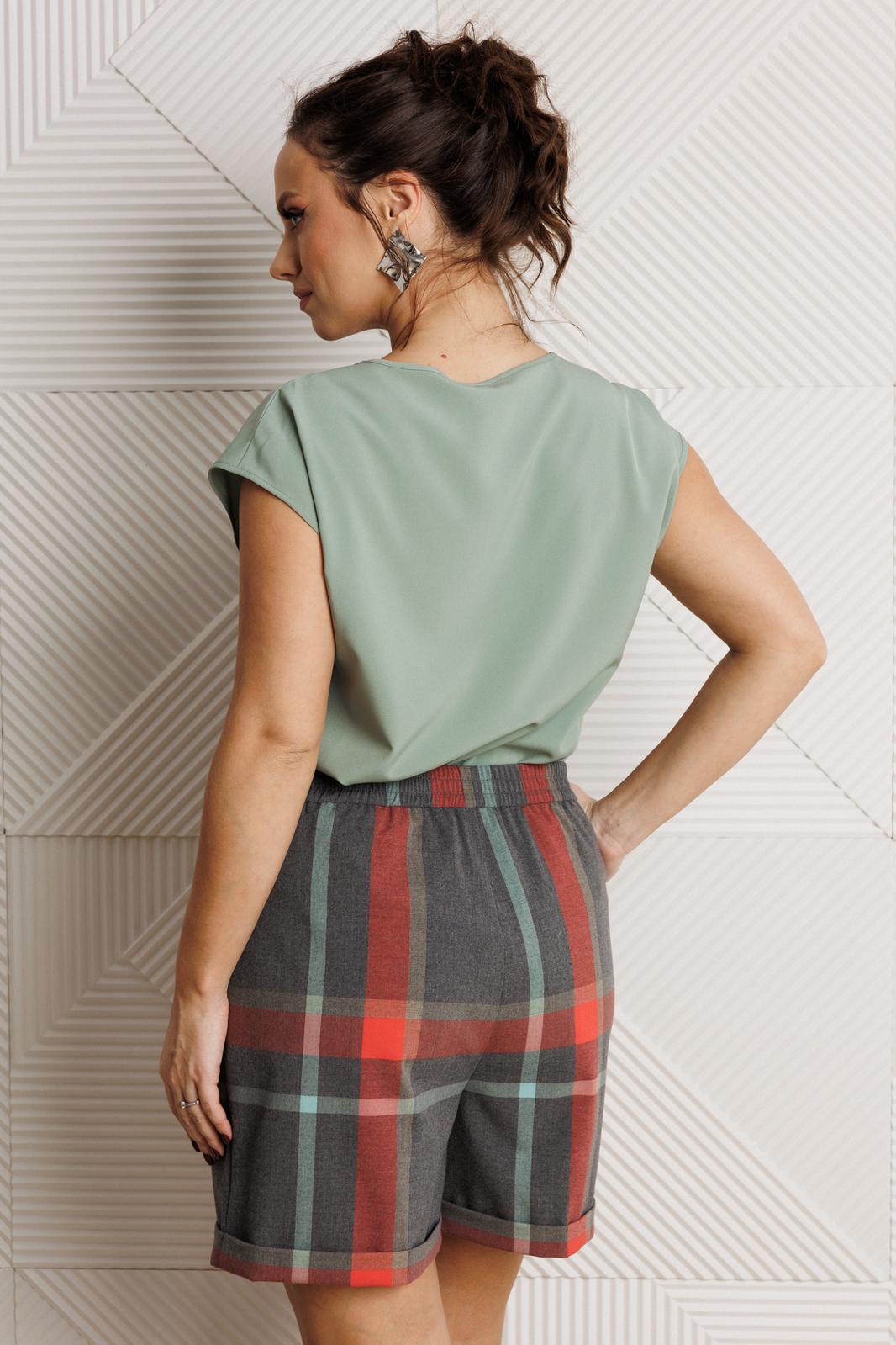 Шорты прямого кроя с высокой посадкой, с отложными манжетами по линии низа, выполнены из костюмной ткани (не тянется). В боковых швах наклонные карманы. Верхний срез оформлен поясом с эластичной резинкой.